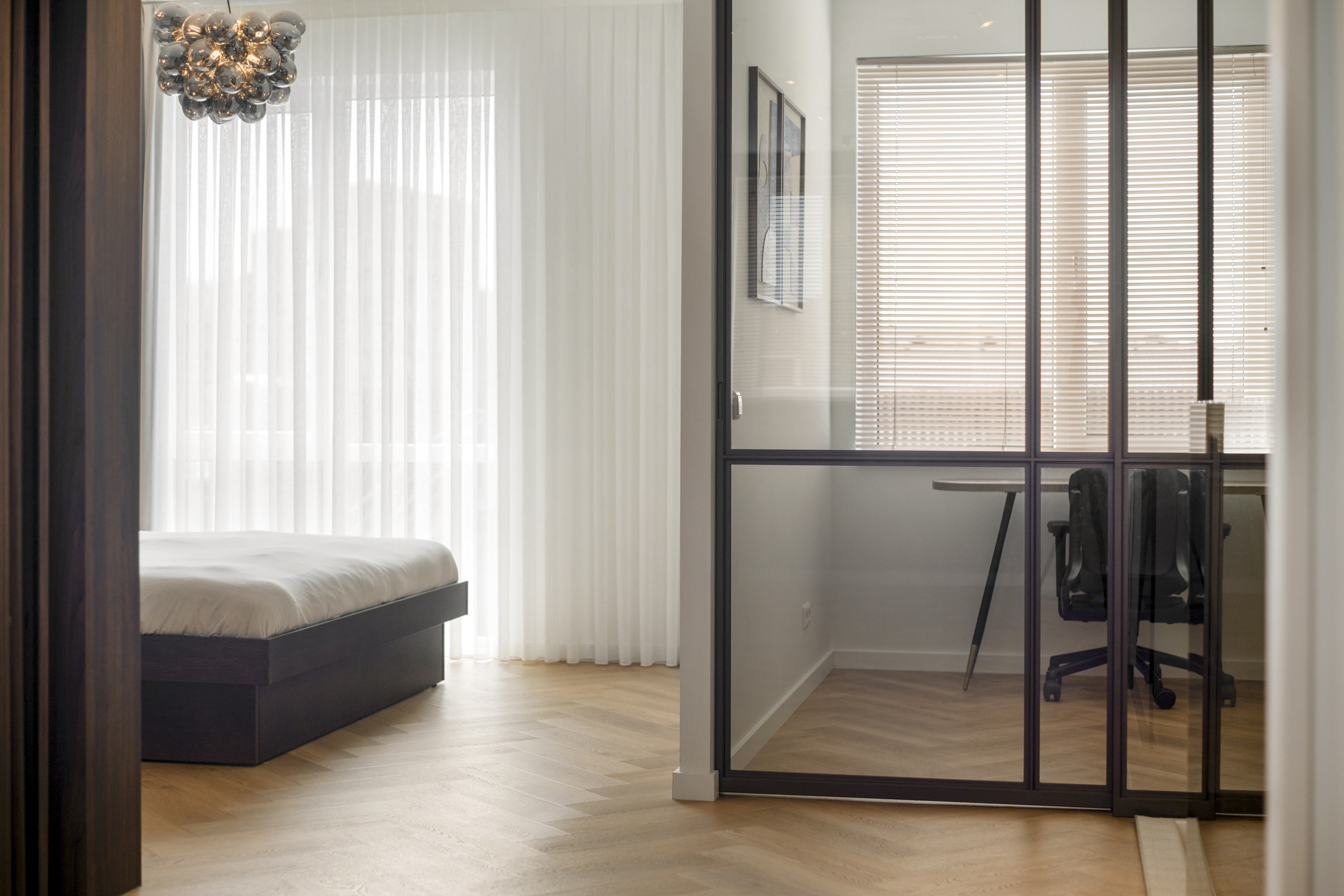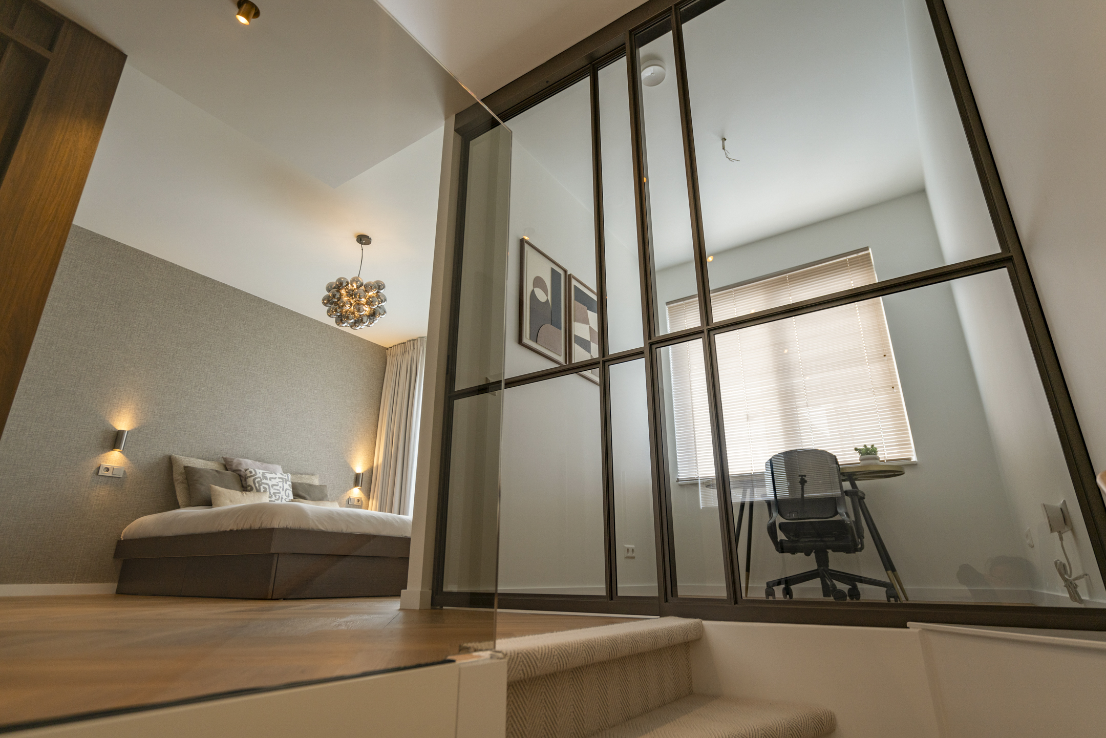 De tweede verdieping is een royale open ruimte (hotelsuite voor de ouders) met een door een glazen Stalen schuifdeur van De Rooy (Frits Jurgens soft close systeem) afsluitbare werkkamer. Deze verdieping kunt u nog naar eigen wens indelen: een extra slaapkamer of een hobbyruimte. Dankzij de voorbereide aansluitpunten voor een pantry en databekabeling voor een geluidsinstallatie is alles aanwezig voor de toekomst. Ook deze verdieping beschikt over een ingebouwde Daikin airconditioning. De ingebouwde maatwerkkasten geven tevens toegang tot de technische ruimte en de verborgen badkamer. Hier vind je een luxe maatwerk marmeren dubbele wastafel, badmeubel van massief Amerikaans notenhout, verlichte en verwarmde spiegels, zwevende rookglas douchewand en inbouwkranen en regendouche van Blaufoss (7 jaar garantie) en een Japans douchetoilet.