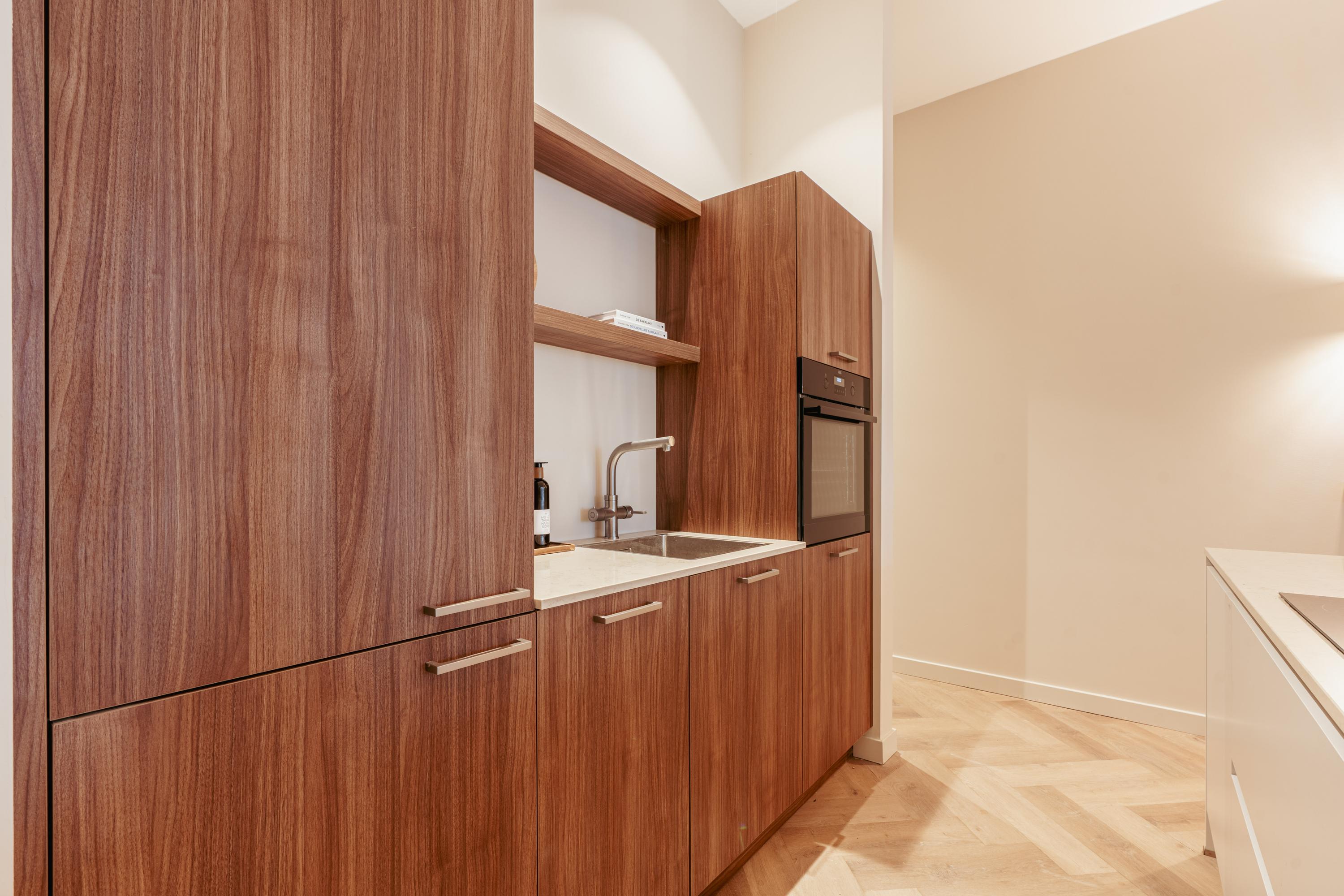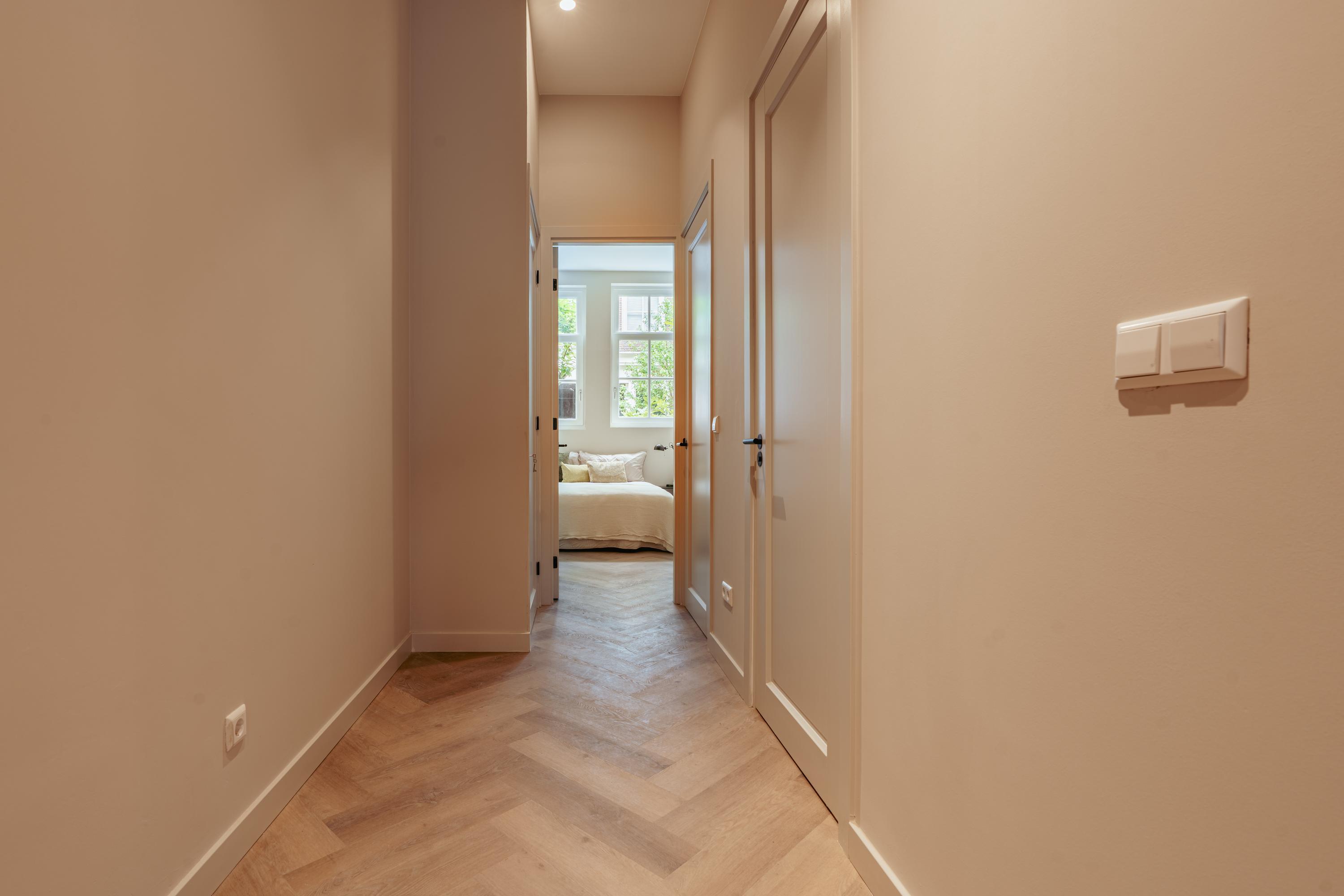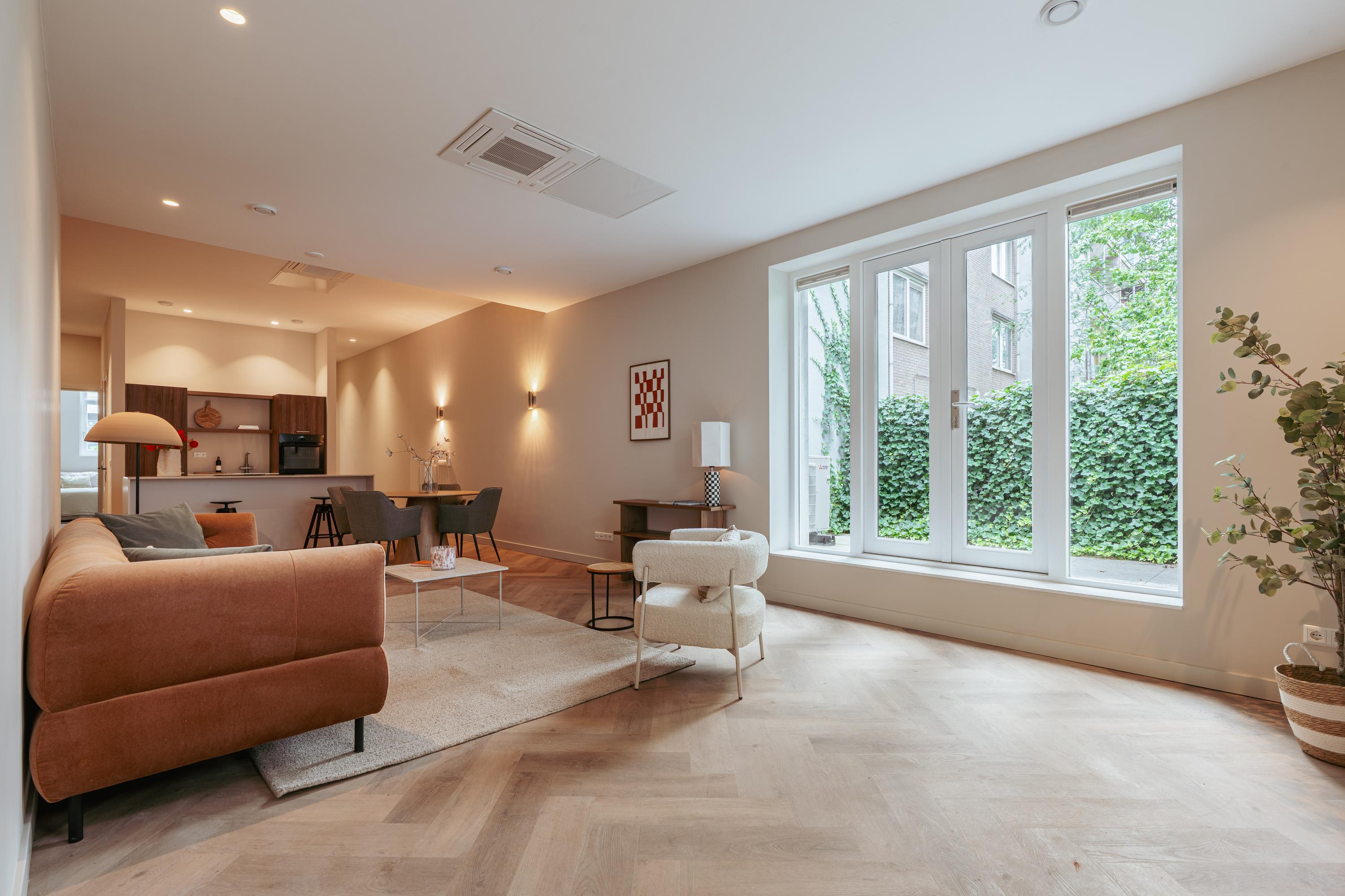 Via een privé steeg bereikt u de eigen voordeur van het appartement. In de entree is ruimte voor een royale garderobekast. Bij binnenkomst vallen direct de plafondhoogte en de royale diepte van het pand op, net als de dubbele deuren naar de tuin op het noordwesten – een fijne buitenruimte van circa 12 m², perfect voor een borrel in de namiddagzon. De woning is met gevoel voor stijl en functionaliteit ingedeeld en hoogwaardig afgewerkt. Denk aan een prachtige vloer, strak stucwerk en airconditioning. De riante woonkeuken is het hart van de woning, met een fraai kookeiland voorzien van alle moderne inbouwapparatuur. Aan de voorzijde bevinden zich twee ruime slaapkamers, slim gescheiden van het leefgedeelte voor extra rust en privacy. Daartussen ligt een stijlvolle badkamer met inloopdouche en tweede toilet. Daarnaast zijn er een aparte wasruimte én een extra gastentoilet. Alles is tot in detail verzorgd, met oog voor luxe en comfort.