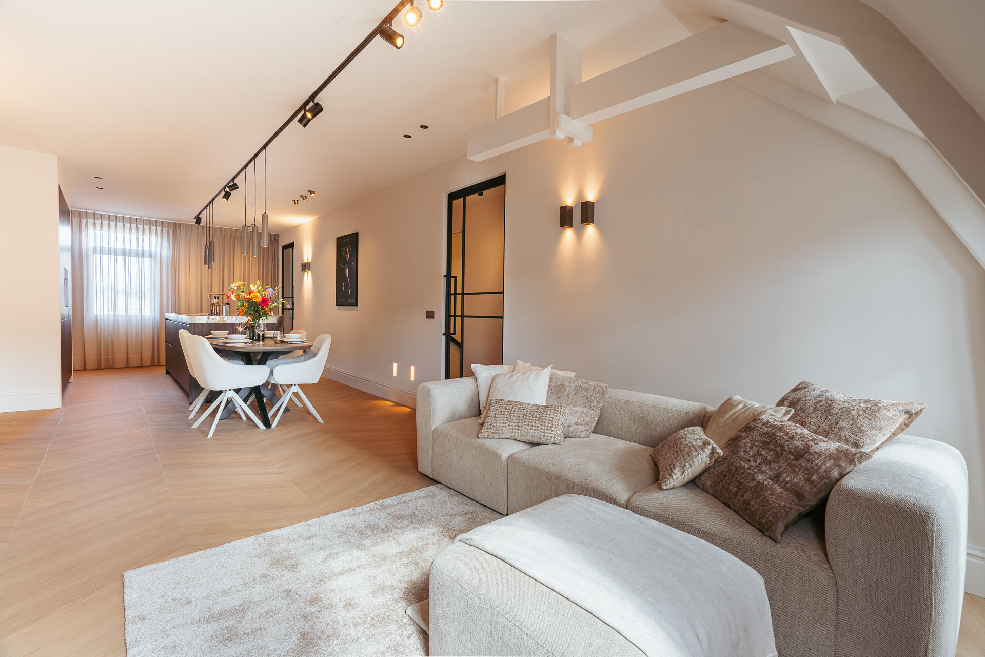 Via het gemeenschappelijke trappenhuis bereikt u de entree van de woning op de derde verdieping. Vanuit uw eigen entree leidt een nette, gerenoveerde trapopgang naar het appartement op de vierde verdieping. Bij binnenkomst valt direct de warme en stijlvolle sfeer op, mede dankzij de zorgvuldig gekozen materialen, sfeervolle verlichting en de prachtige afwerking. Het appartement is hoogwaardig en luxe gerenoveerd, waarbij veel aandacht is besteed aan details. De moderne zwarte stalen deuren in combinatie met klassieke details geven het geheel een eigentijdse uitstraling, iets wat u door het hele appartement terugziet.