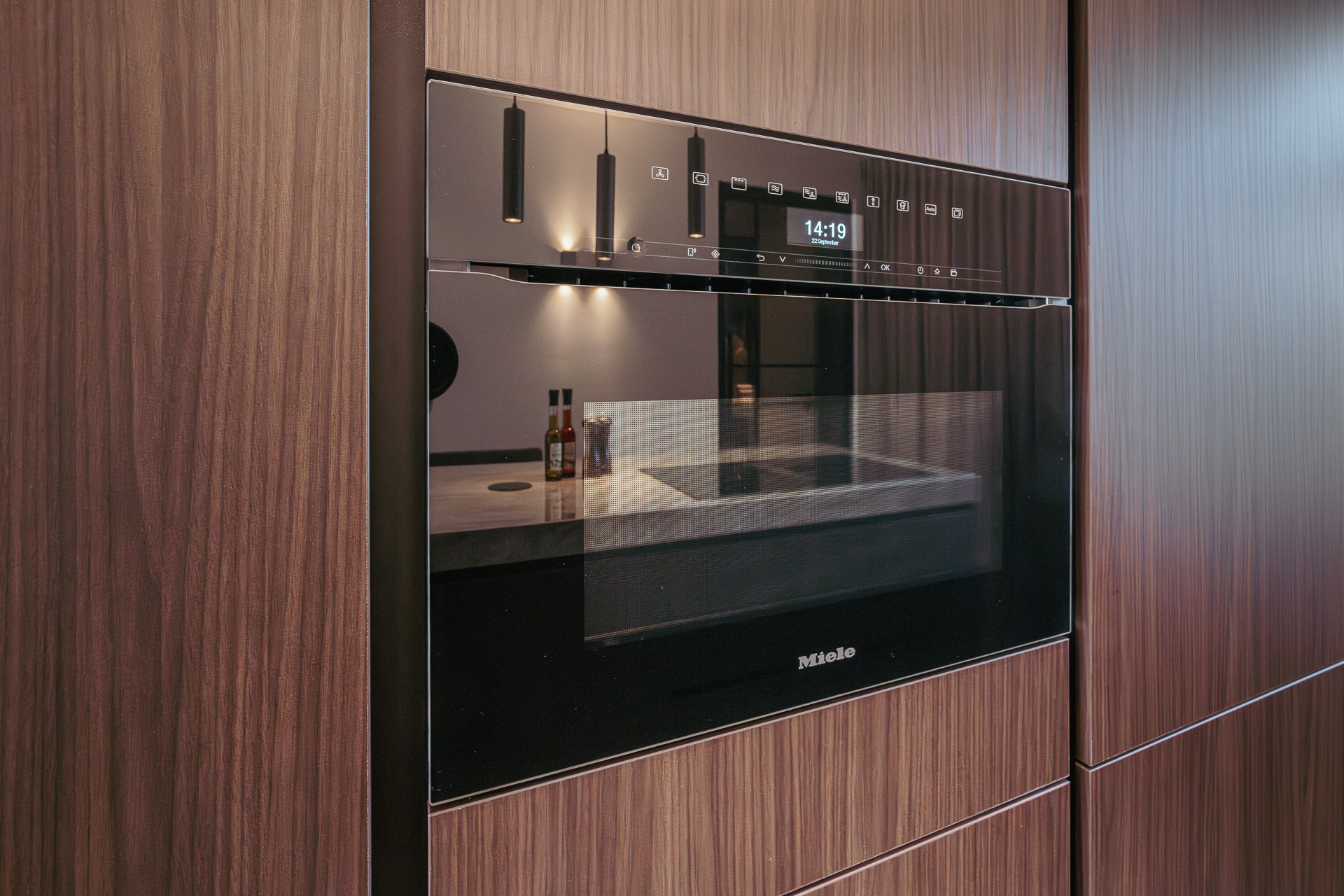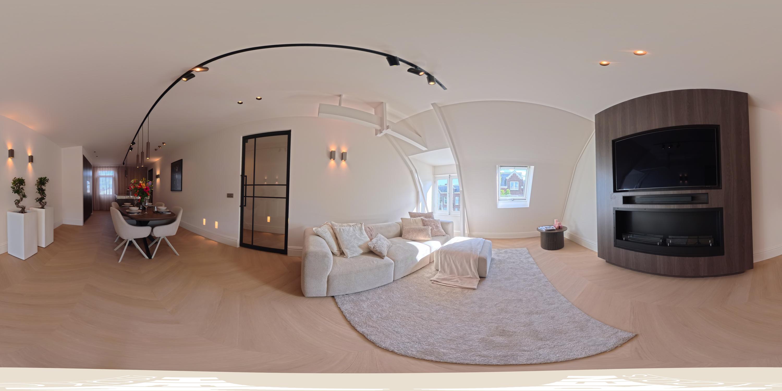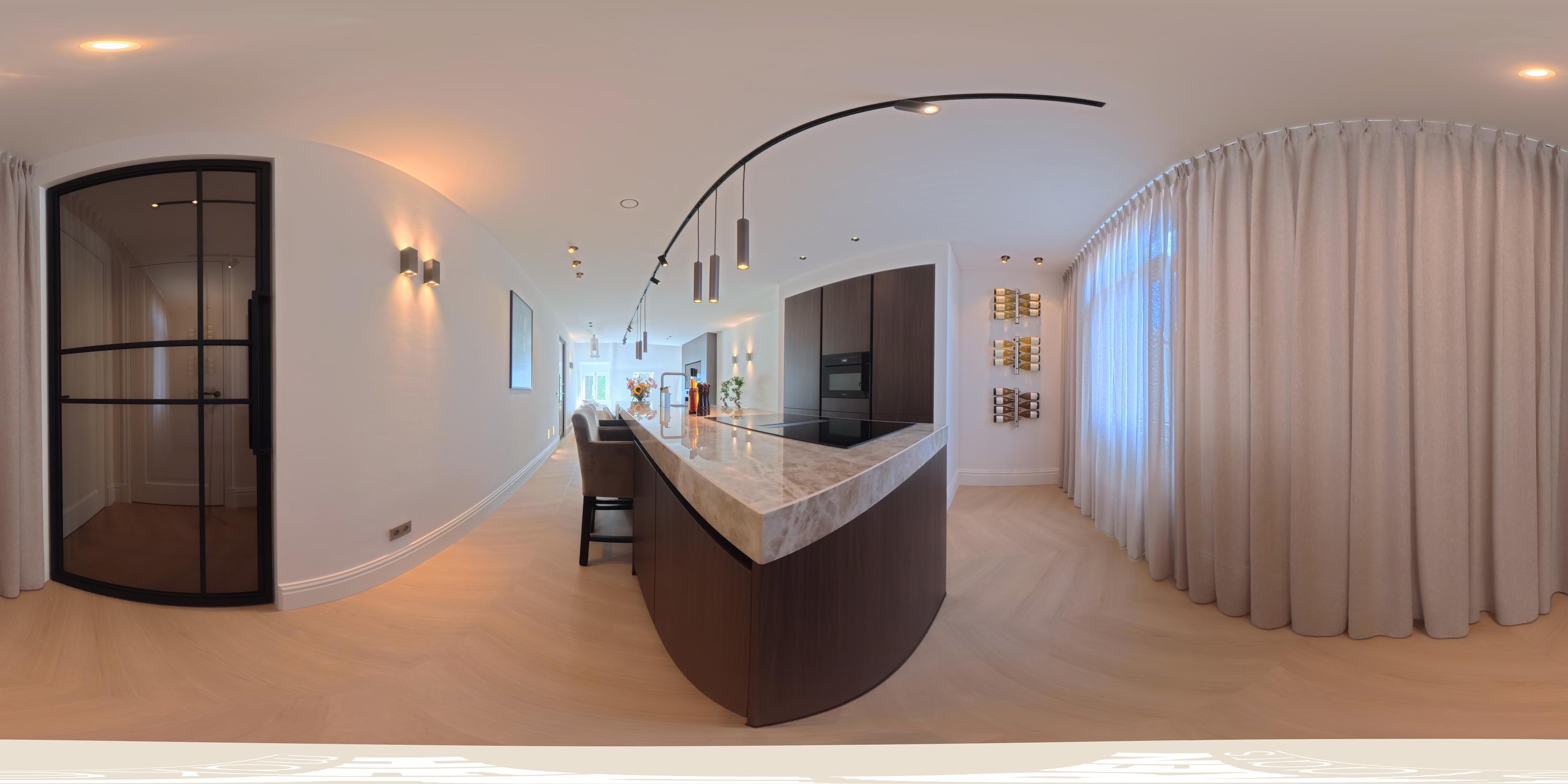 U komt op de bovenste etage binnen via de geïntegreerde schuifdeur in een prachtige, ruime, lange hal die toegang biedt tot alle vertrekken. Het hart van de woning wordt gevormd door de woon- eetkeuken, die zich uitstrekt over de volledige lengte van het appartement. Dankzij ramen aan beide zijden geniet de ruimte van veel natuurlijk licht. Aan de voorzijde bevindt zich de zithoek met een sfeervolle bio-ethanol haard, stijlvol geïntegreerd in een ingebouwde kast met tv. Aan de achterzijde ligt de moderne open keuken met kookeiland. De keuken is voorzien van een Dekton werkblad en bevat daarnaast alle denkbare luxe inbouwapparatuur, waaronder een wijnkoeler, Quooker, vaatwasser, koelkast/vriezer, Miele combi-oven en een Miele inductie kookplaat met geïntegreerd afzuigsysteem. Het bargedeelte maakt de keuken bovendien tot een gezellige plek om samen te koken of een glas wijn te drinken met familie en vrienden.