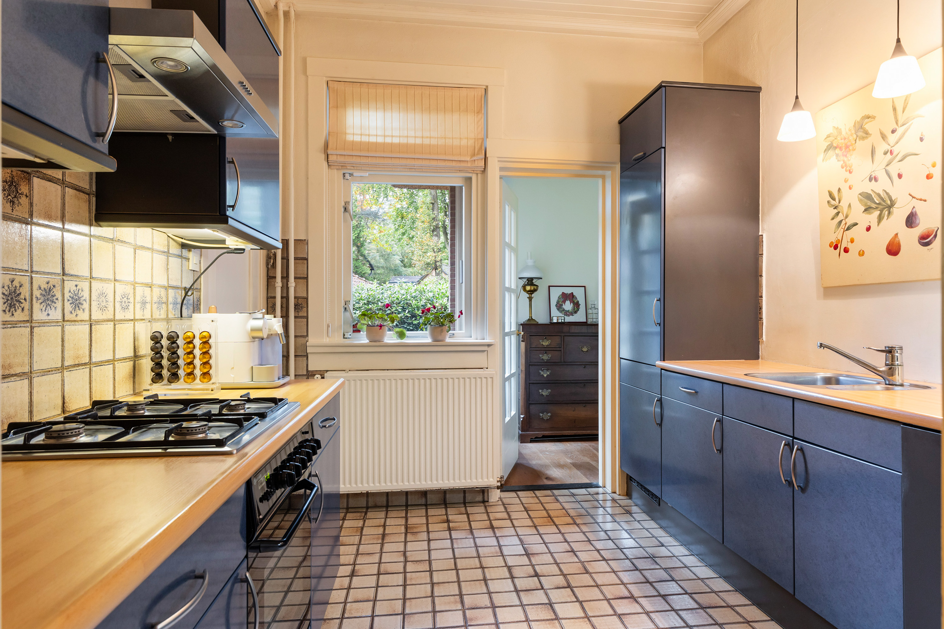 Aangrenzend bevindt zich de bijkeuken, betegeld en voorzien van aansluitingen voor wasmachine en droger. Hier hangt tevens de Nefit HR-ketel, en is extra bergruimte voor voorraad of huishoudelijke apparatuur aanwezig. Via de bijkeuken is er een deur naar buiten.