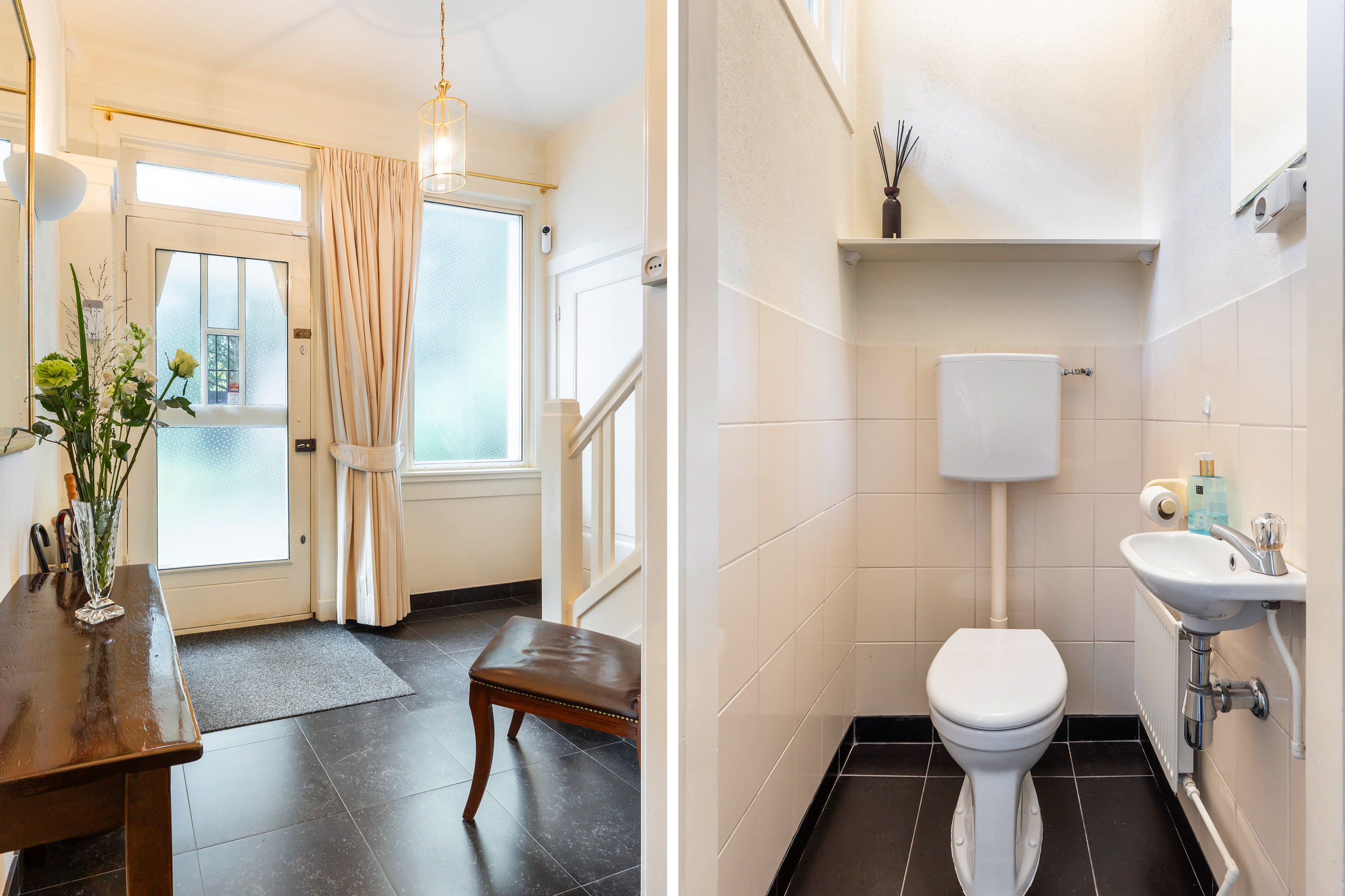 De entree vormt een sfeervolle binnenkomst met vloertegels en elektrische vloerverwarming. Aan de linkerzijde bevindt zich het toilet, betegeld in een lichte tint en voorzien van een raam met ventilatie, fontein en verwarming. Vanuit de hal is via een houten trap de betegelde kelder bereikbaar, die fungeert als garderobe- en voorraadruimte.