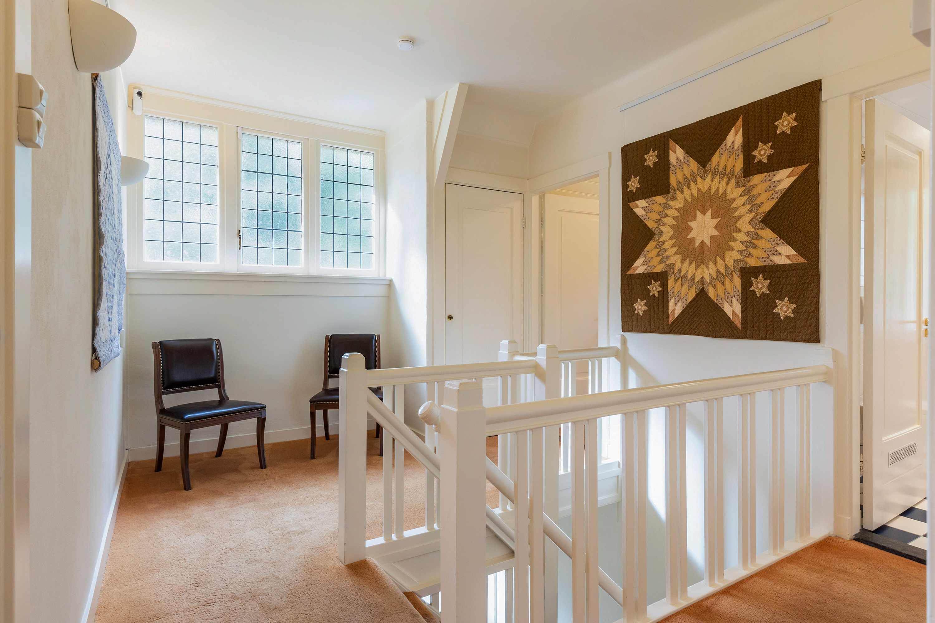 Via de trap in de centrale entree bereikt u de overloop, waar een driedelig glas-in-loodraam voor een sfeervol lichtspel zorgt.