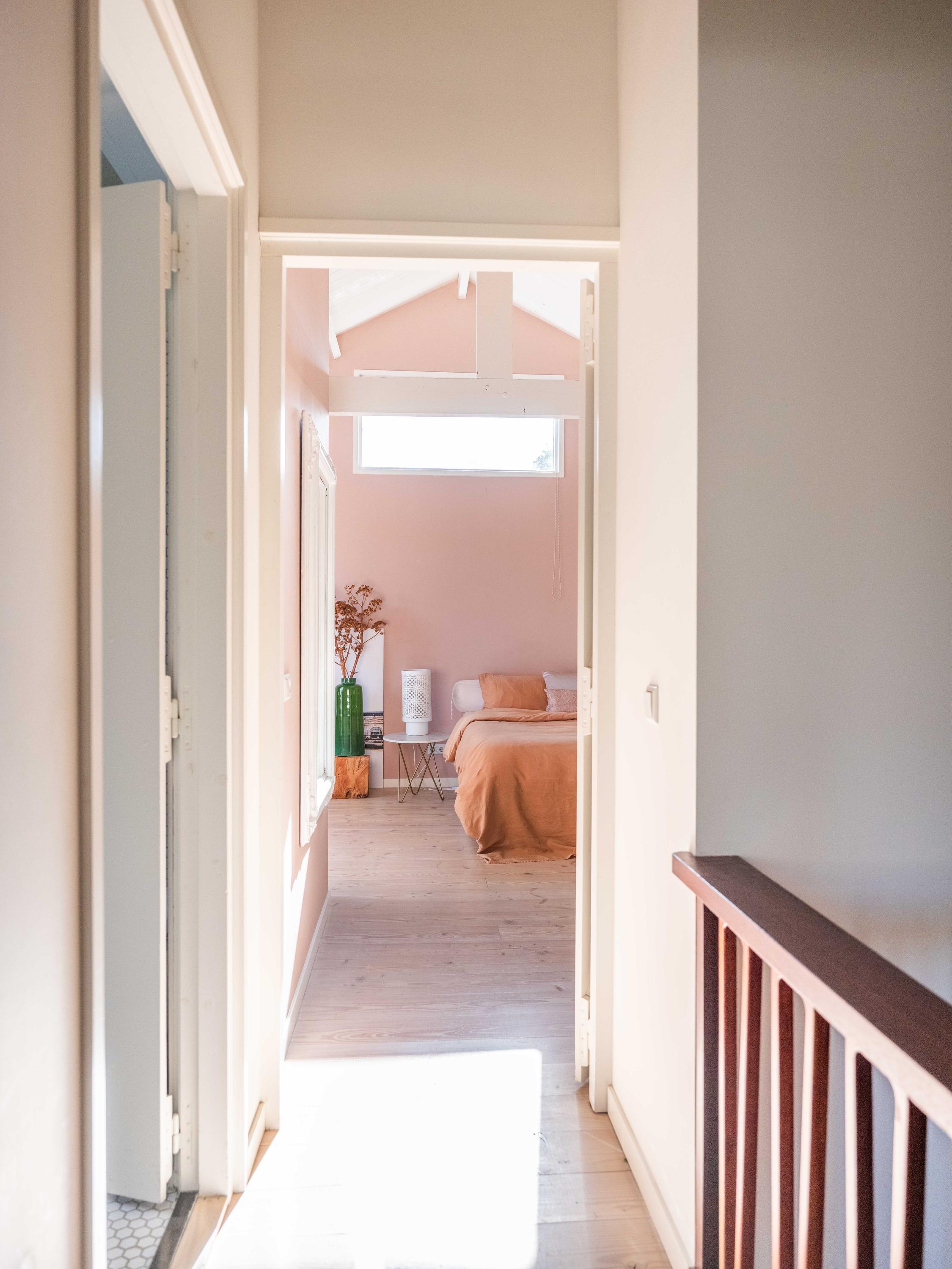 De bovenverdieping beschikt over een ruime overloop met veel hoogte en knieschotten voor extra bergruimte. Er is een royale master bedroom met openslaande deuren naar buiten, een luxe badkamer met dubbele wastafel, inloopdouche, toilet, ligbad en vloerverwarming, een kamer in gebruik als inloopkast en nog twee slaapkamers. Deze zijn opgedeeld door een schuifdeur en beide voorzien van een vide.