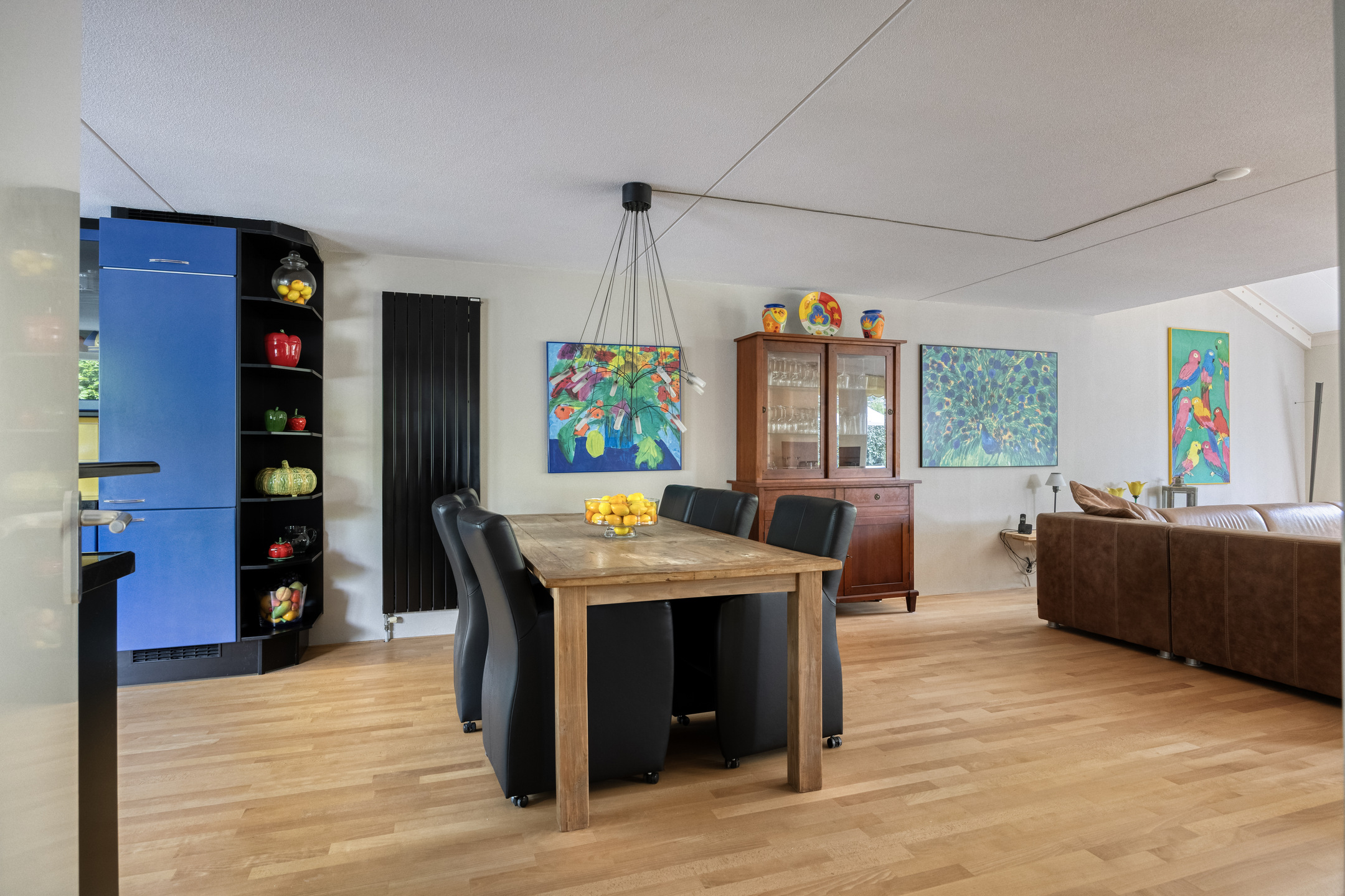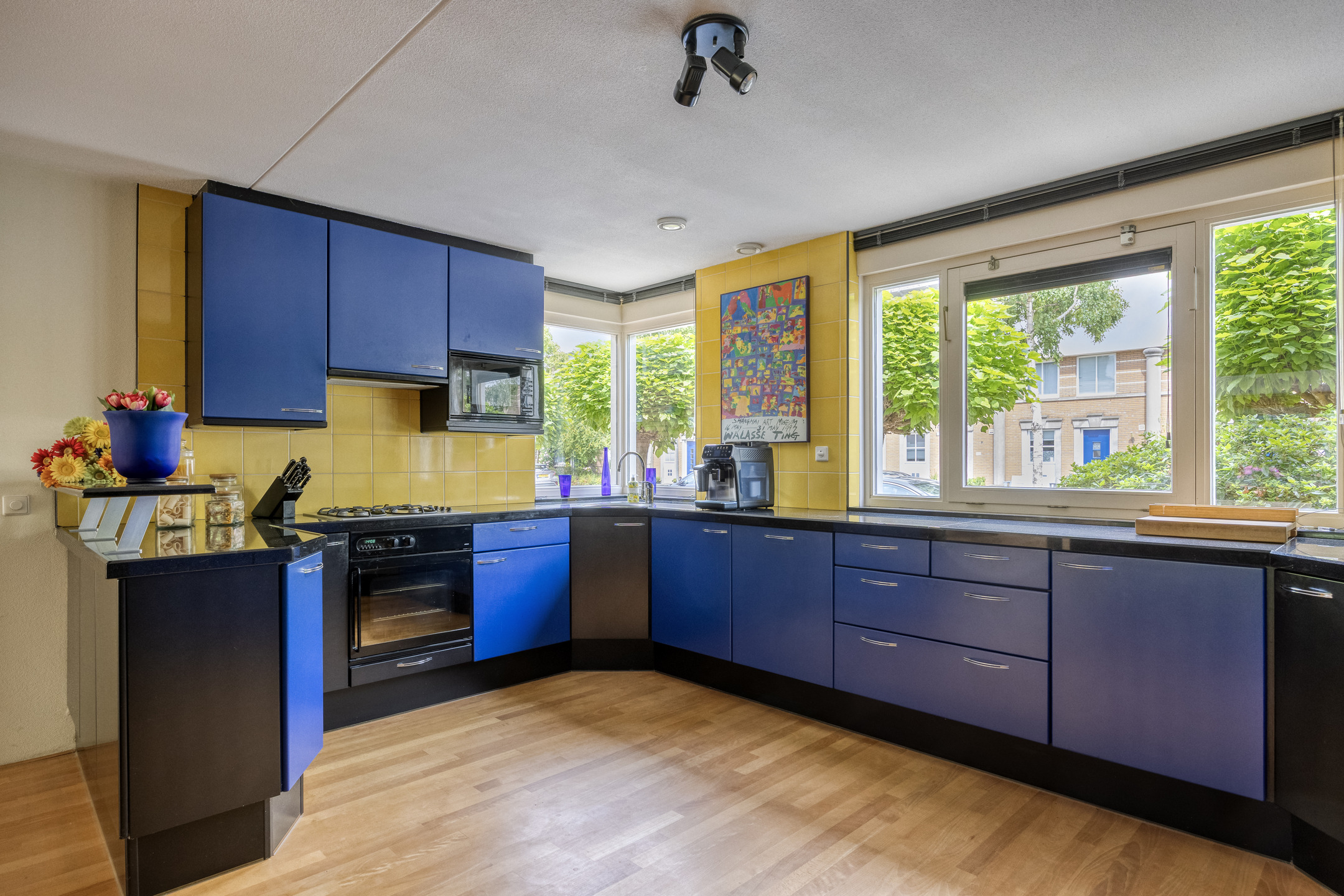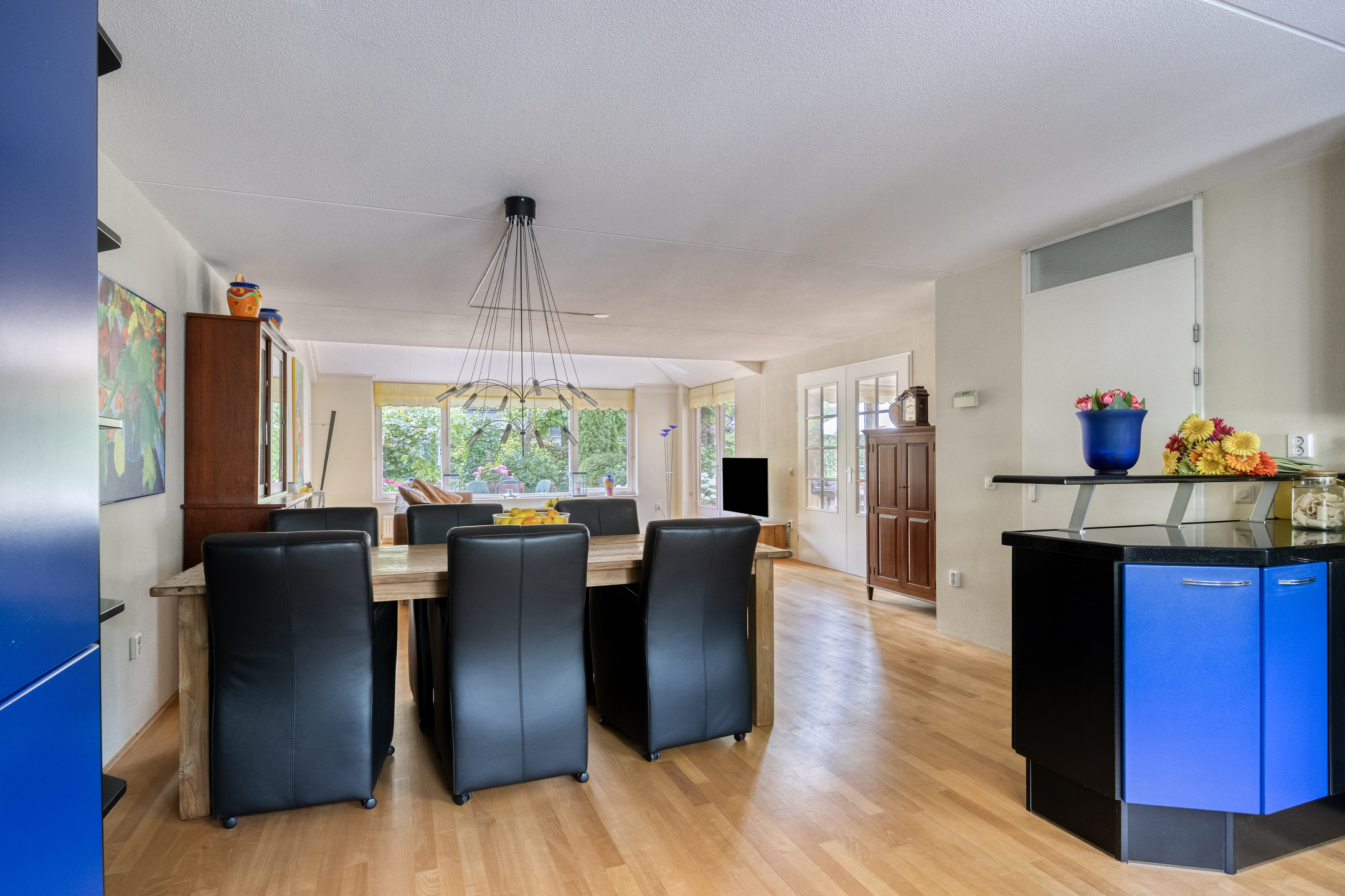 De royale woonkeuken ligt aan de voorzijde van de woning en is voorzien van veel kastruimte, een granieten aanrechtblad en diverse inbouwapparatuur, zoals een gasfornuis met afzuigkap, oven, magnetron,