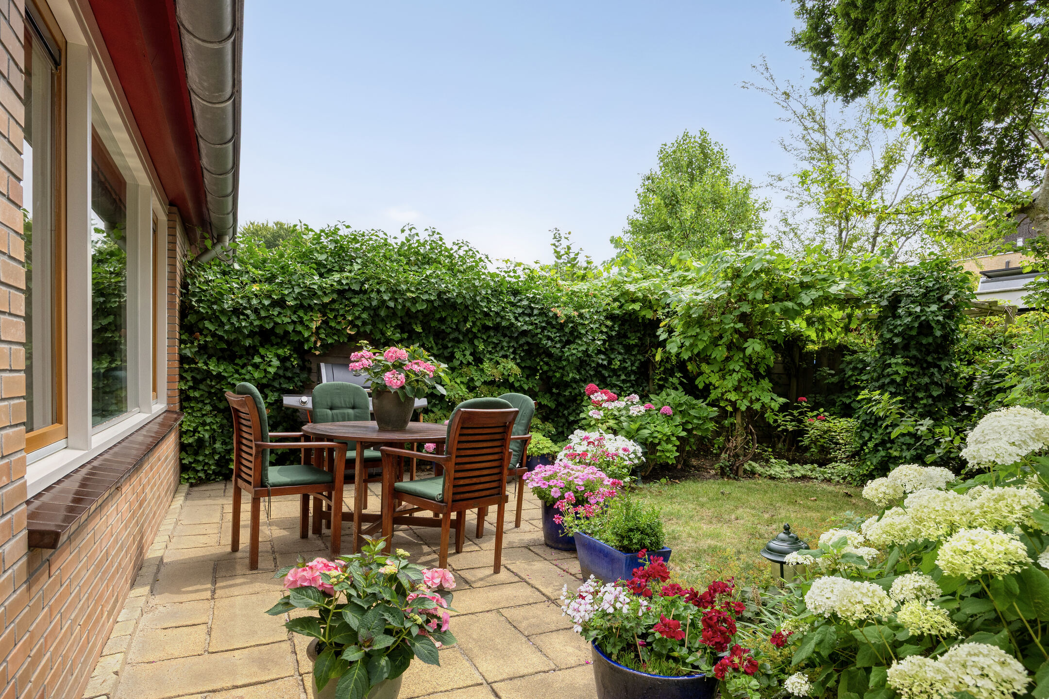 De fraai aangelegde achtertuin is gelegen op het zonnige zuidwesten en biedt volop privacy. Het gazon in combinatie met diverse planten, struiken en bomen zorgt voor een groene, rustige sfeer. Een heerlijke