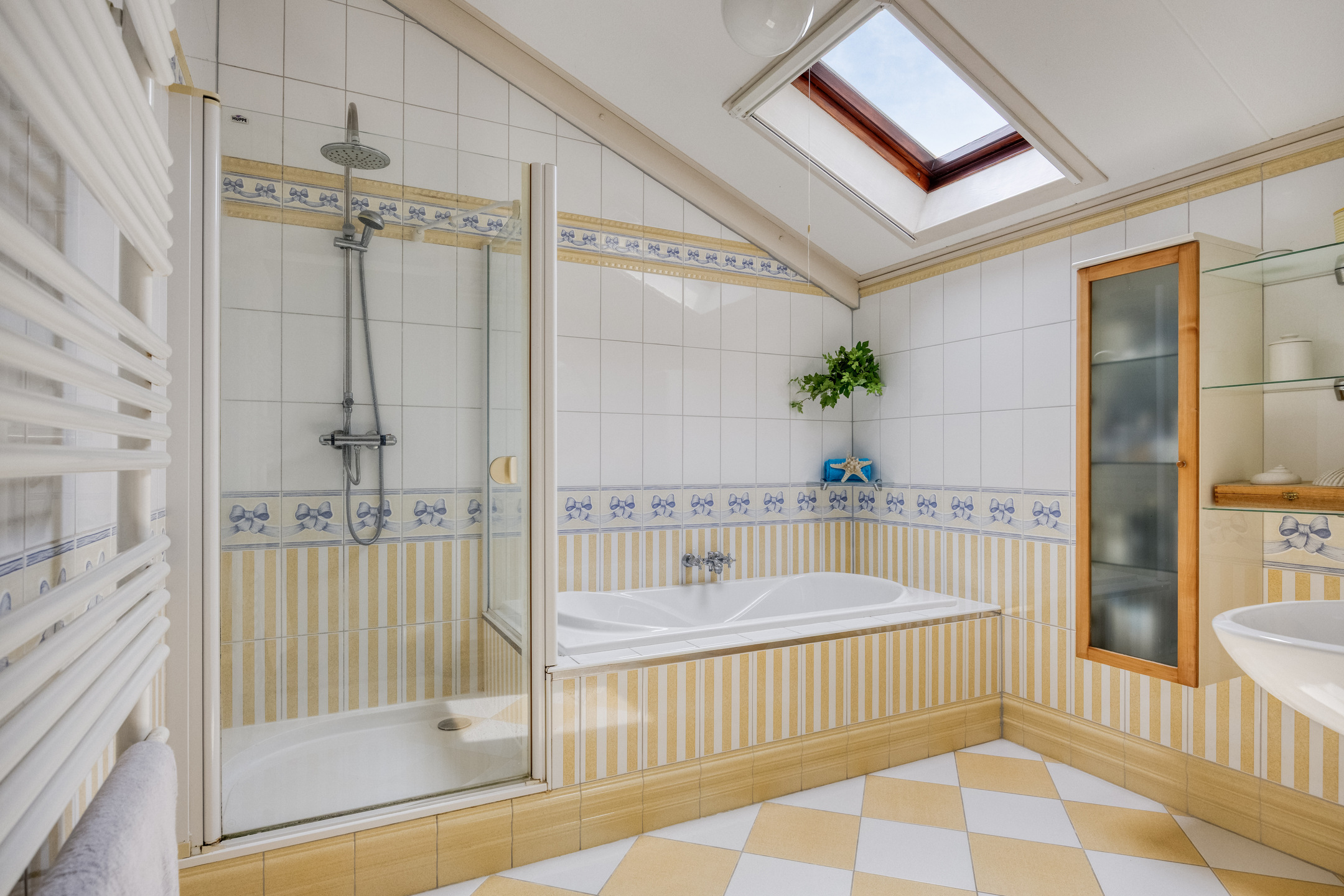 De badkamer is voorzien van een ligbad, douche, handdoekradiator