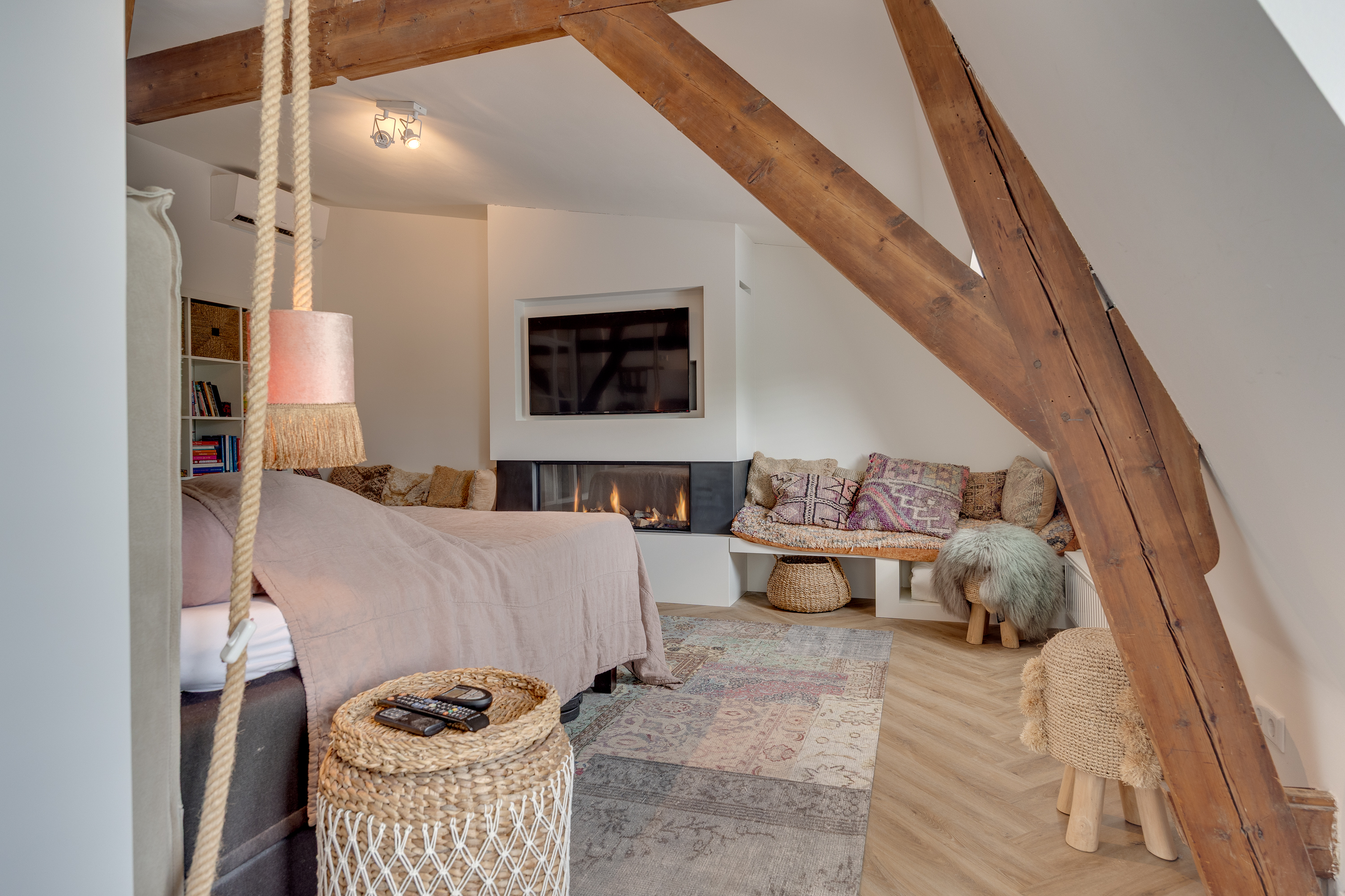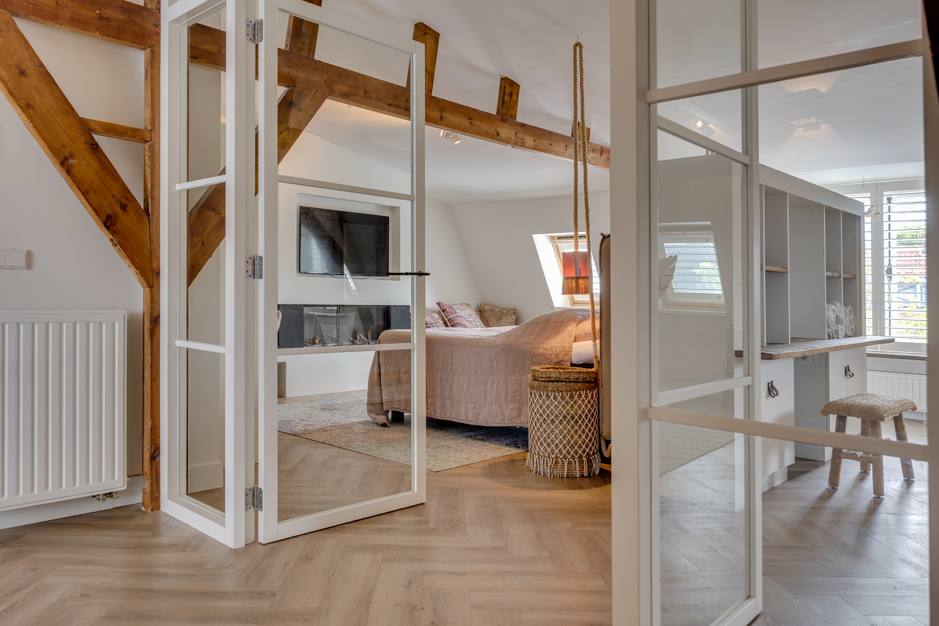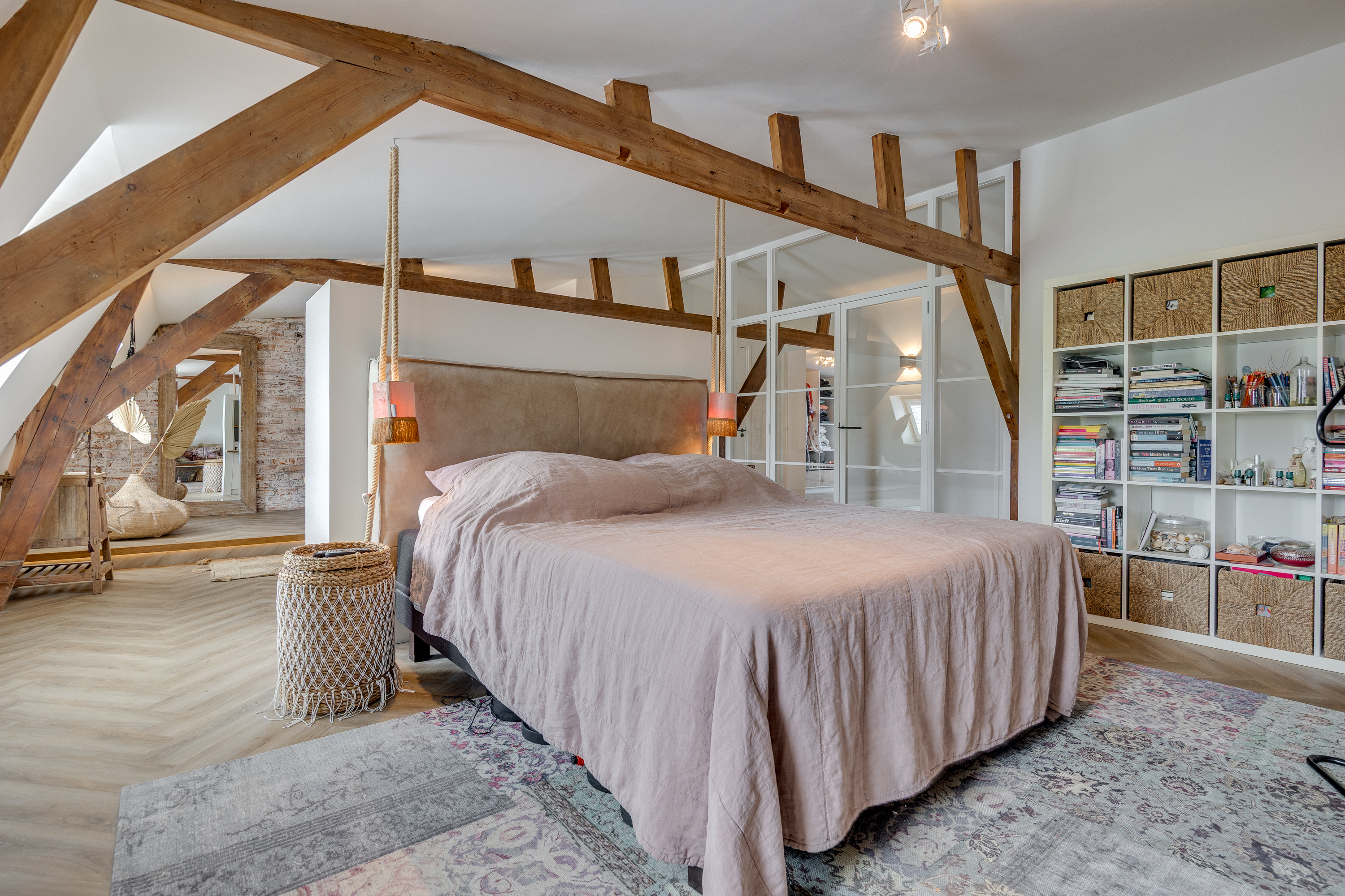 Daarnaast is er een tweede badkamer met inloopdouche, wastafelmeubel, toilet en ruimte voor wasmachine en droger. Een extra separaat toilet bevindt zich op de overloop. Authentieke houten balken zijn in het zicht gebleven en zorgen voor een sfeervol contrast met de moderne afwerking.