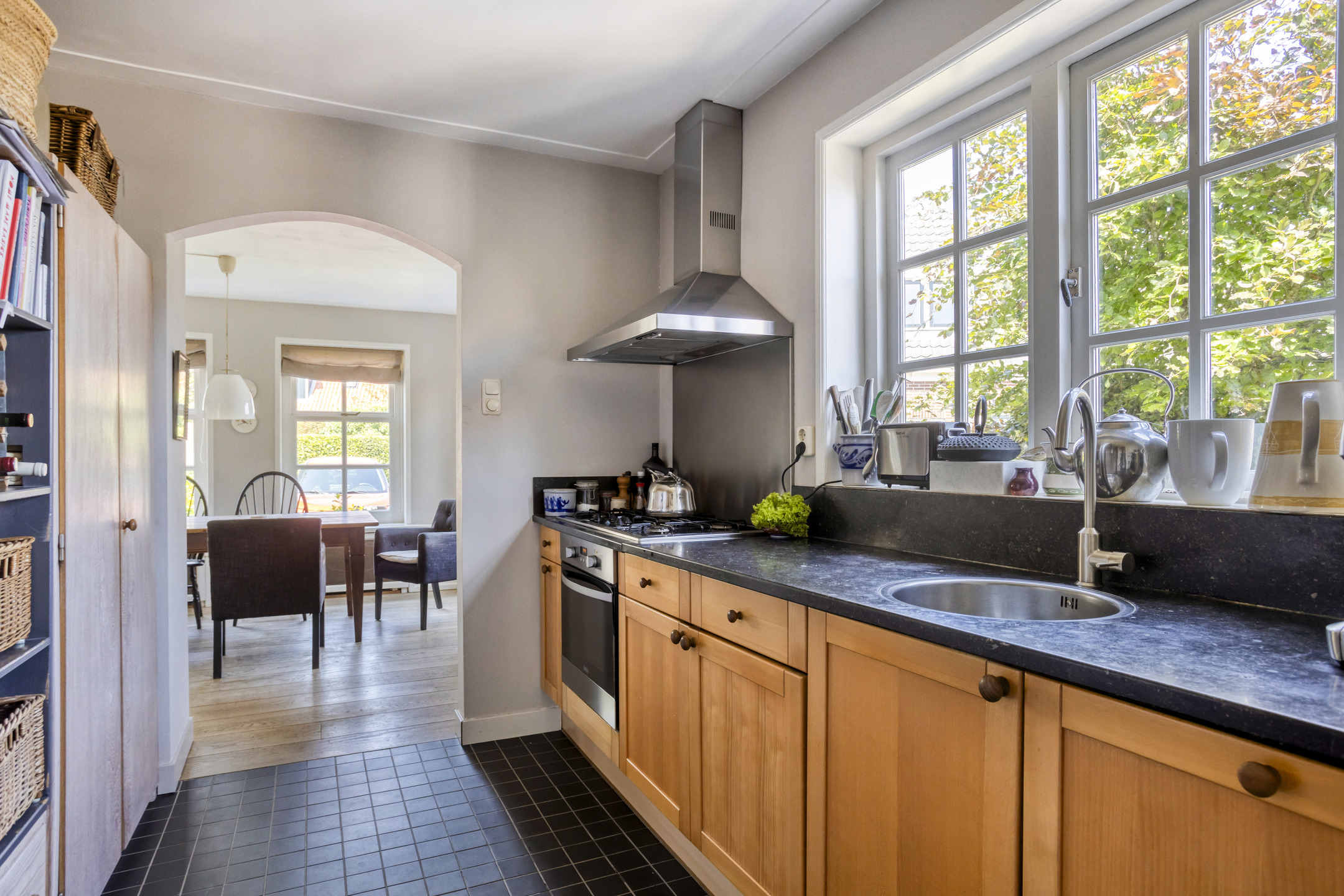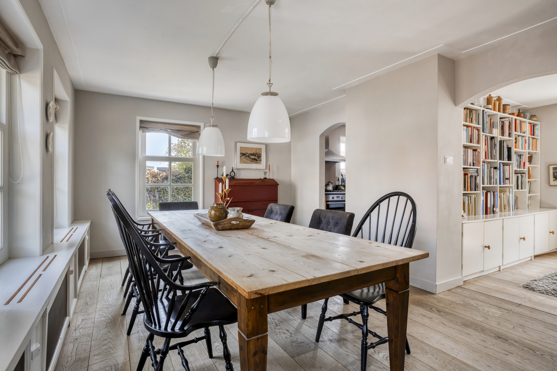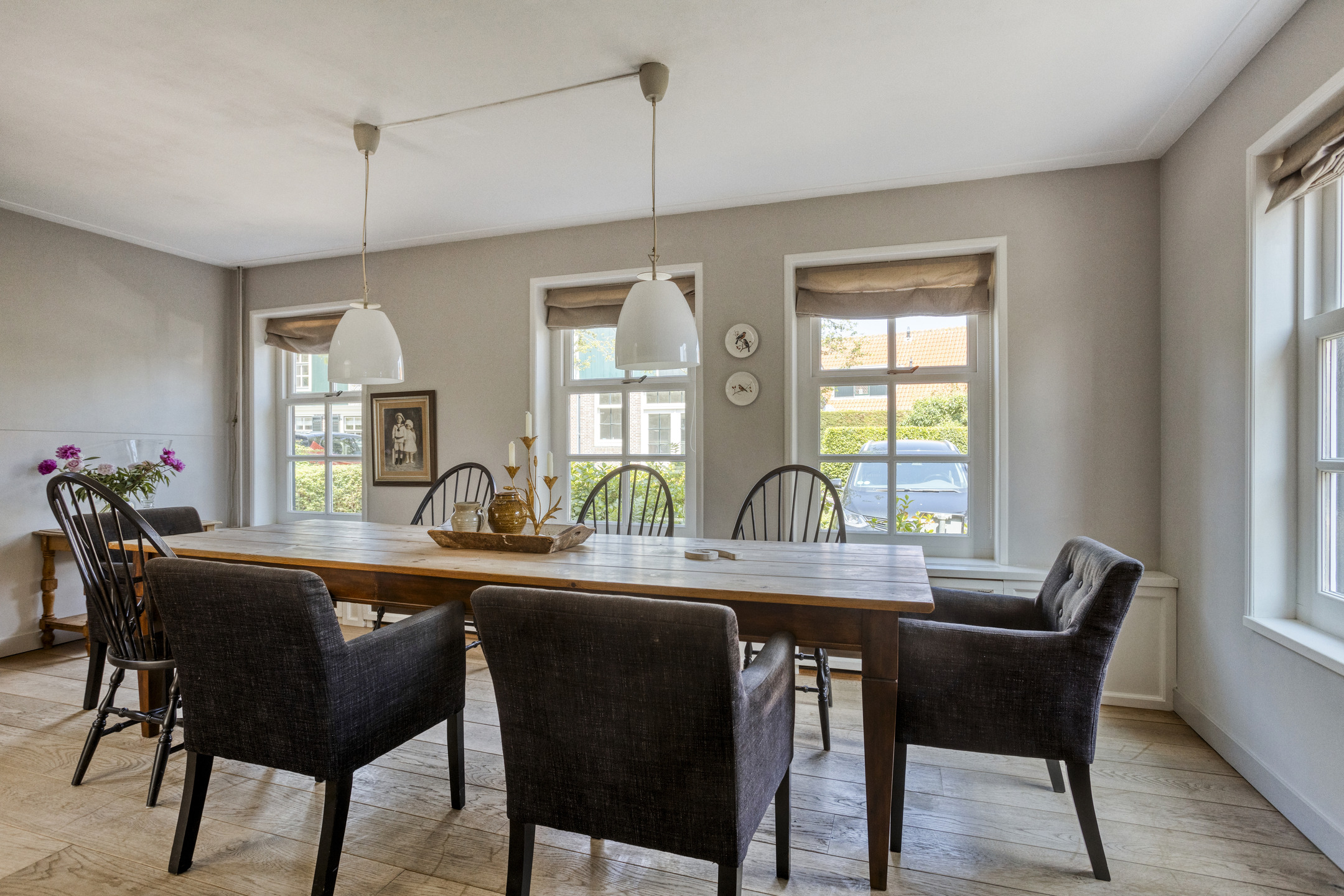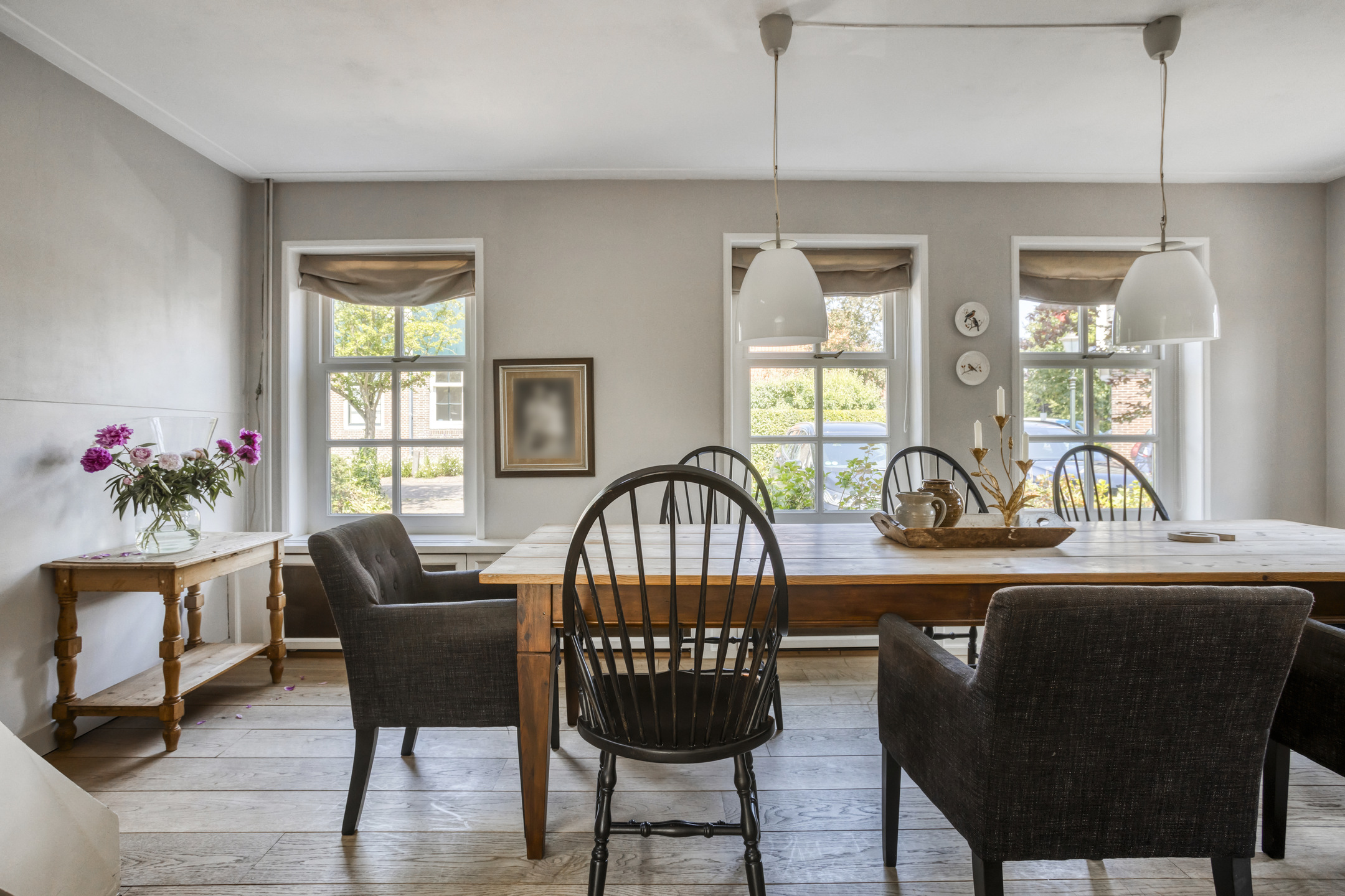 Via de voordeur stapt u binnen in de hal met doorloop naar het voorhuis. Aan de voorzijde bevindt zich de halfopen keuken, die is uitgerust met een 5-pits gaskookplaat, oven, vaatwasser en een losse koel-vriescombinatie. Aangrenzend aan de keuken treft u de sfeervolle eetkamer met prachtig lichtinval door de grote ramen, dat het gezellige hart van het voorhuis vormt. Aansluitend aan de eetkamer ligt een comfortabele living, die desgewenst van functie kan wisselen met de eetkamer. Vanuit de eetkamer leidt tevens een trap naar de eerste verdieping van het voorhuis.