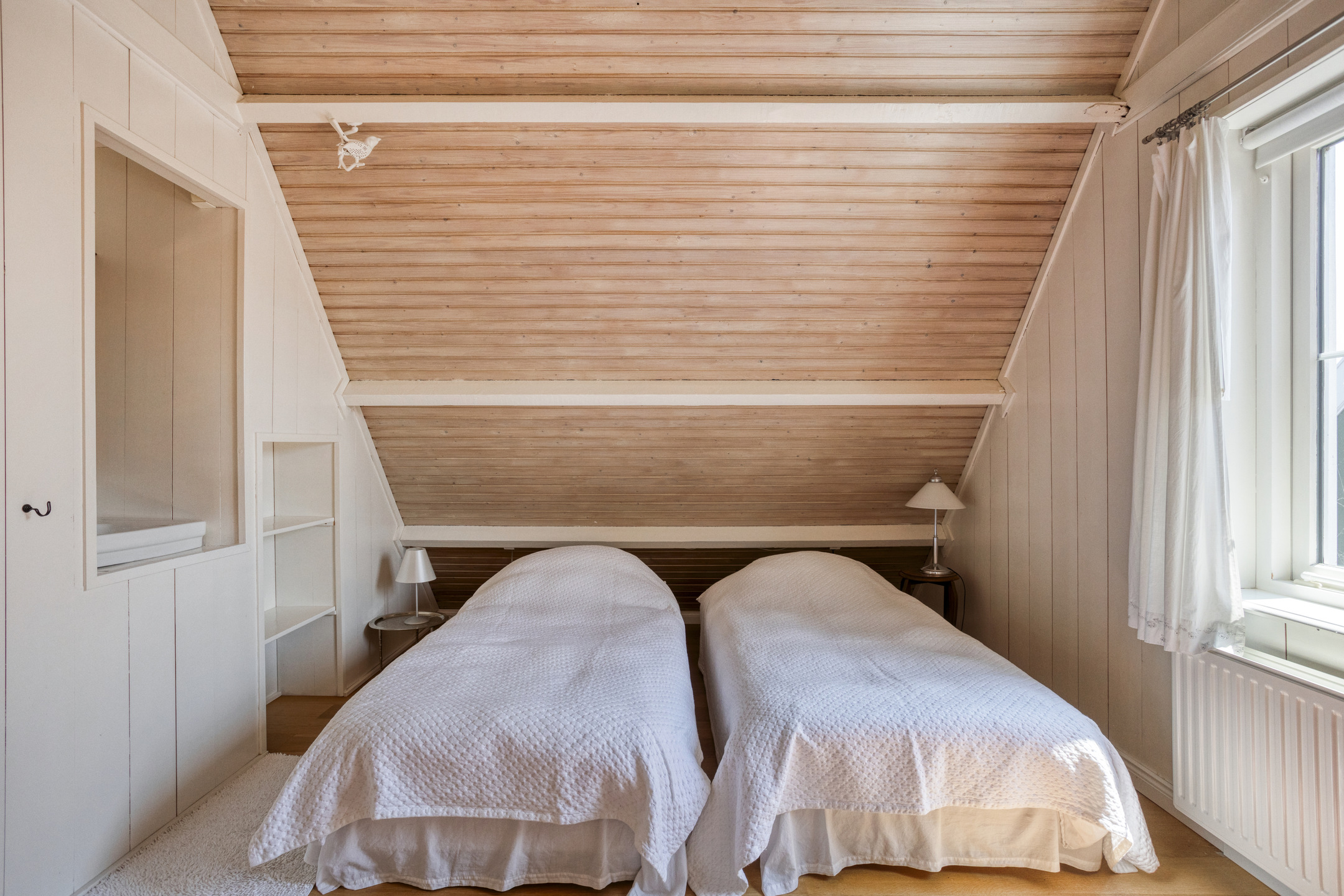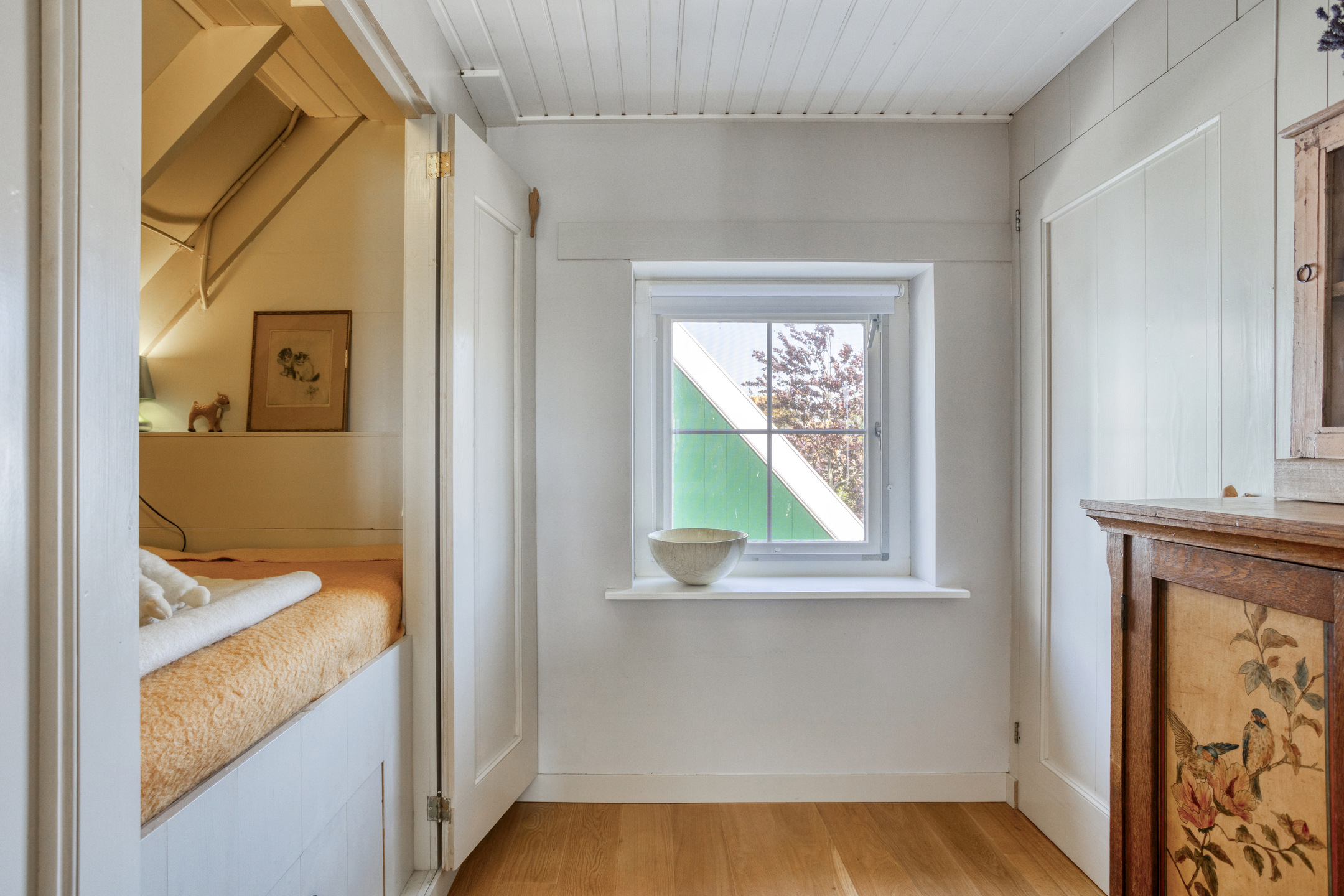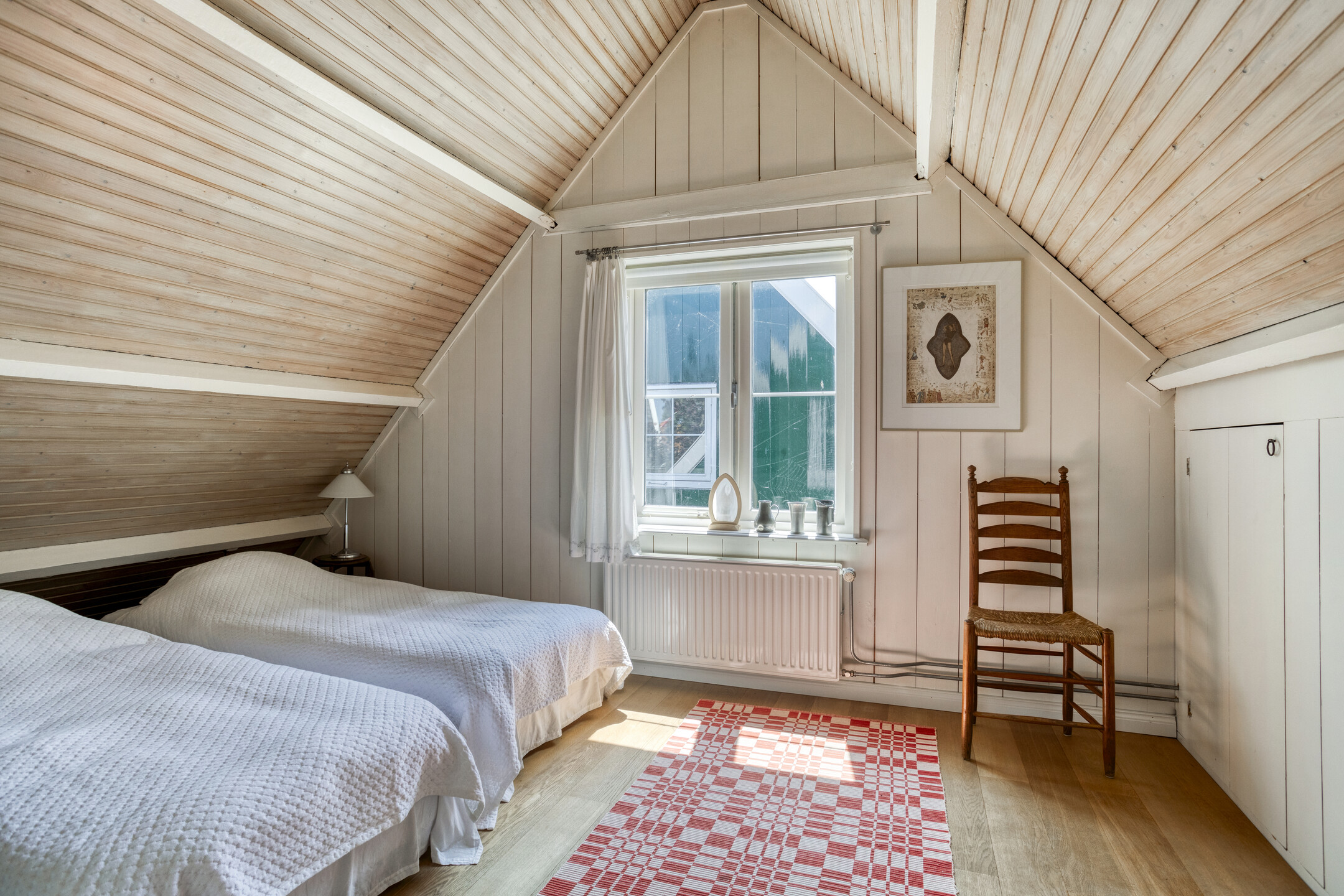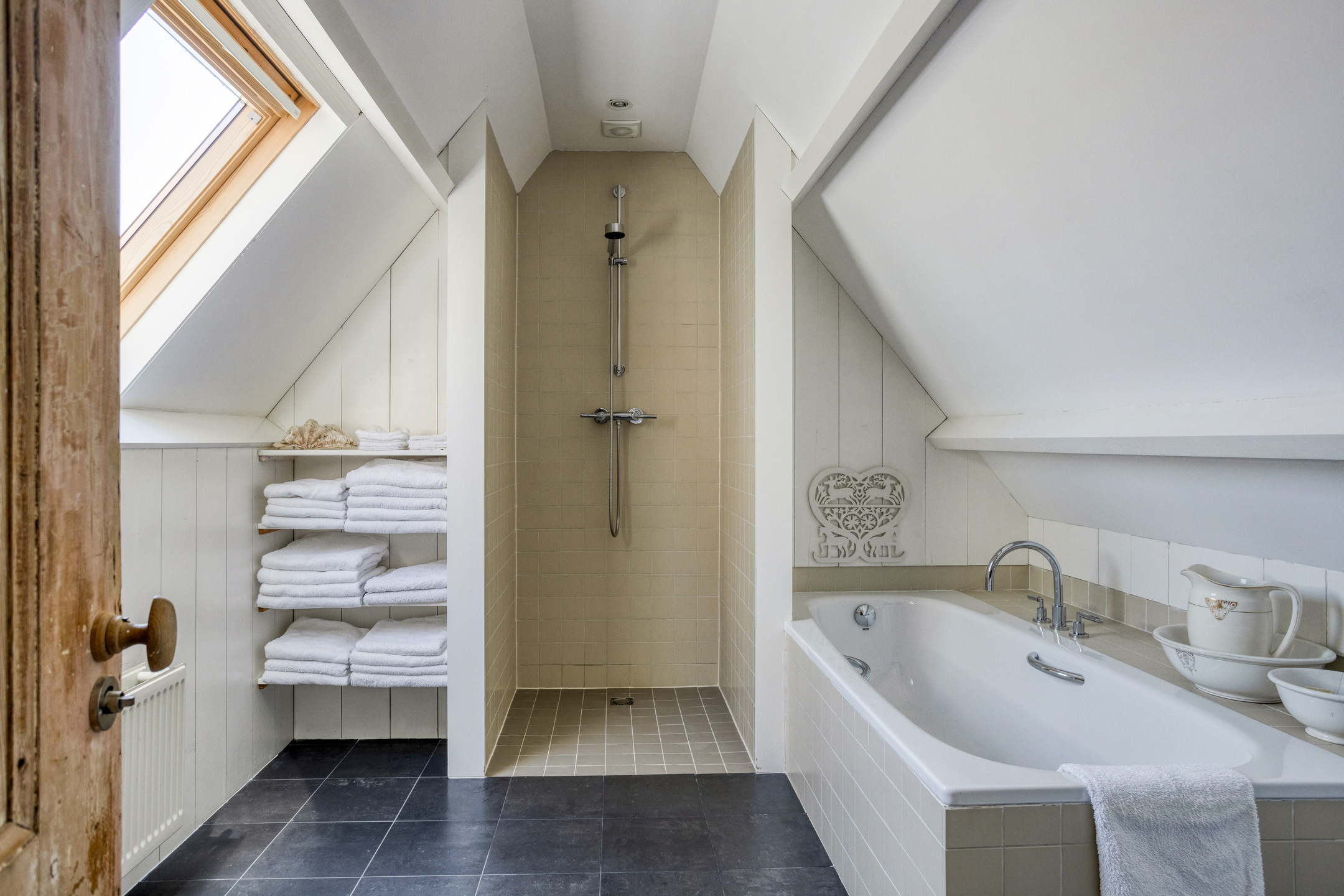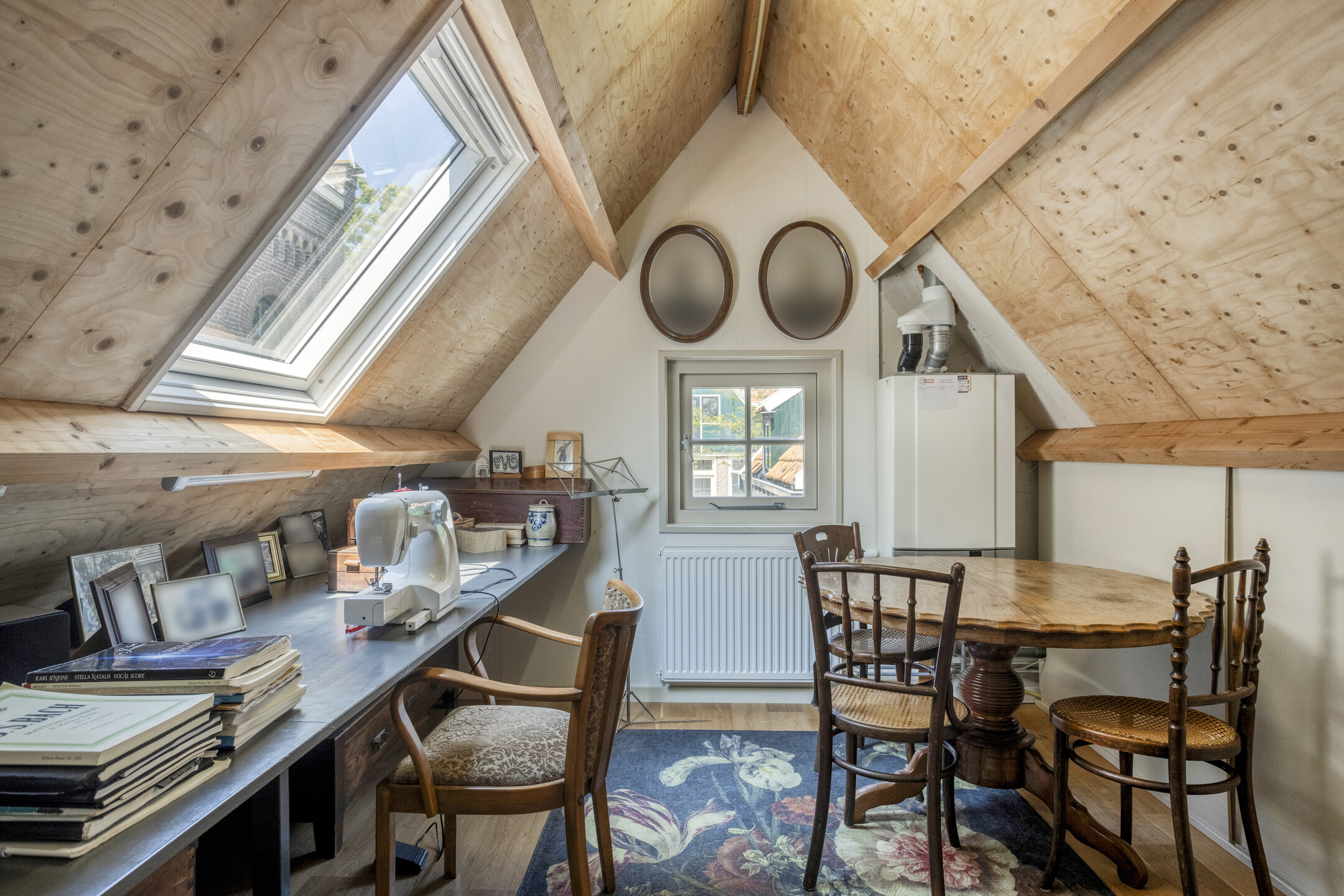 De eerste verdieping is verdeeld over het voorhuis en het achterhuis. In het voorhuis vind u twee ruime slaapkamers, elk voorzien van bergruimte achter de knieschotten. In het achterhuis leidt een brede trap naar een sfeervolle overloop, waar een charmante bedstee is ingebouwd, een unieke toevoeging dat kinderen zeker zal aanspreken. Vanuit hier bereikt u de royale master bedroom, voorzien van ingebouwde kastenwanden, een bergvliering en openslaande deuren naar een ruim dakterras met vrij uitzicht over het omringende landschap.
