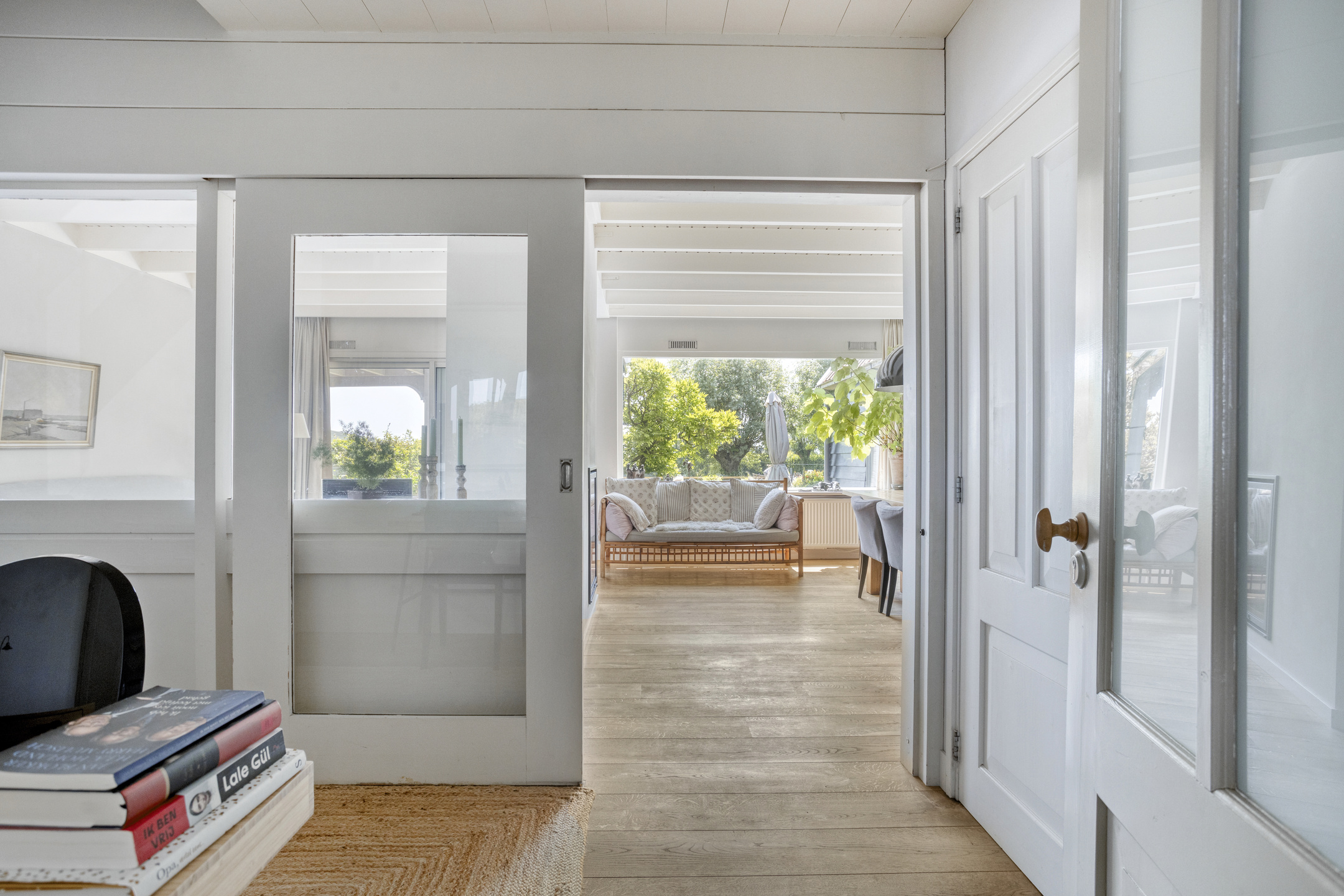 De overgang naar het achterhuis wordt gevormd door een ruime hal, die niet alleen een praktische verbindingsruimte is, maar ook beschikt over een douche en een toilet met fontein.