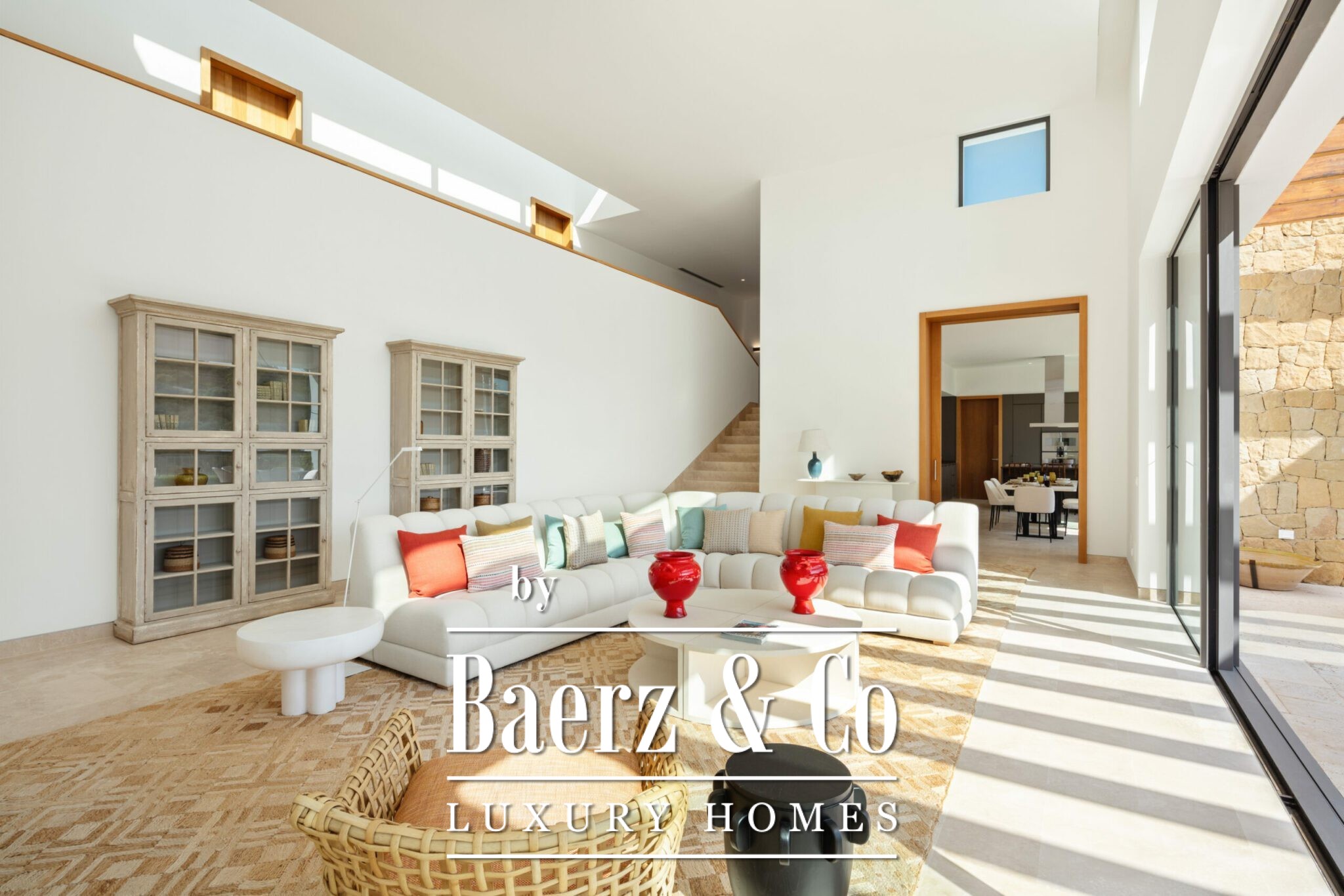Op de begane grond valt het licht royaal binnen via grote glaspartijen, waardoor de woonkamer met hoge plafonds tot een open, gelaagde ruimte wordt verheven. Twee zitgedeeltes flankeren de centrale haard, terwijl de eethoek overloopt in een hypermoderne keuken, gekenmerkt door neutrale tinten en royale werkbladen. Directe toegang tot het terras verbindt binnen moeiteloos met buiten en leidt naar de uitgestrekte terrassen op de begane grond en het fraai aangelegde perceel van 1.837 m². Hier weerspiegelt het privézwembad de steeds veranderende lucht, met uitzicht op het omliggende landschap en de eerste lijn golfbaan.