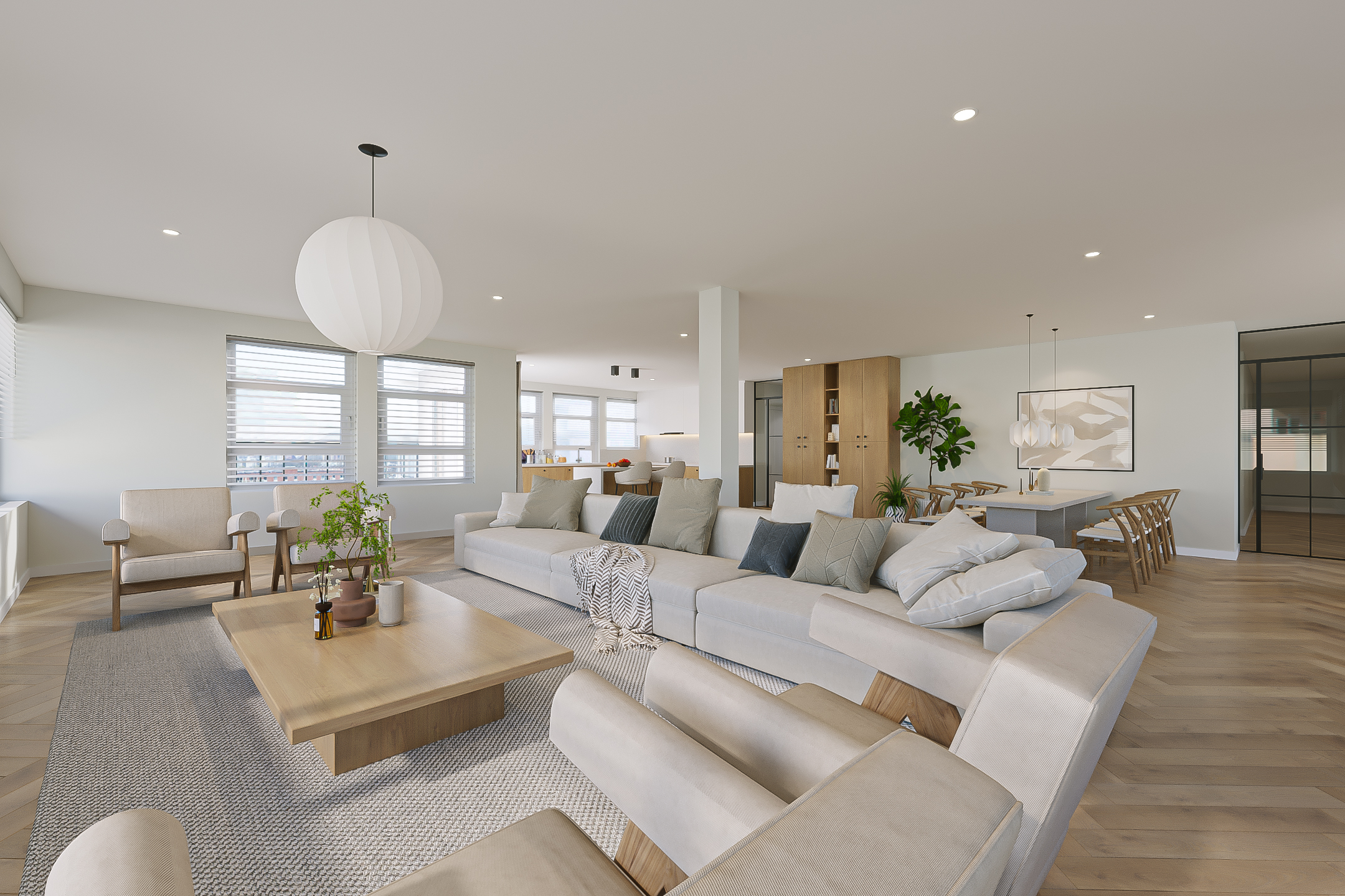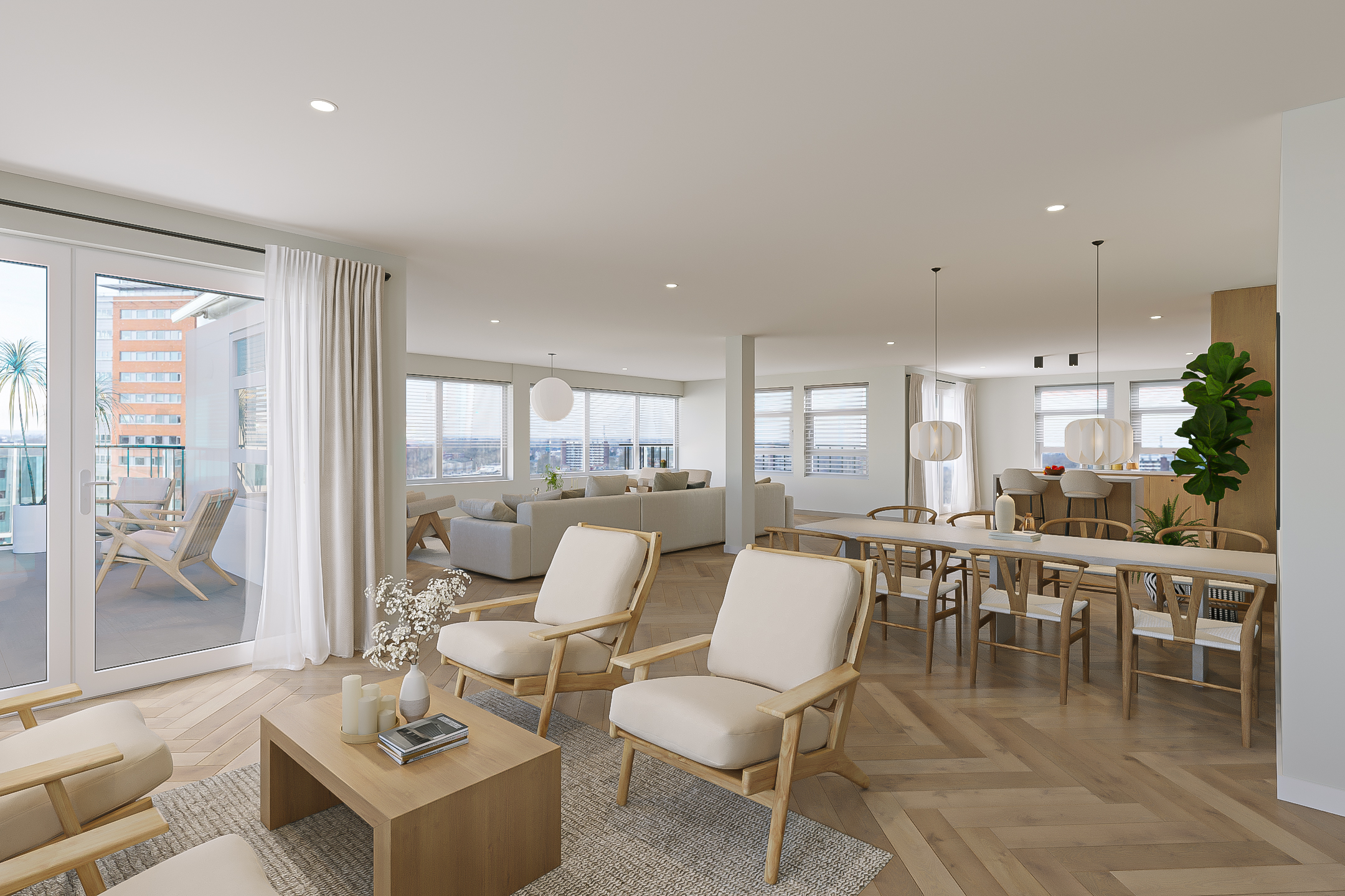 De ruime woonkamer met veel lichtinval heeft toegang tot het eerste dakterras en de woonkeuken. De woonkeuken is gesloten maar ruim genoeg om een grote familie eethoek te plaatsen. Met het verwijderen van de keukenwand is er een open keuken te creëren. Via de openslaande deuren loop je vanuit de keuken naar het tweede dakterras.