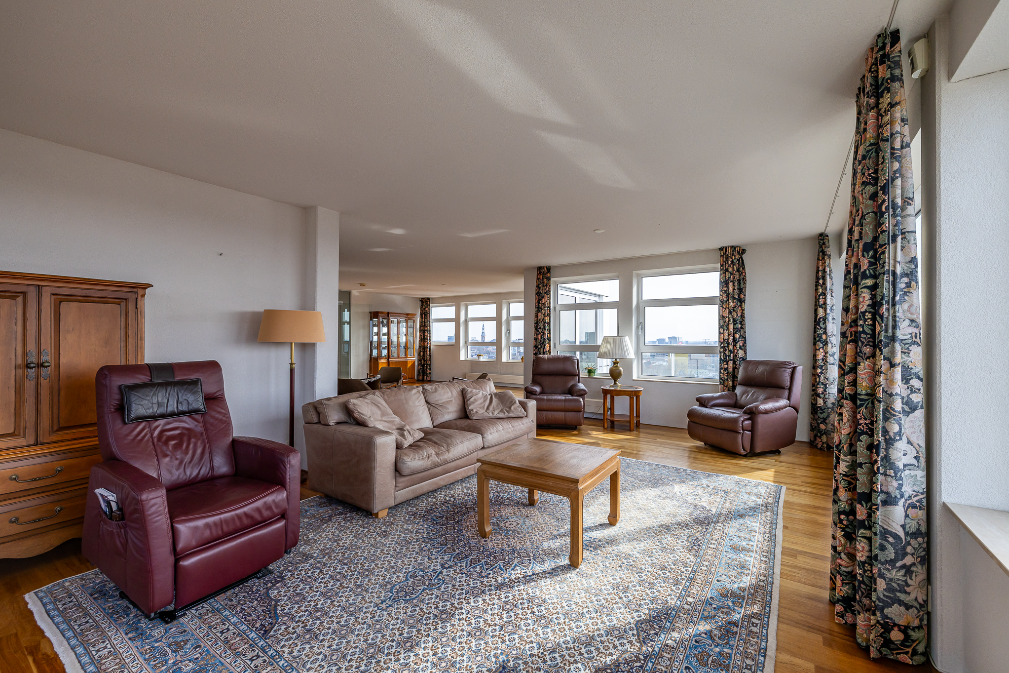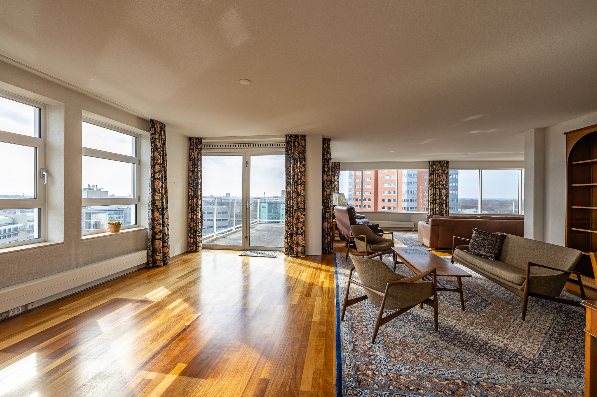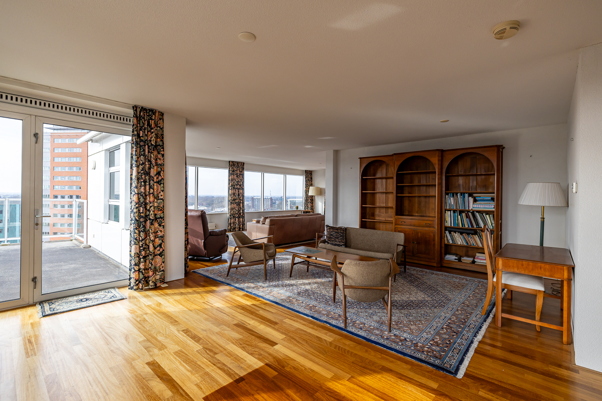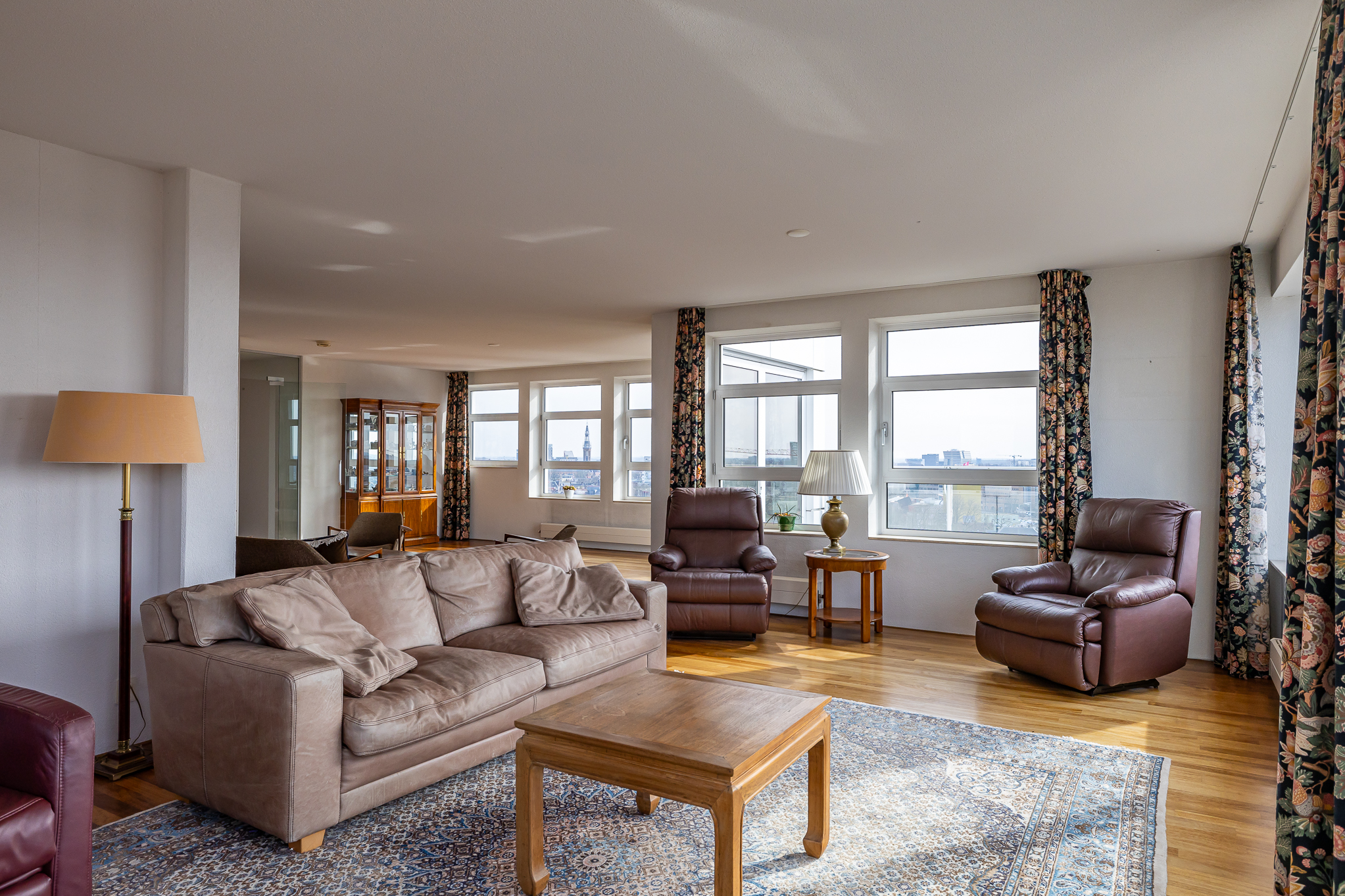 Door de samenvoeging van twee penthouses heeft de woning maar liefst een woonoppervlakte van 263 m² en is o.a. voorzien een zeer ruime woonkamer en woonkeuken, vier slaapkamers, twee badkamers met stoomcabine, jacuzzi en sauna, twee separate toiletten en twee dakterrassen. Vanaf alle vertrekken in de woning en het balkon rondom de woning strekt zich een adembenemend uitzicht over de hele stad uit.