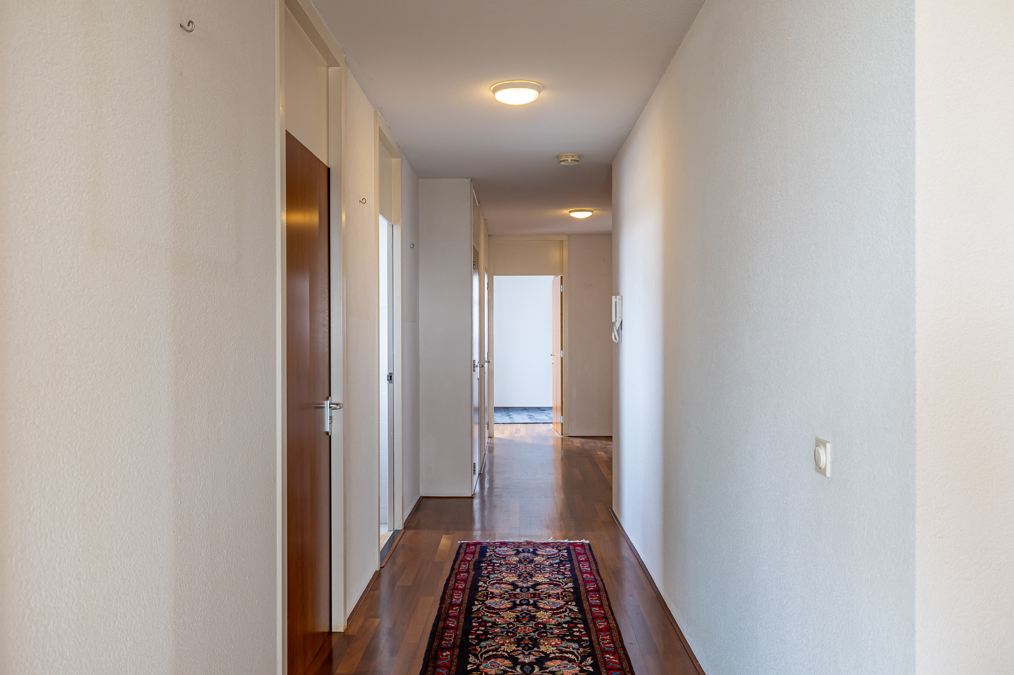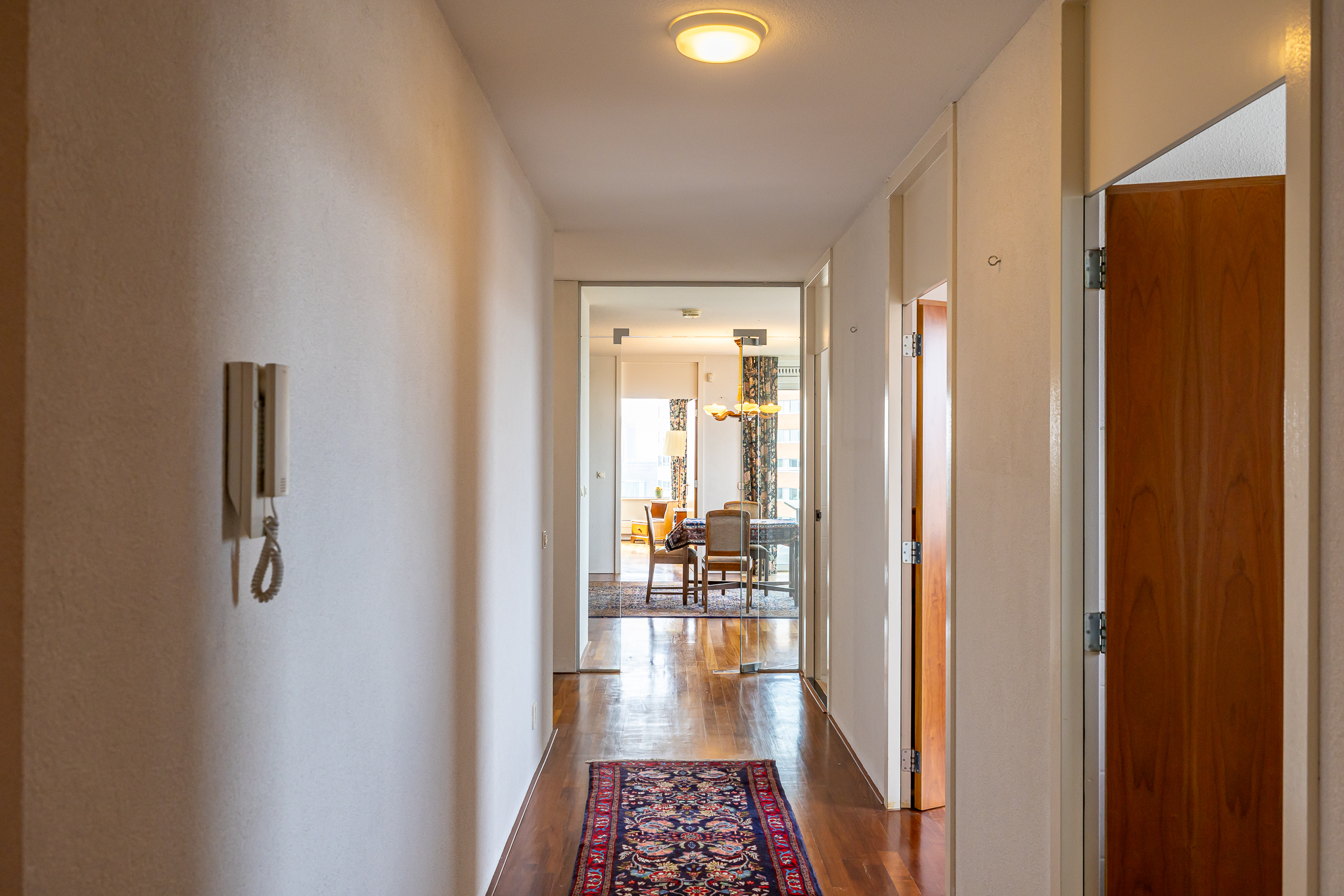 Via de entree met intercom en videosysteem komt u in de centrale hal met liften en een trappenhuis. Op de 12e verdieping komt u aan in uw eigen hal met twee voordeuren. Beide voordeuren geven entree tot een hal en gang.