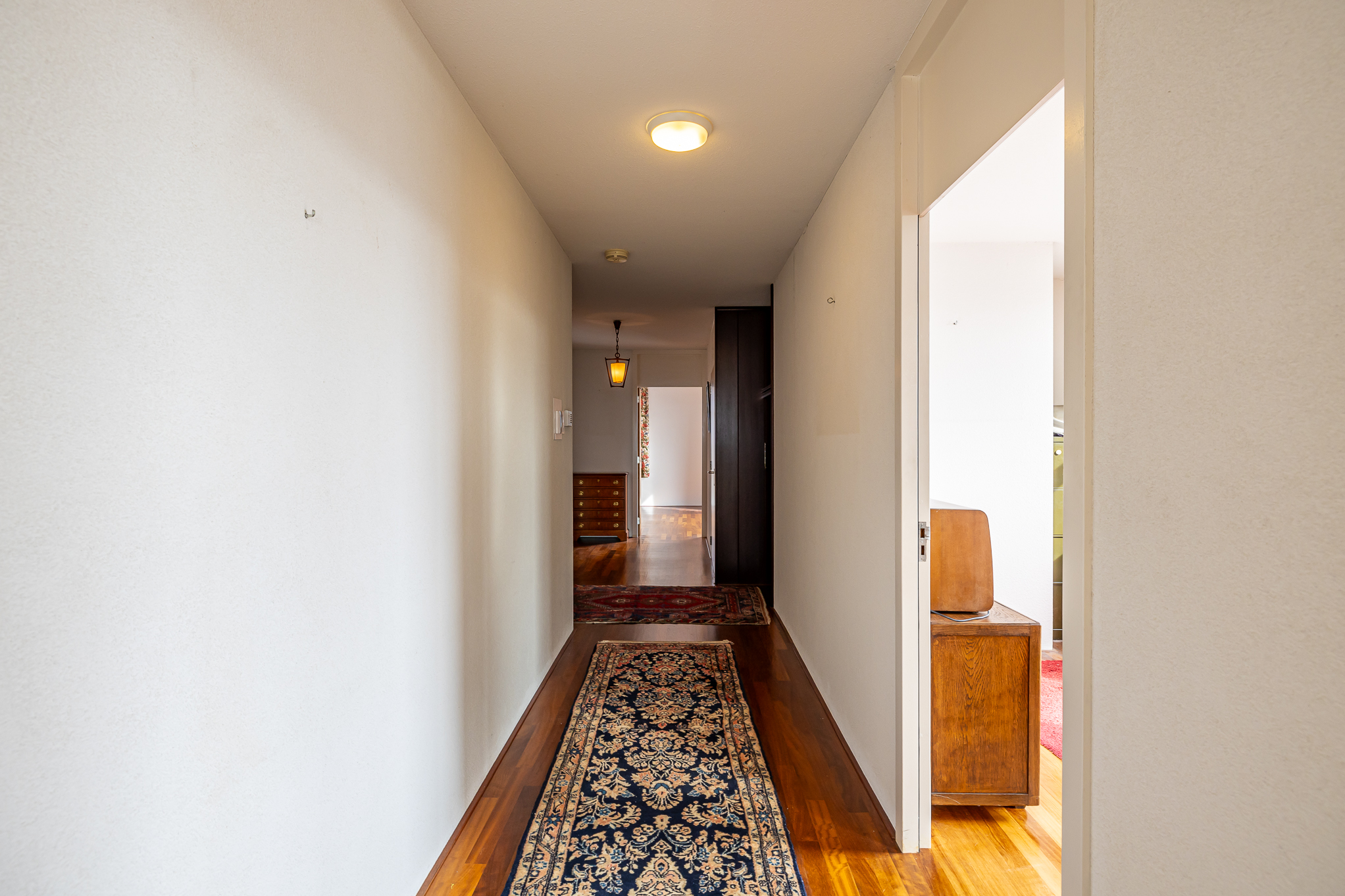 De tussengang heeft vier ingebouwde kasten die voldoende bergruimte bieden.