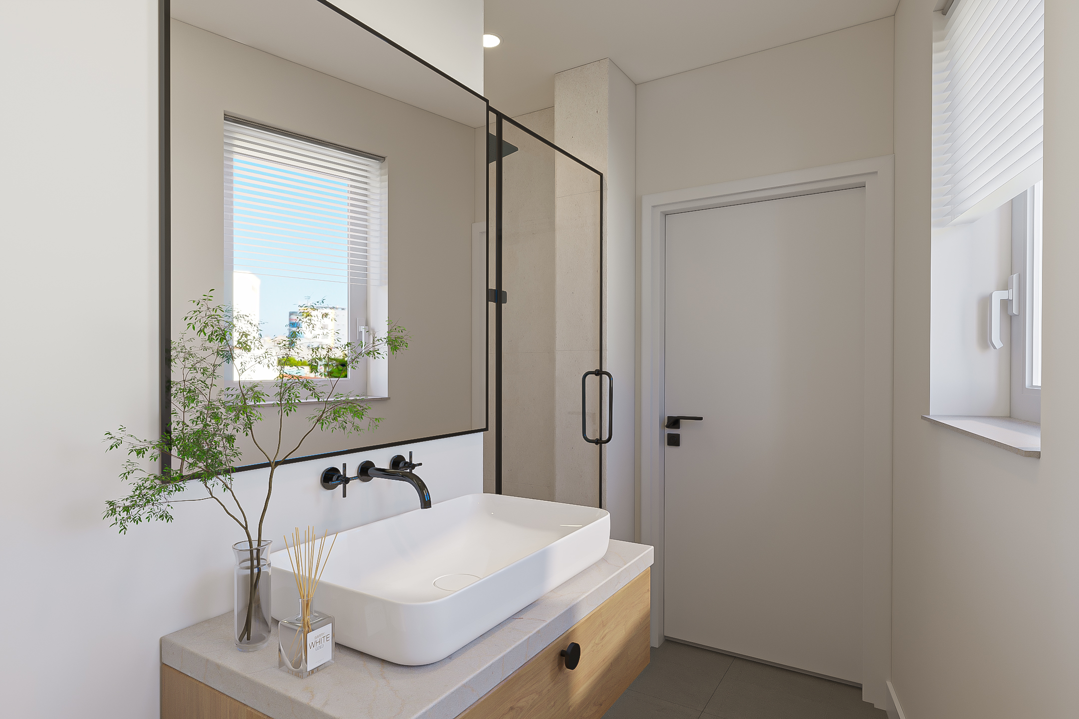 Gang 2 opent de deuren naar de bijkeuken, twee slaapkamers met toegang tot het balkon, separaat toilet, badkamer met sauna, stoomcabine en dubbele wastafelmeubel.