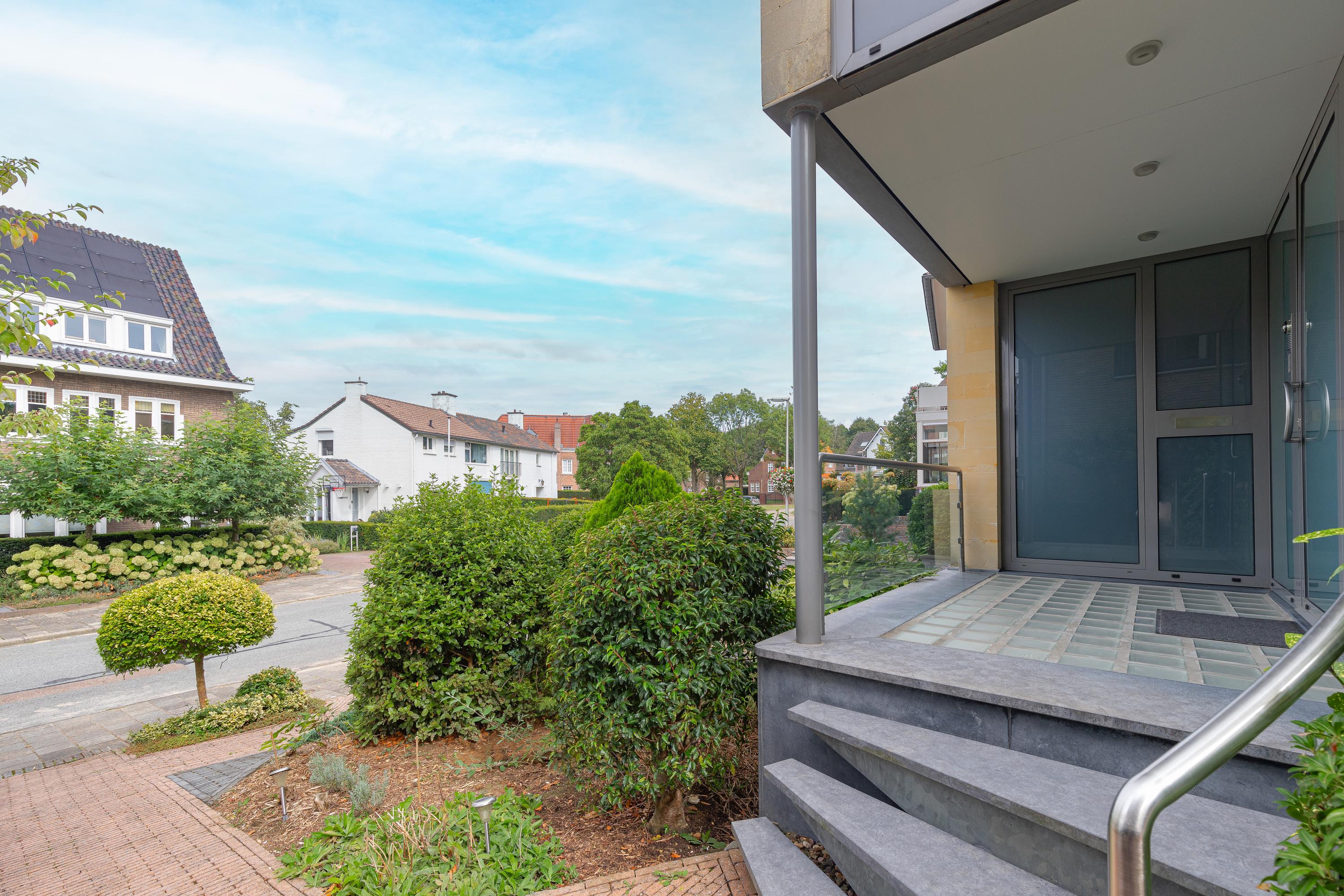 Natuurstenen trap naar de overdekte entree. De royale ontvangsthal met veel lichtinval biedt toegang tot het souterrain en de verdieping. Links van de hal gelegen is de meterkast en ruim toilet. Het toilet is voorzien van zwevend toilet en natuurstenen wastafel. De ruime toiletruimte is voorbereid met een inloopdouche en kan als badkamer dienen als de kantoorruimte als slaapkamer wordt gebruikt. Direct grenzend aan de hal ligt aan voorzijde van de villa de kantoorruimte met een prachtige erker die uitzicht geeft op de Caumerdalschestraat. Een imposante hardglazen taatsdeur tot plafondhoogte biedt toegang tot de fraaie woonkamer. De ruim drie meter hoge plafonds en royale glaspuien aan achterzijde van de woonkamer zijn voorzien van een tweetal schuifelementen.