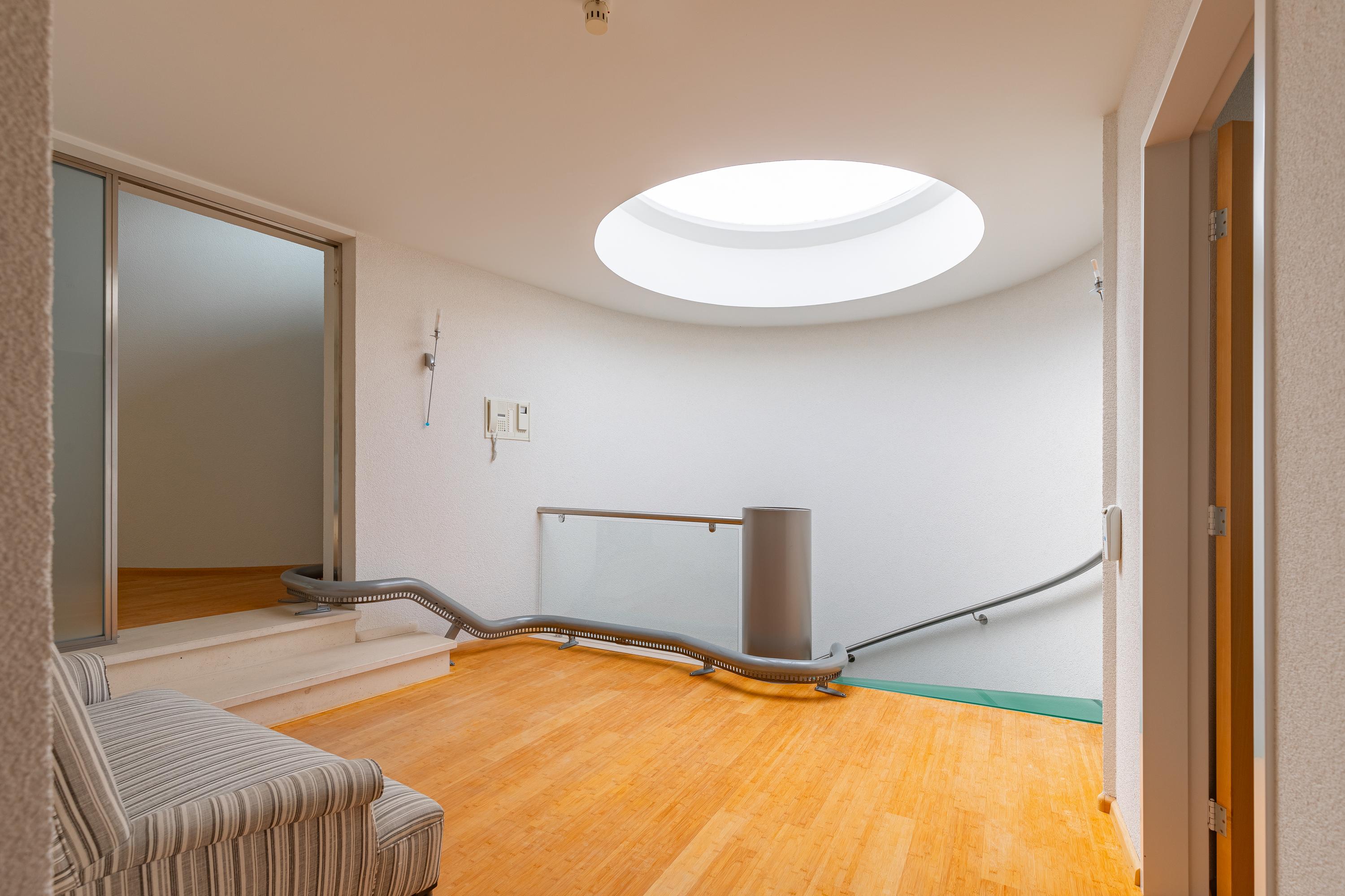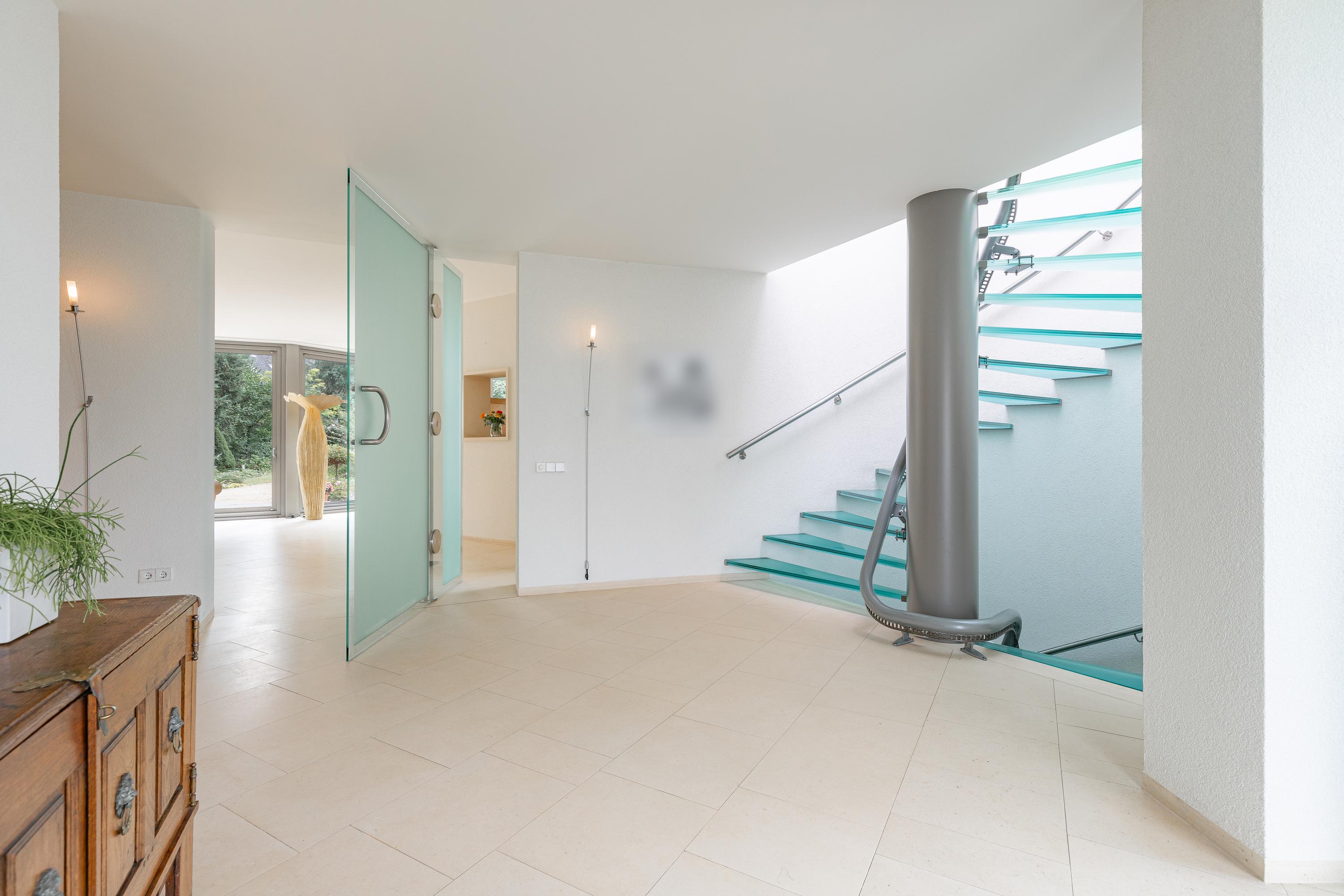 Het imposante trappenhuis is in een ronde vorm gebouwd en loopt vanuit het souterrain tot de overloop op de eerste verdieping. De stalen koker centraal dient als waskoker en voor de bevestiging van de hardglazen traptreden.