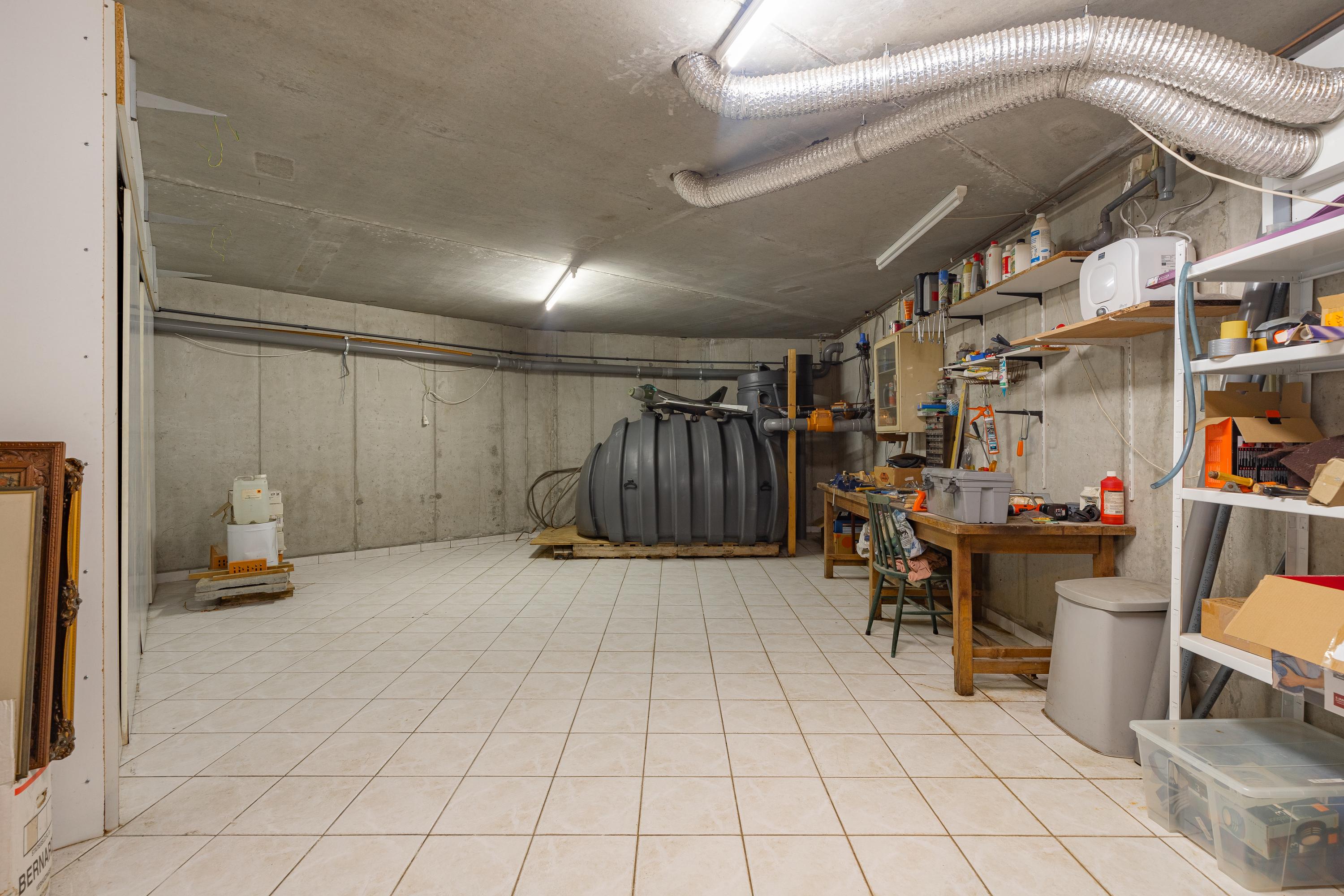 De villa is volledig voorzien van een souterrain. De beklinkerde oprit biedt toegang tot de riante garage. Deze is voorzien van een brede elektrisch bedienbare sectionaalpoort. De constructie is aan de buitenzijde geheel in beton gestort en daarmee waterdicht. Een witte plavuizenvloer afwerking in het hele souterrain. Technische ruimte met HR Nefit CV installatie en verdeler voor de vloerverwarming. Een grijs water circuit met opslagstank van 3500 liter tank voor het spoelen van de toiletten, wasapparatuur en water voor de tuin. Provisiekelder, wasruimte met daglicht toetreding en aansluitpunt voor witgoed.