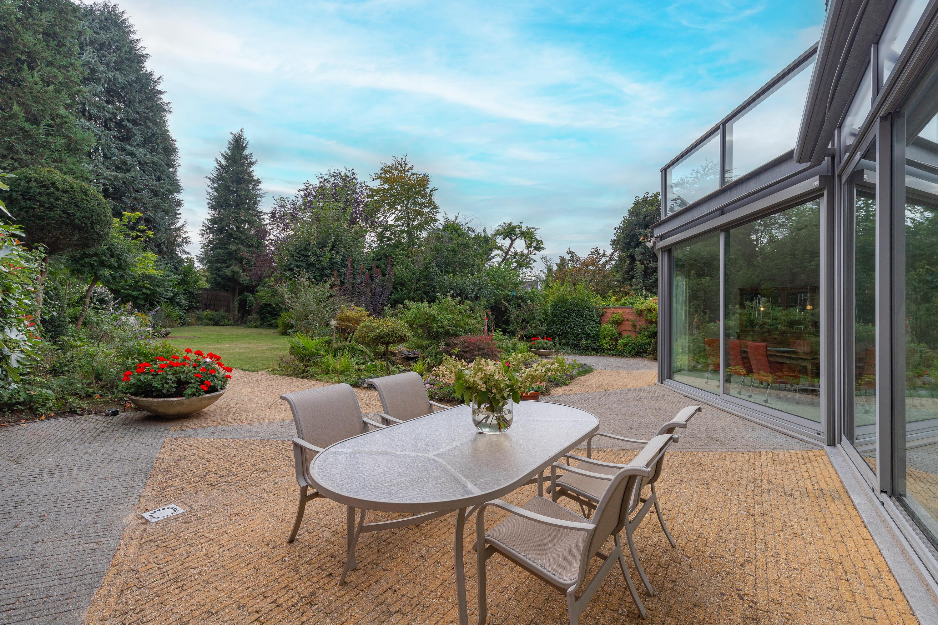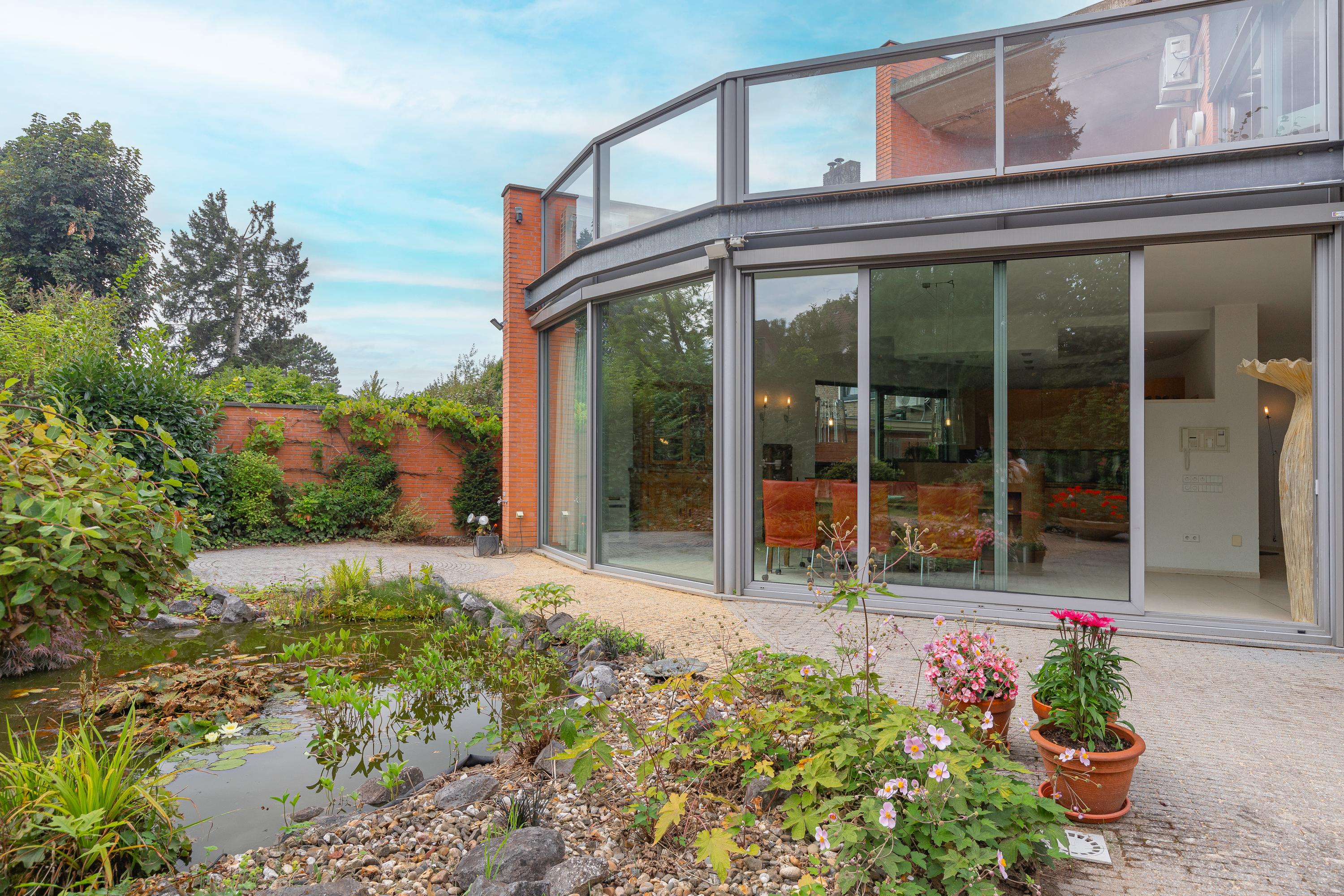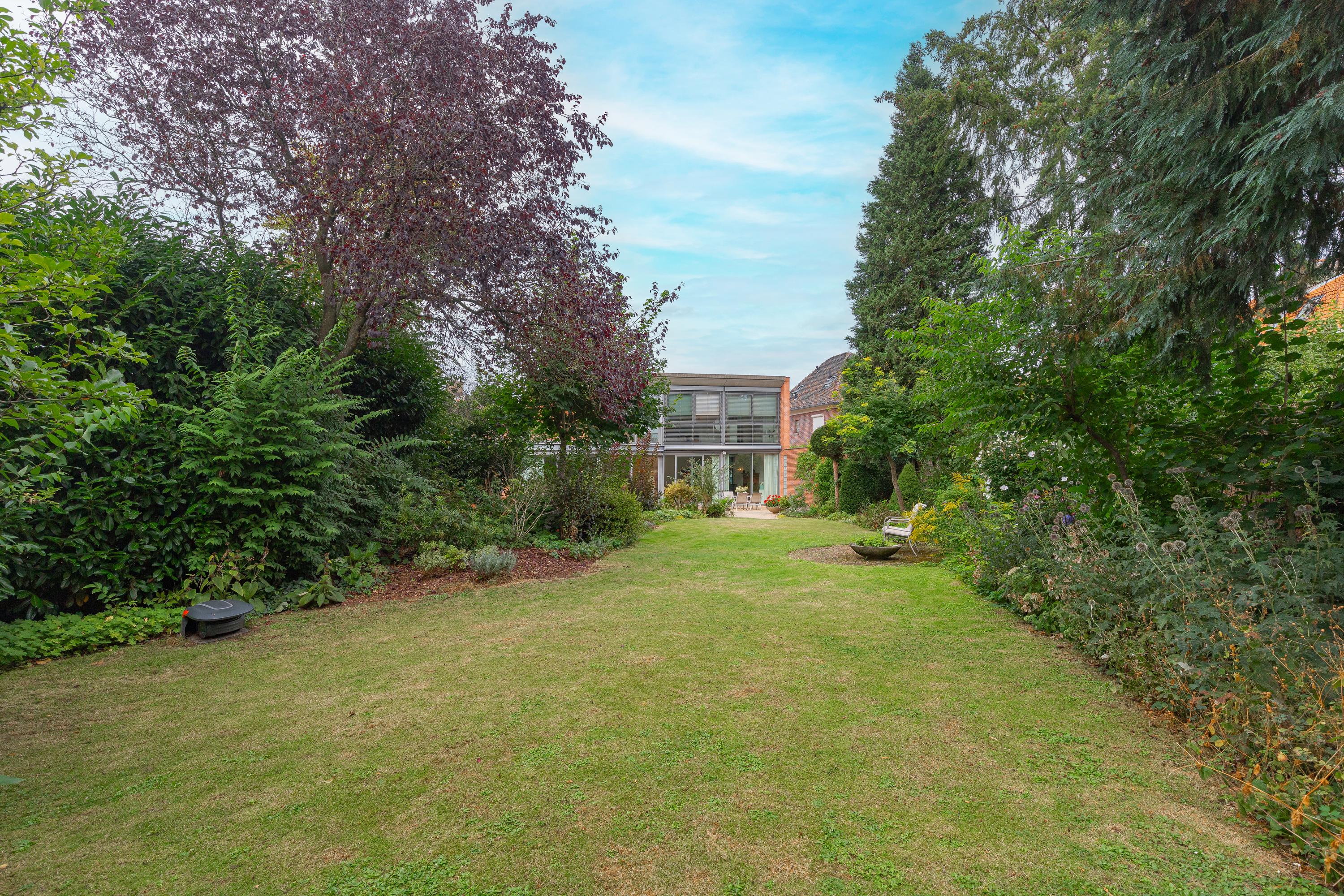 De prachtig aangelegde tuin met zij-ingang en afsluitbaar stalen poort, royale terrassen, een vijver en volledig omsloten voor optimaal tuinplezier.