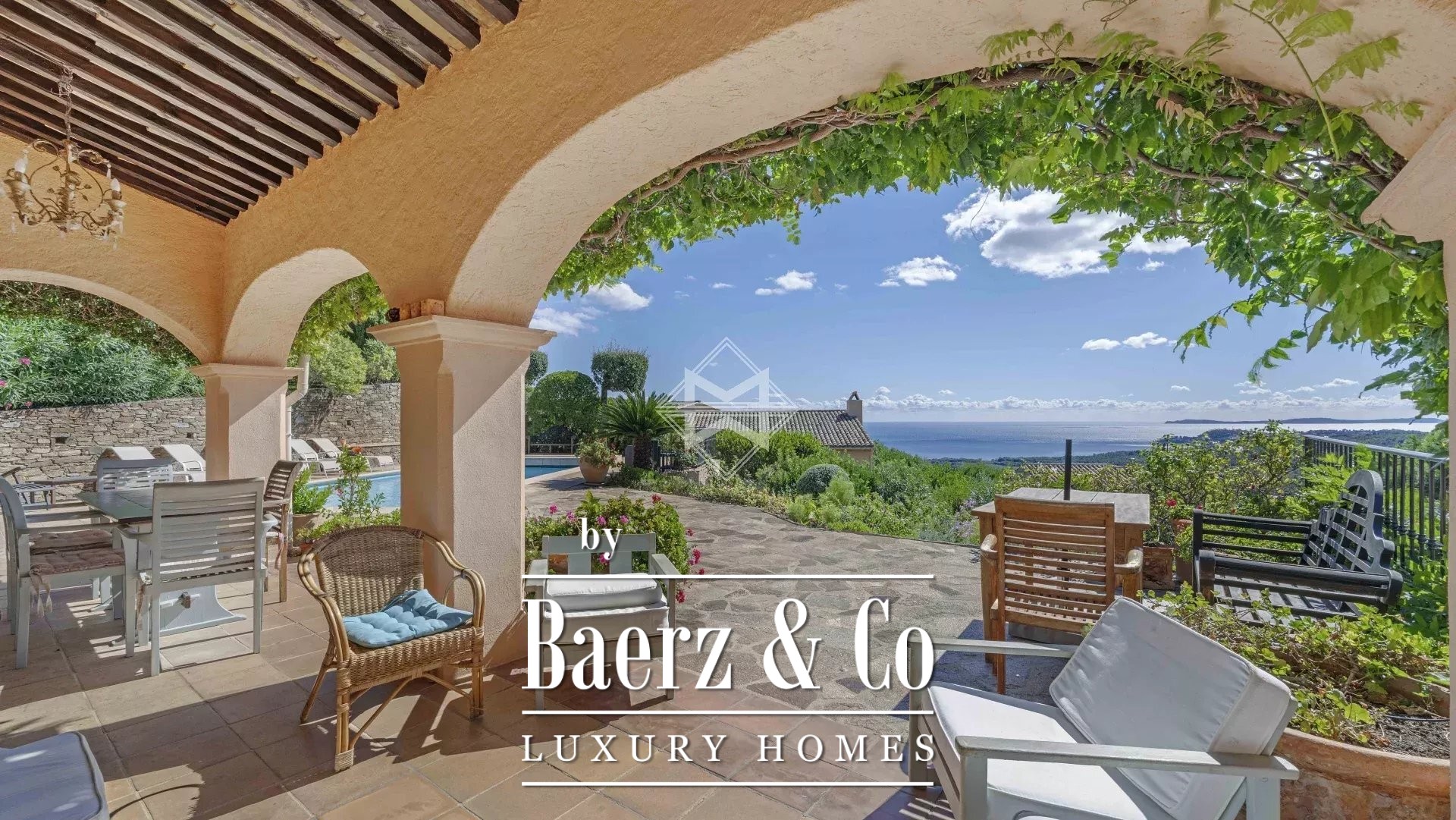 On the garden level, three bedrooms and two shower rooms open onto a spacious, private terrace. An independent apartment includes a kitchen and living room, both opening onto the large terrace and the garden, which features tastefully landscaped terraced grounds.