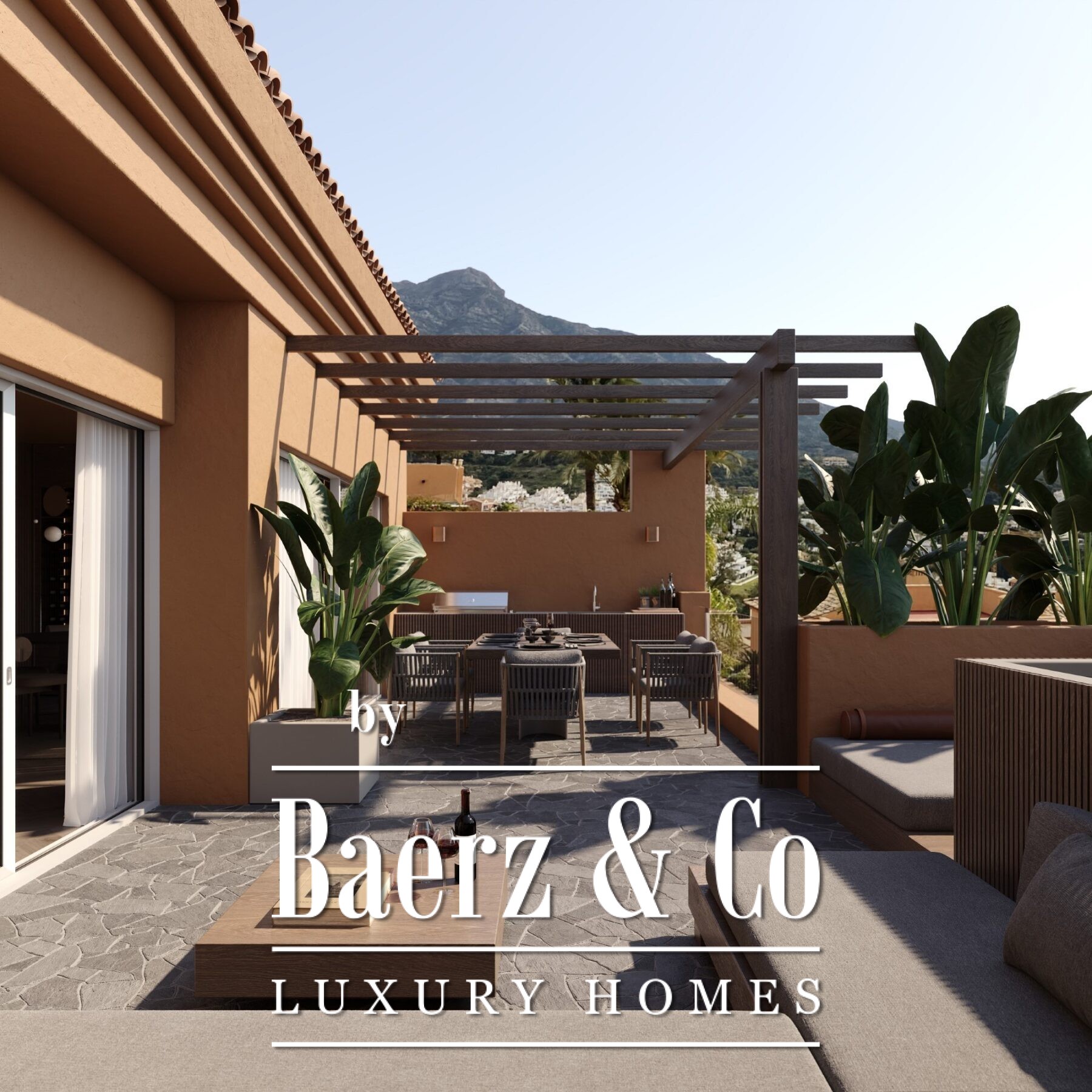 Dit duplex penthouse appartement in Marbella is een toonbeeld van verfijnde moderniteit en biedt 305 m² volledig heringerichte leefruimte, gerealiseerd met compromisloze aandacht voor vakmanschap. De renovatie combineert invloeden uit het midden van de vorige eeuw met hedendaags design; donker eikenhout en parketvloeren zorgen voor warmte, opgelicht door kleinformaat tegels in olijf- en koningsgroen. Vanaf het terras verbinden zee- en bergzicht de woning met het befaamde landschap van Nueva Andalucía.