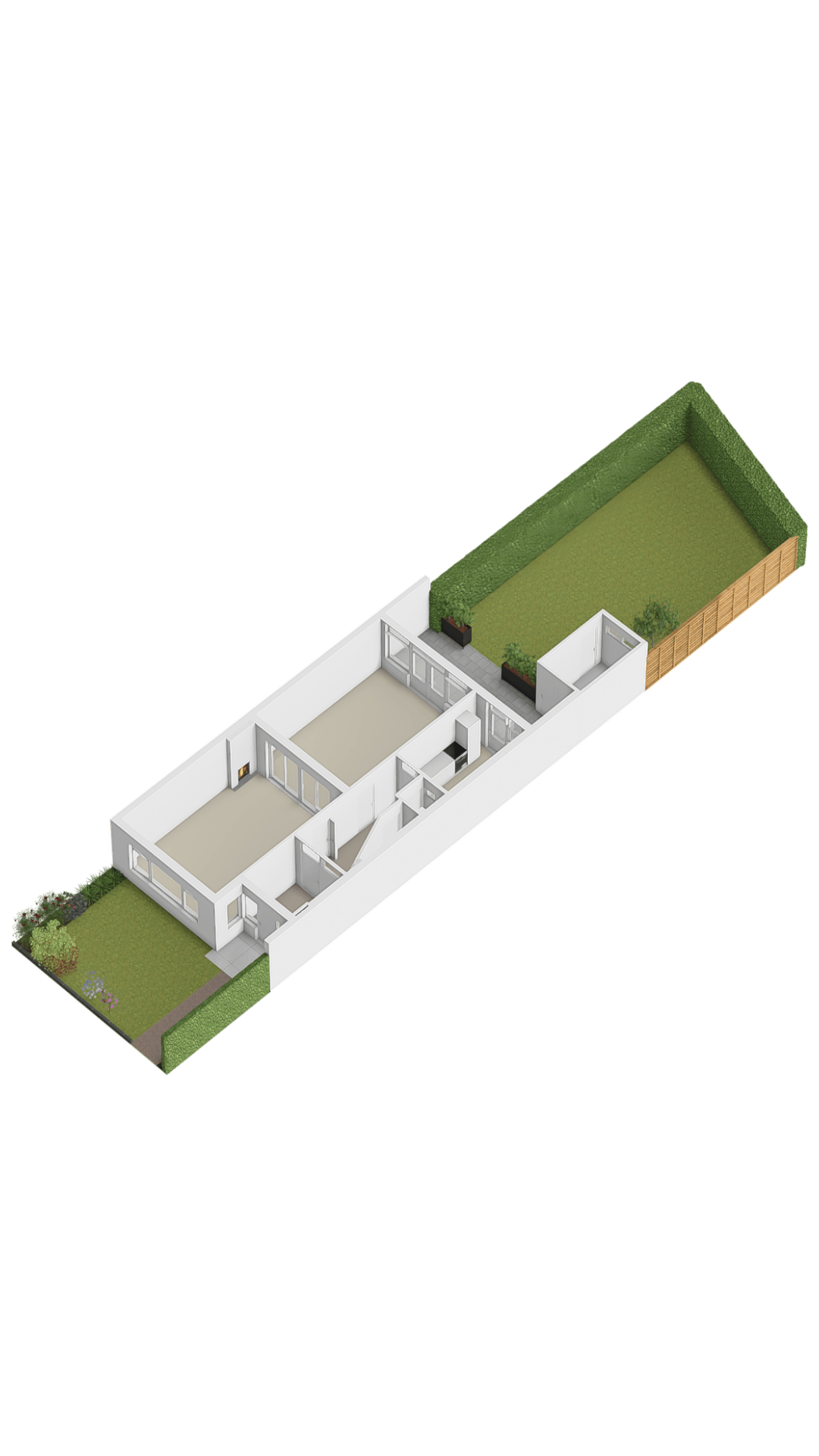 Entree met voorportaal en hal, voorzien van gastentoilet en trapkast. De ruime woonkamer (ca. 60 m²) heeft een houten vloer en en-suitedeuren naar de eetkamer, met openslaande deuren naar de tuin. De moderne keuken is volledig uitgerust en biedt eveneens toegang tot de tuin. De achterzijde grenst niet direct aan buren, waardoor u volop privacy geniet.