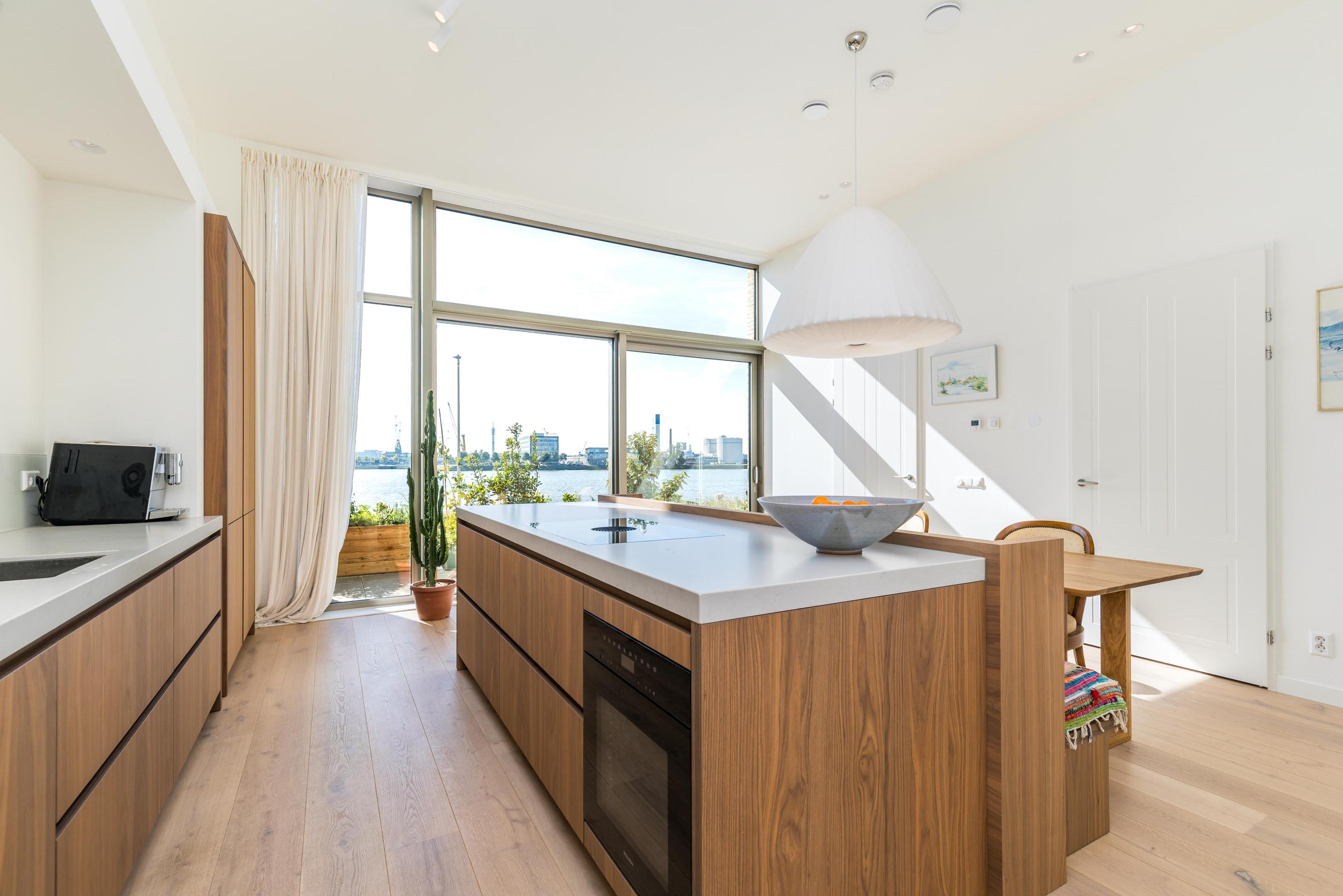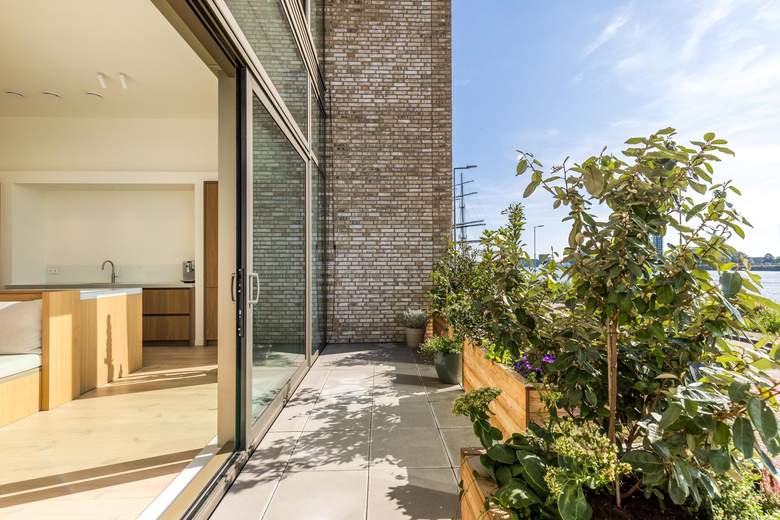 Via uw eigen veranda/zonneterras op de begane grond (gelegen op het zonnige zuiden én aan de Maas) betreedt u de woning. Hier bevindt zich de zeer luxe woonkeuken, volledig uitgerust en ontworpen om te genieten, of u nu een intiem diner organiseert of uitgebreid kookt voor vrienden en familie. Direct aangrenzend is er een ruime inpandige berging, ideaal voor extra opslag.