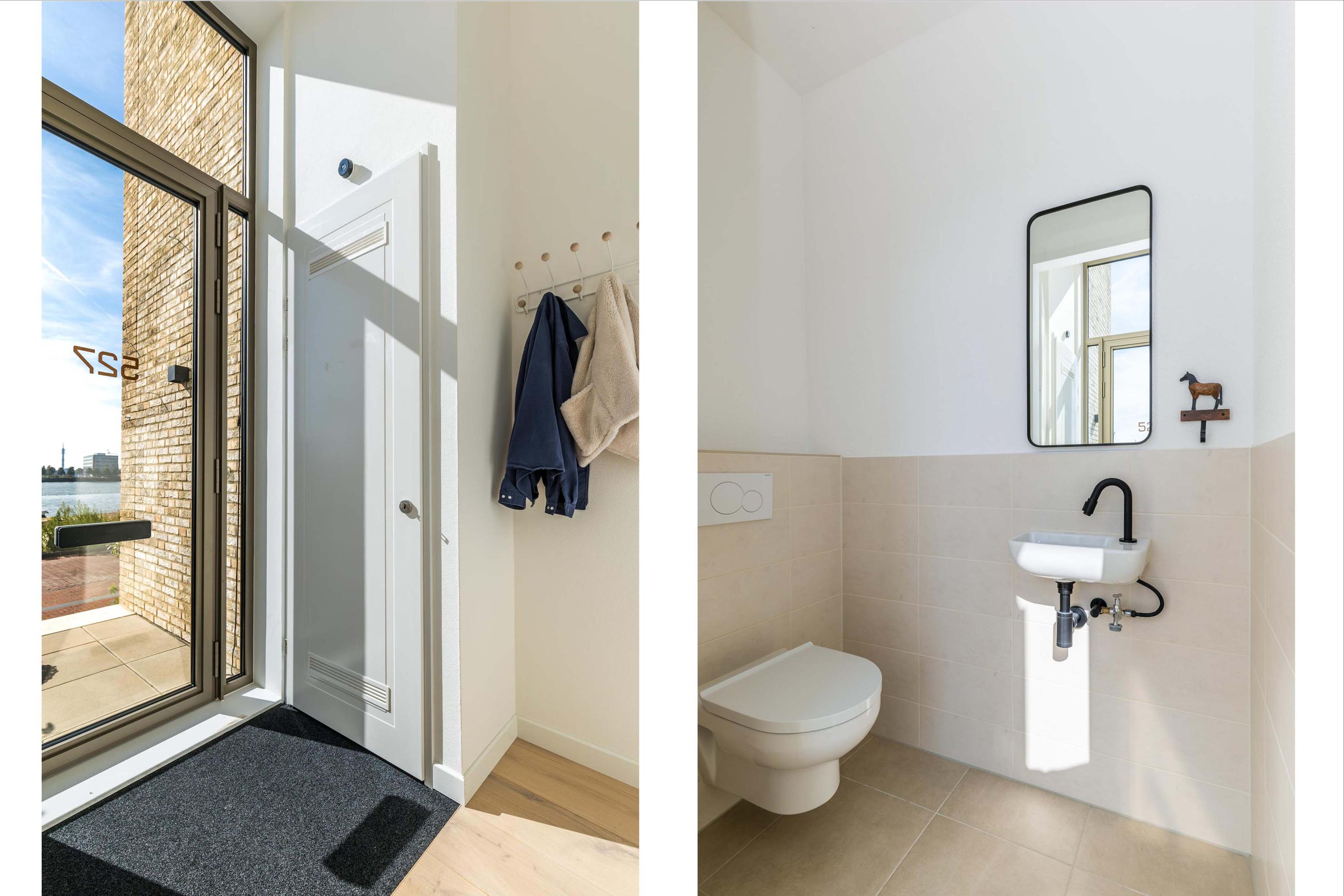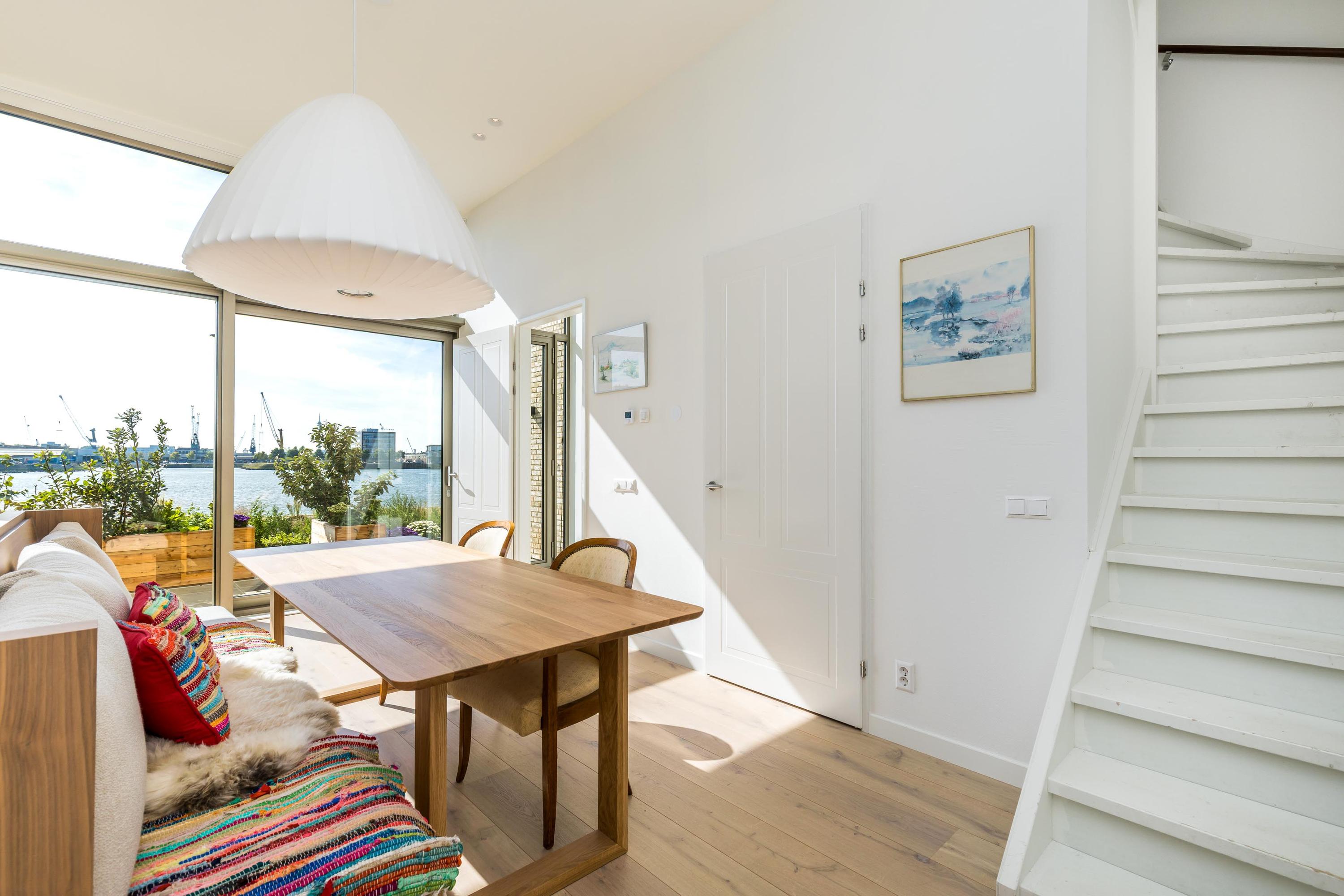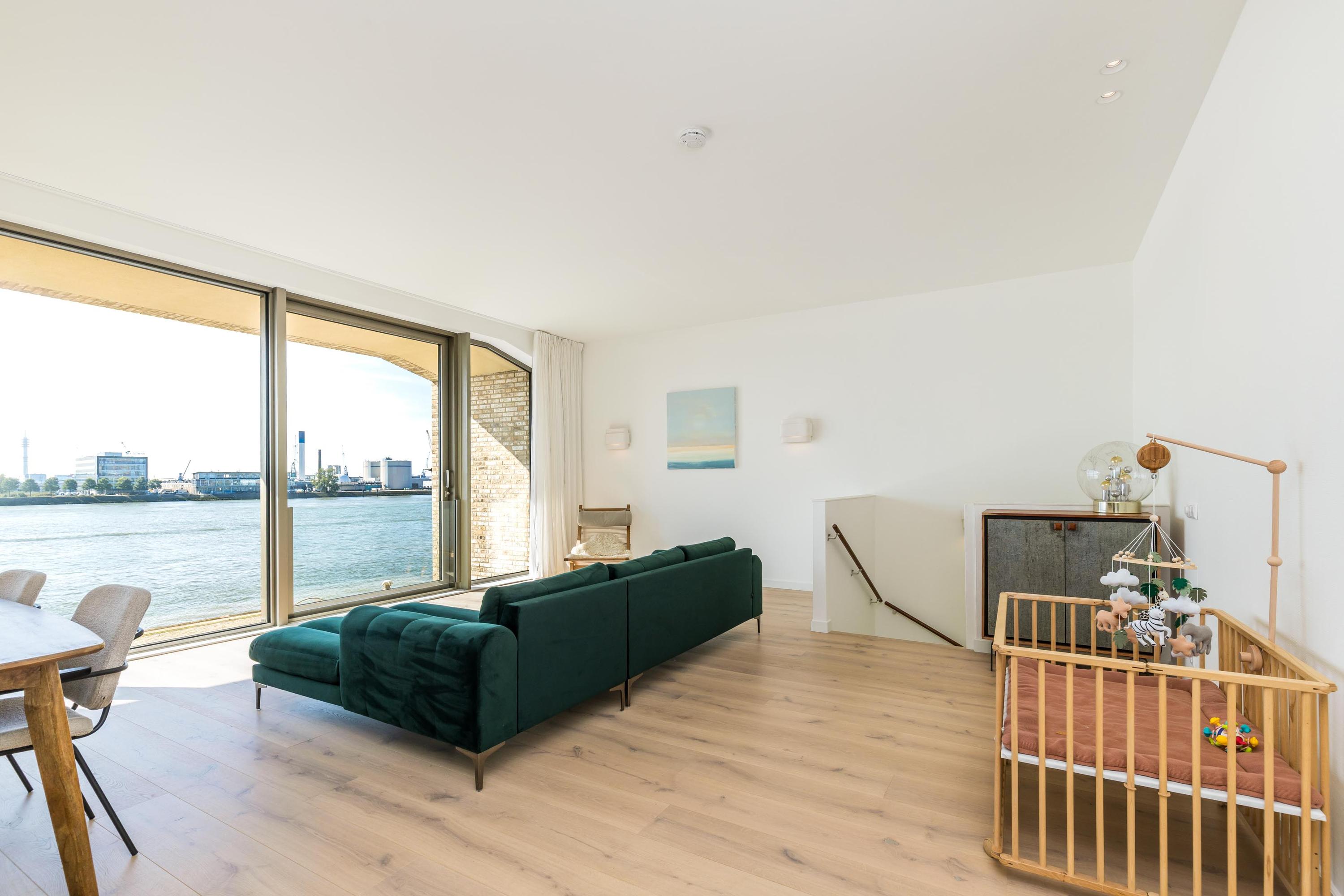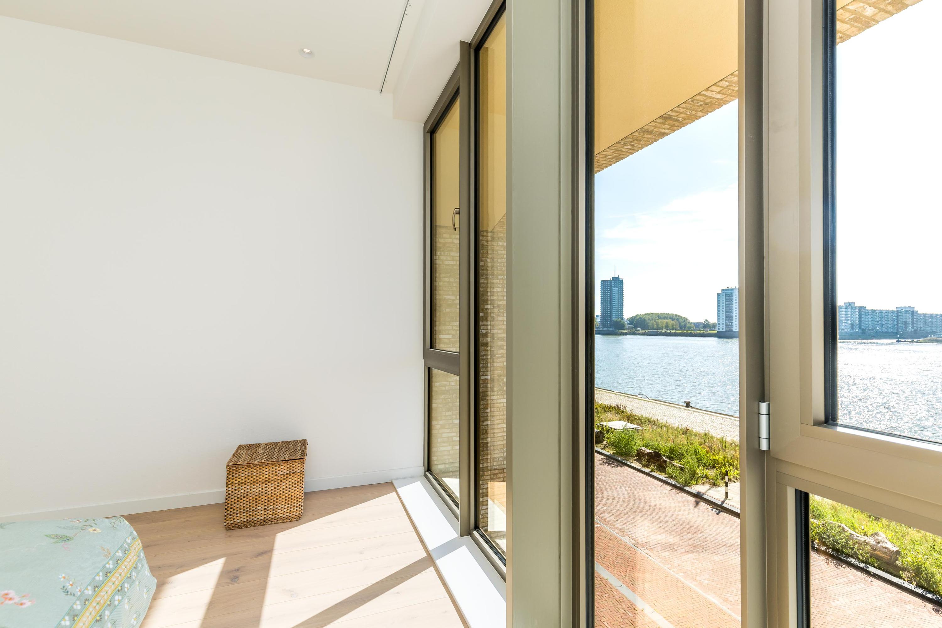 De eerste verdieping is ingericht als woonverdieping en biedt een royale living met ramen van vloer tot plafond, waardoor het uitzicht over het water naadloos onderdeel wordt van uw interieur. Alle slaapkamers en de woonkamer kijken uit over de Maas. Er zijn momenteel twee slaapkamers, maar een derde behoort eenvoudig tot de mogelijkheden.