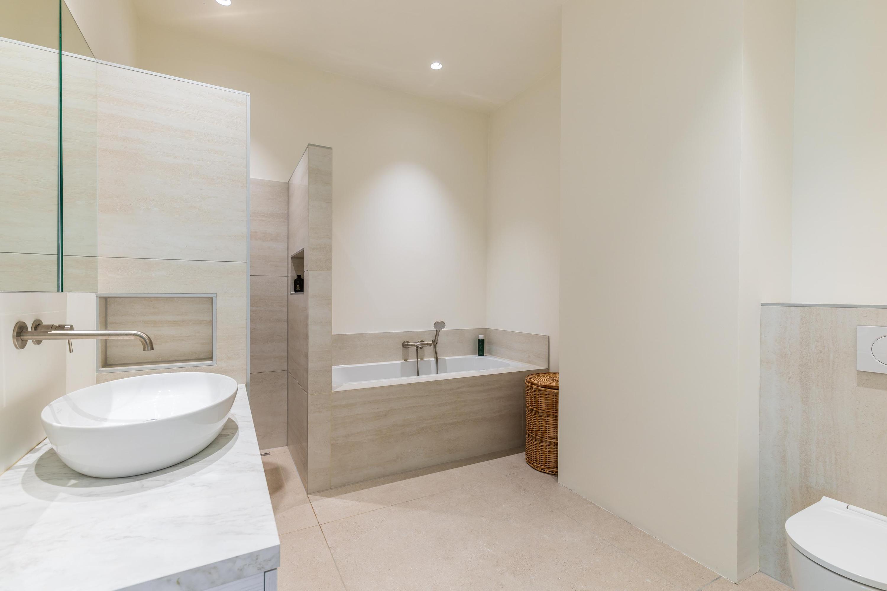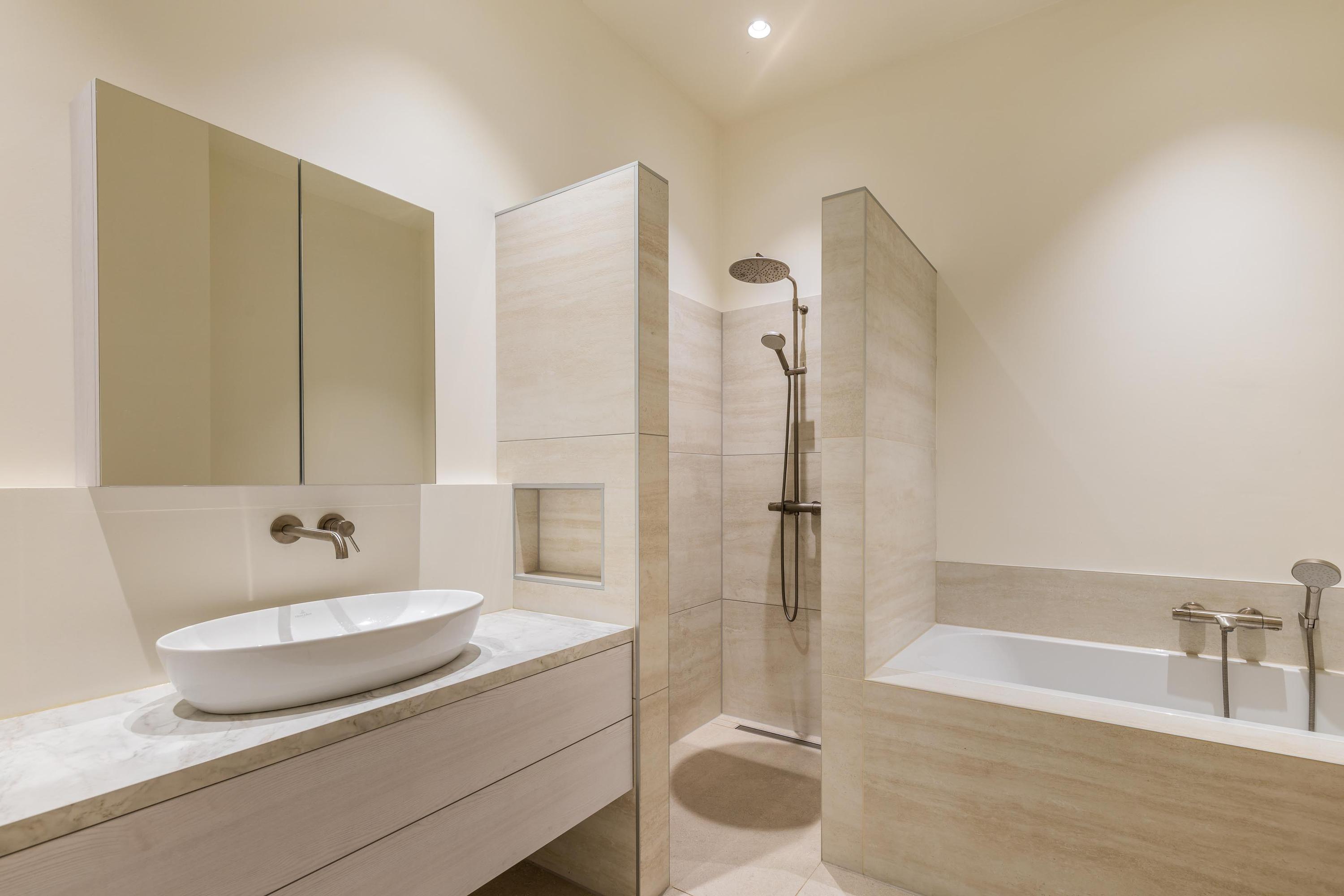 De badkamer is bijzonder royaal en stijlvol uitgevoerd, met een ligbad, inloopdouche, toilet en een groot wastafelmeubel.