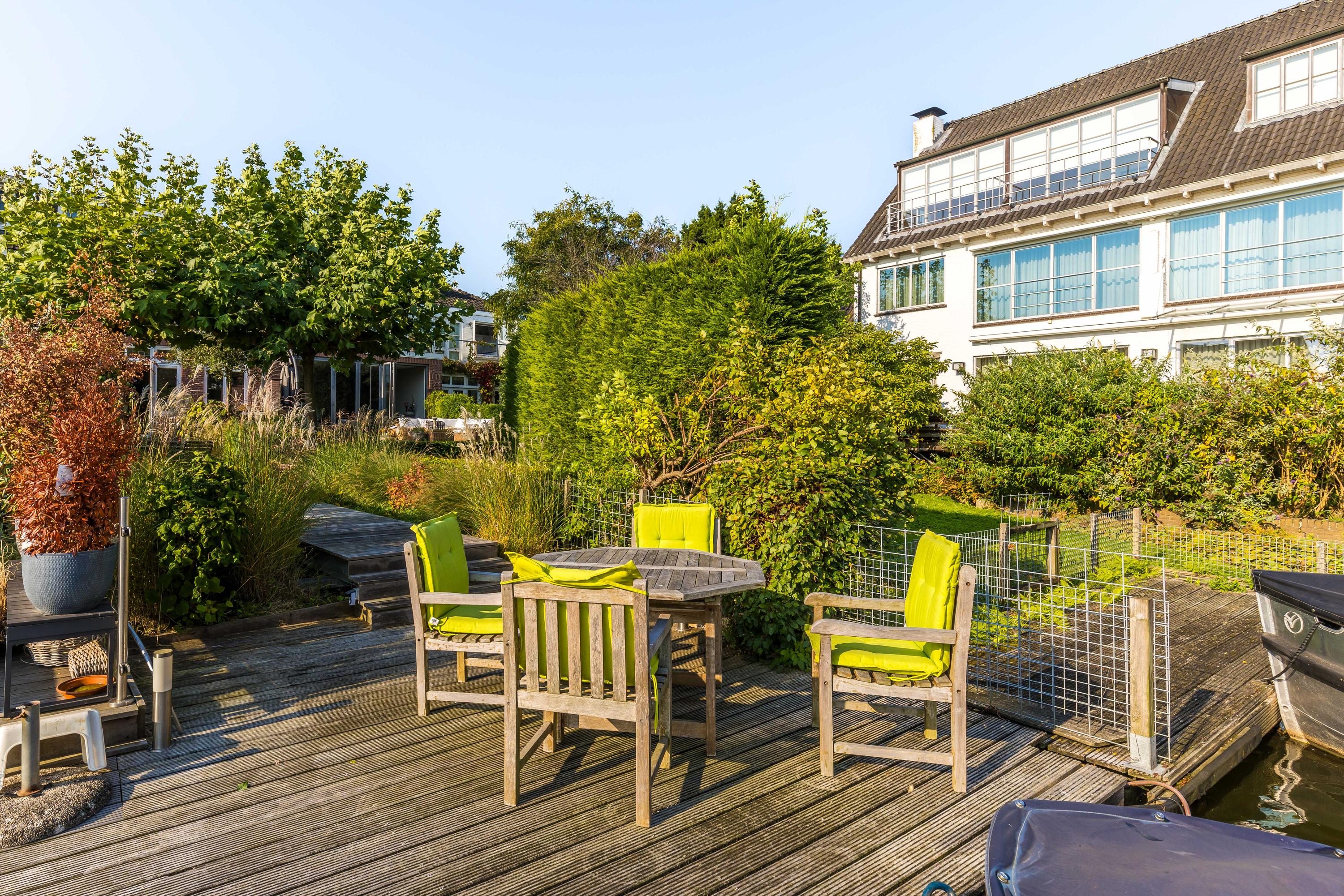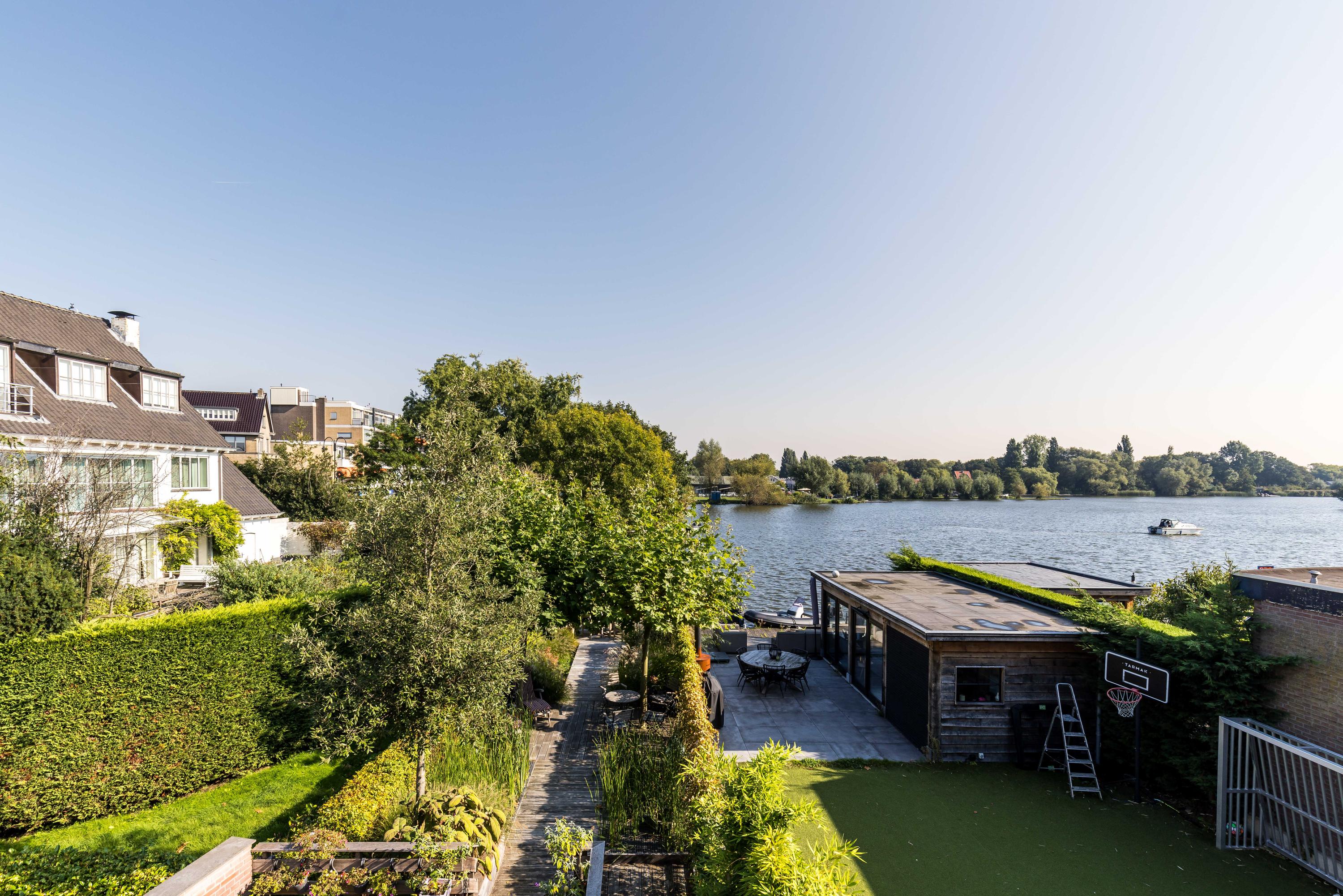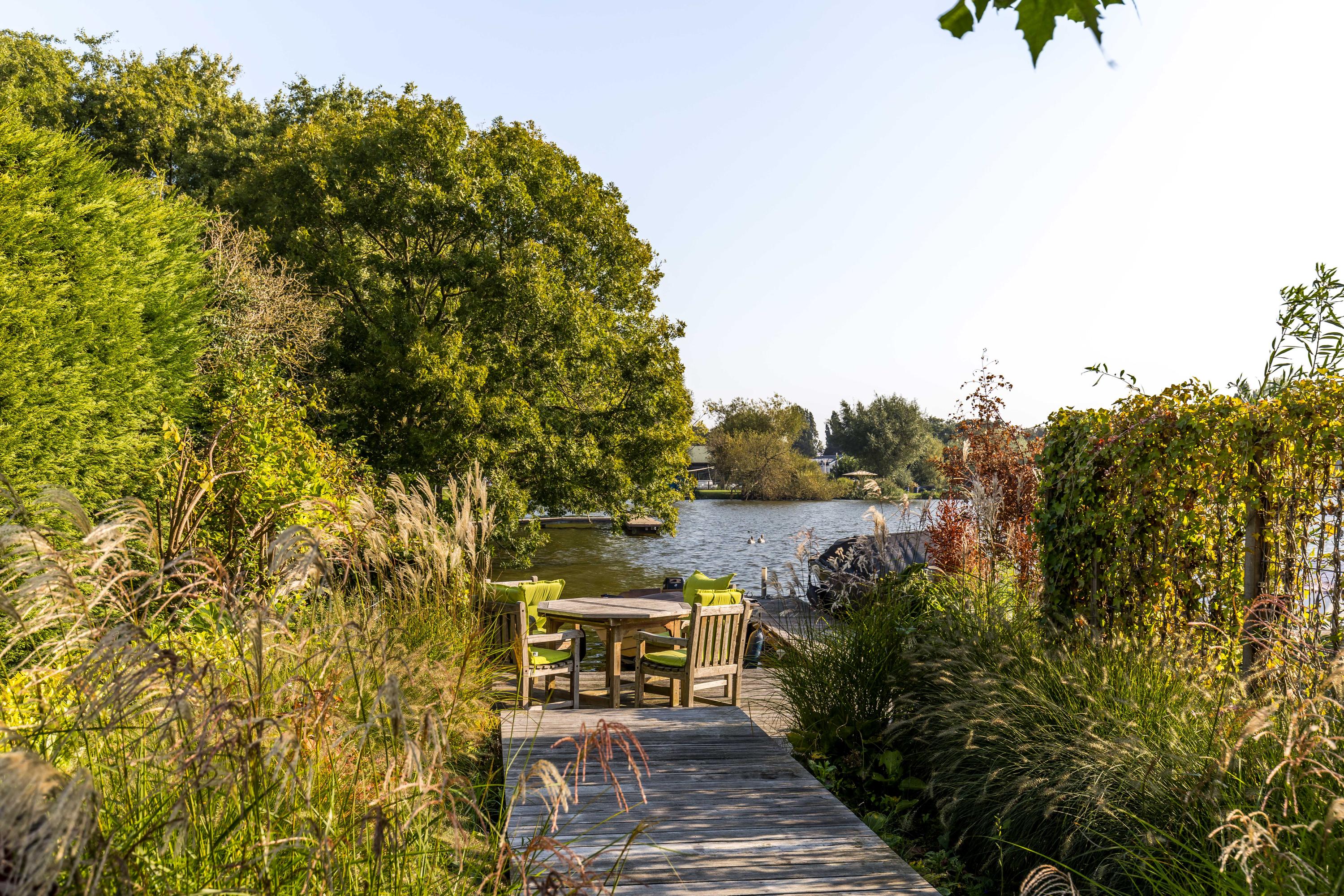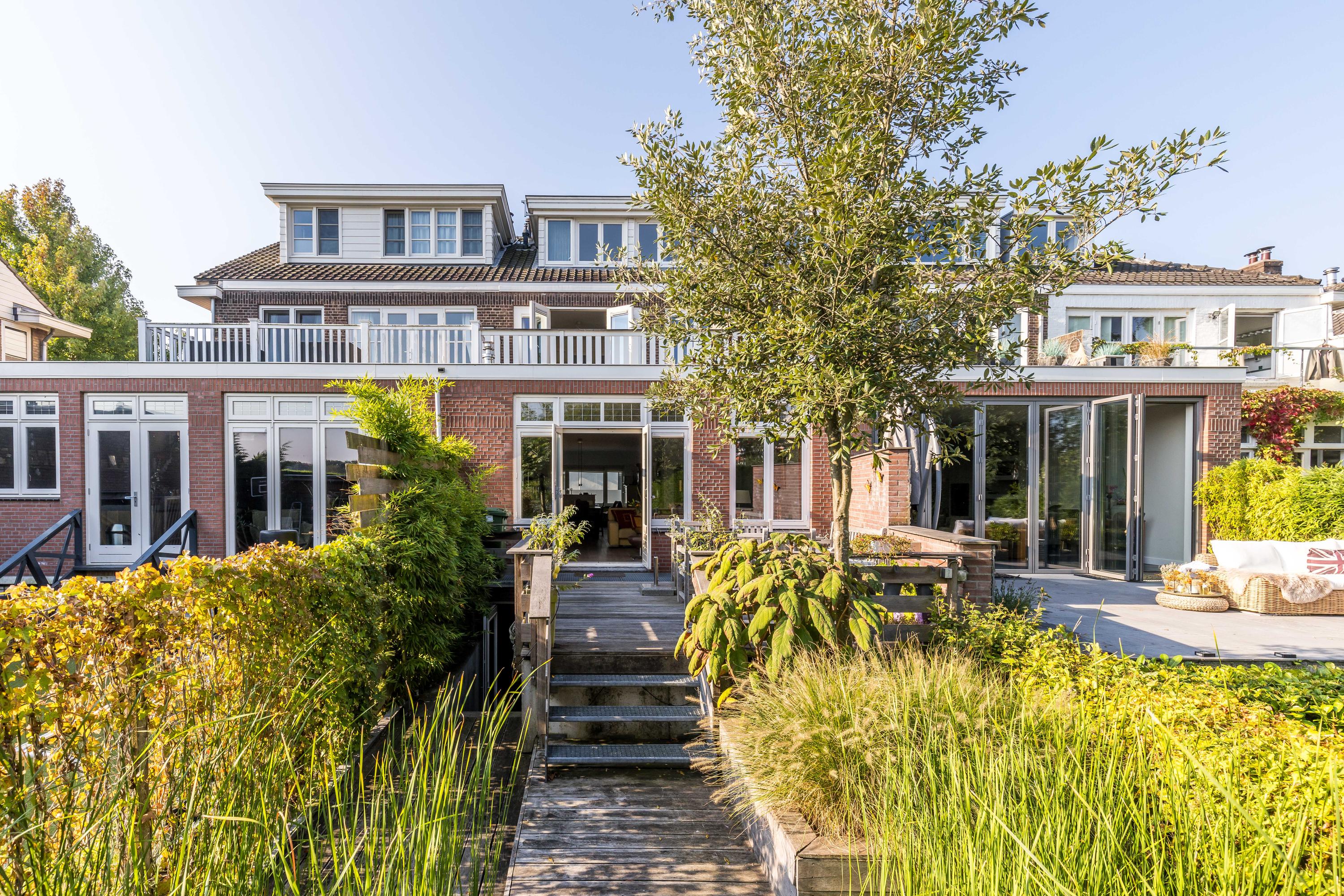 Achtertuin: gelegen op het noordoosten, maar vanwege de diepte van ruim 20 meter vanaf de uitbouw begane grond biedt de tuin het overgrote deel van de dag zon. De achtertuin loopt wat tabs toe, begint bij het huis met een breedte van ca. 6 meter en bij de waterkant ca. 3 meter.