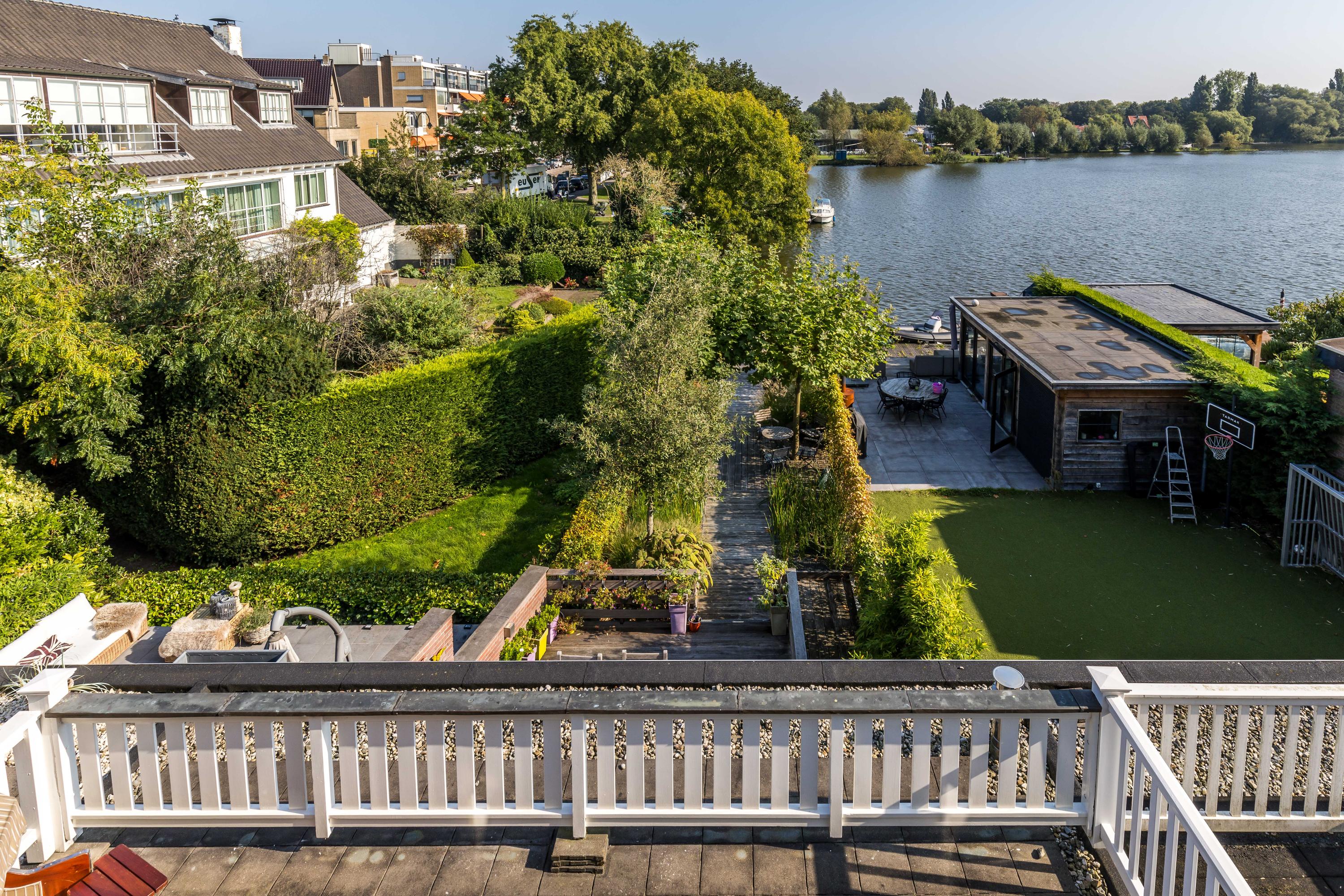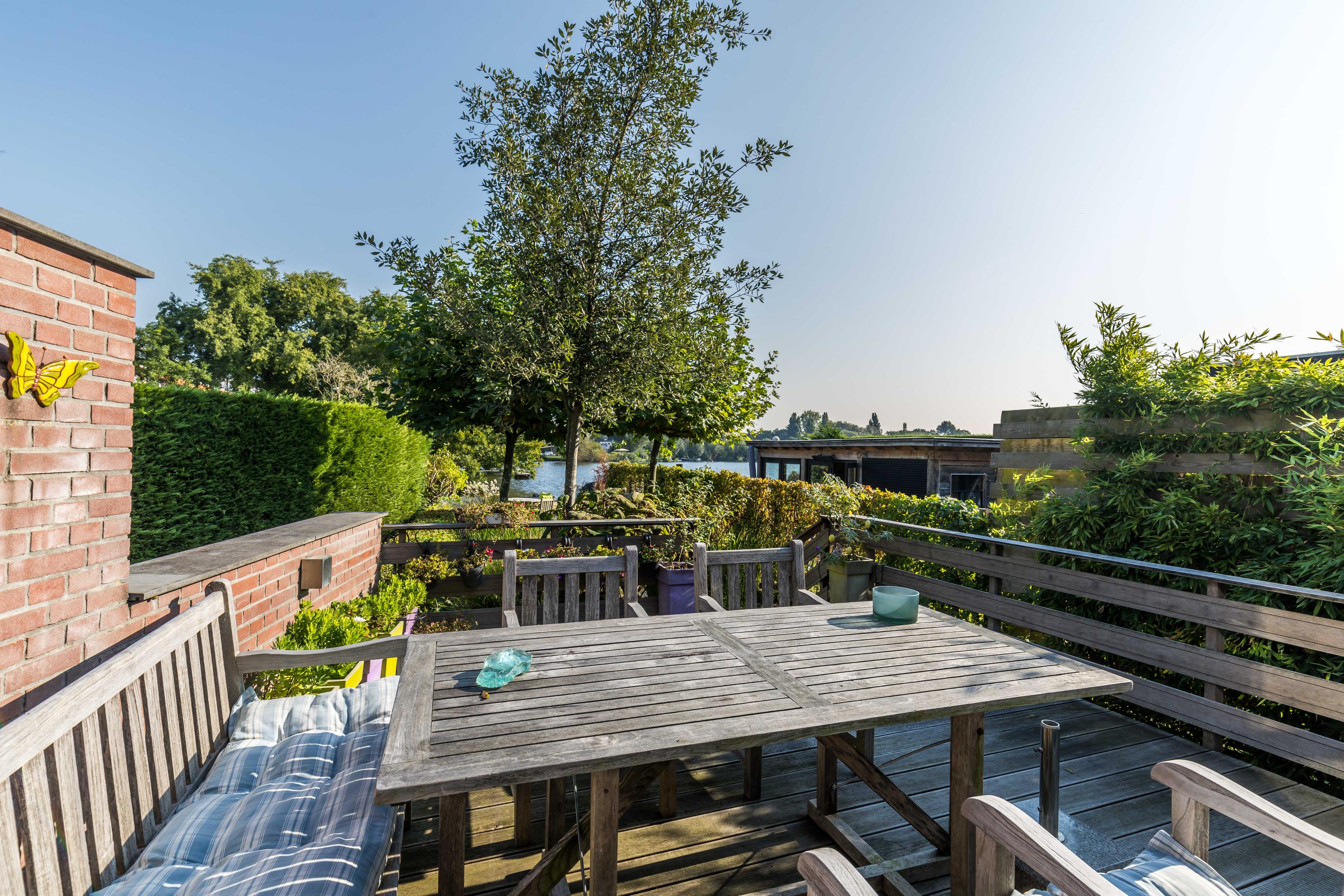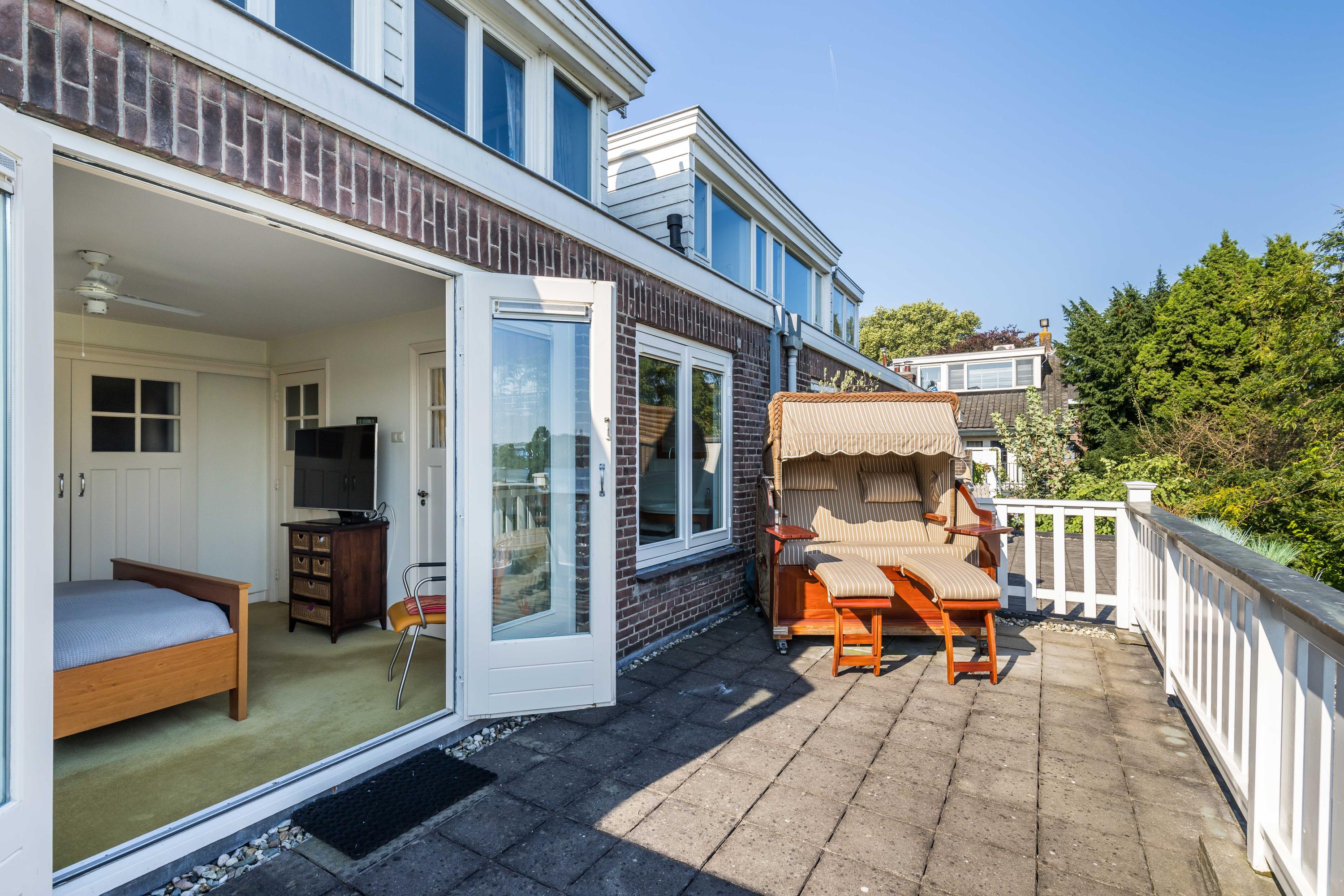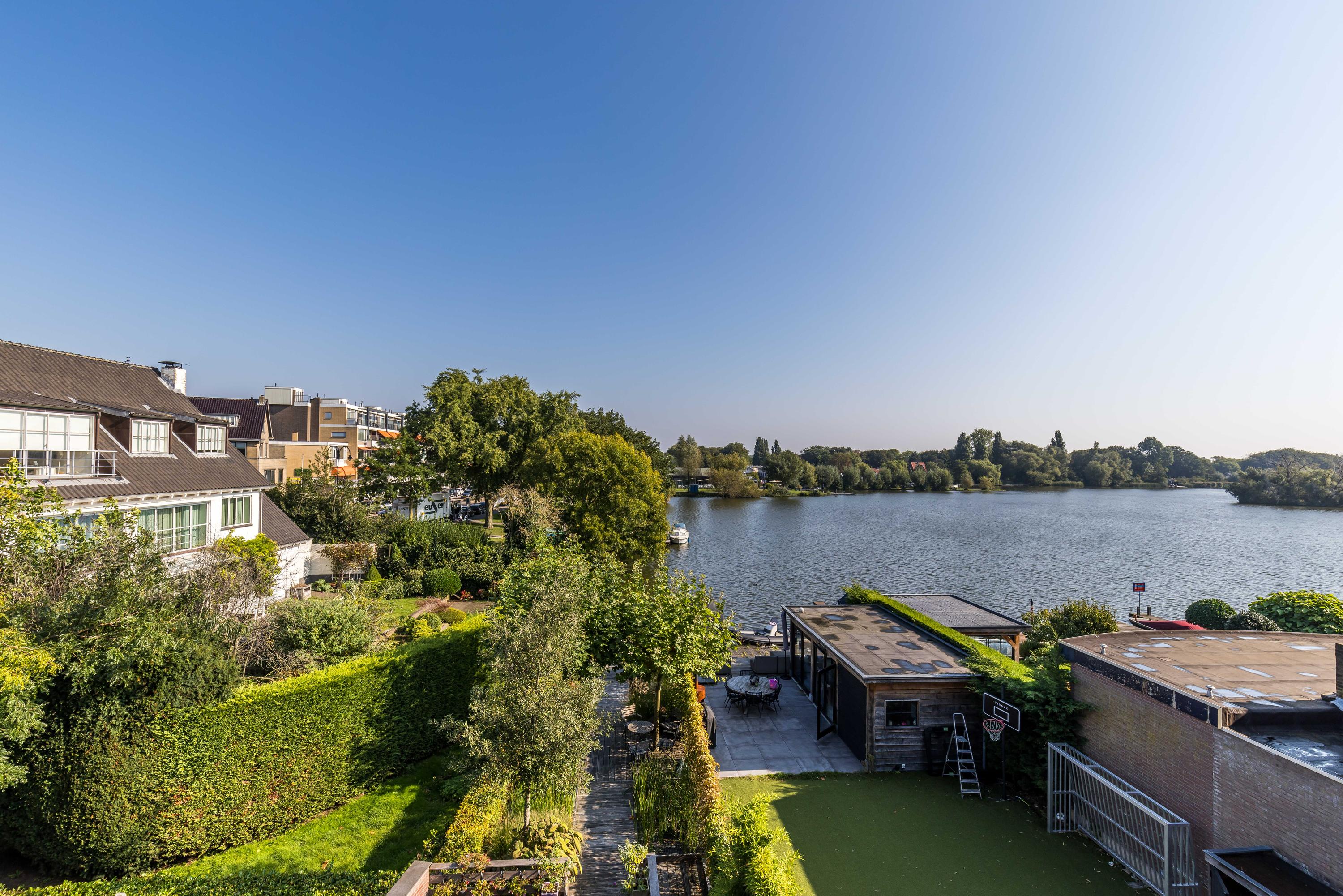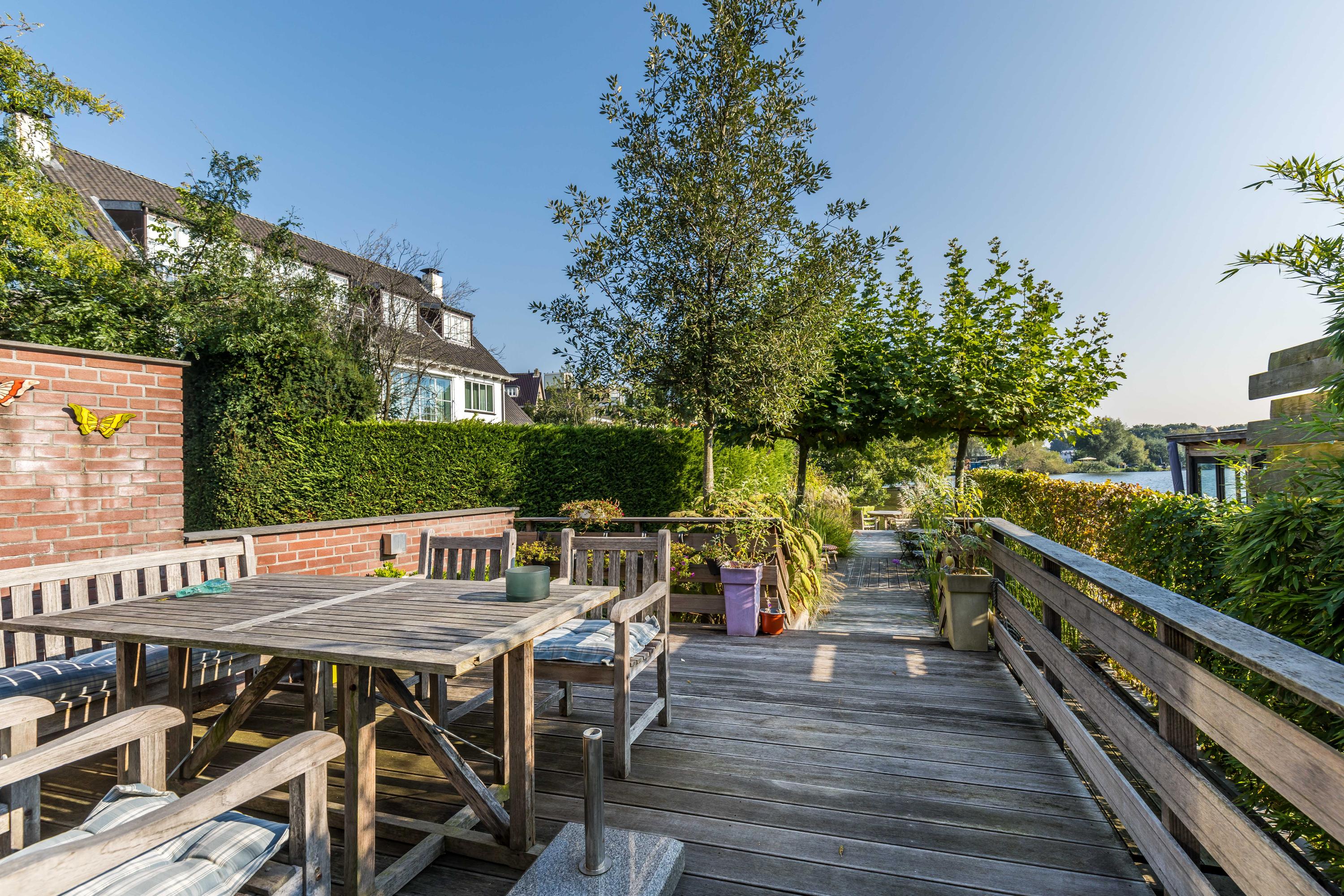 Achtertuin: gelegen op het noordoosten, maar vanwege de diepte van ruim 20 meter vanaf de uitbouw begane grond biedt de tuin het overgrote deel van de dag zon. De achtertuin loopt wat tabs toe, begint bij het huis met een breedte van ca. 6 meter en bij de waterkant ca. 3 meter.