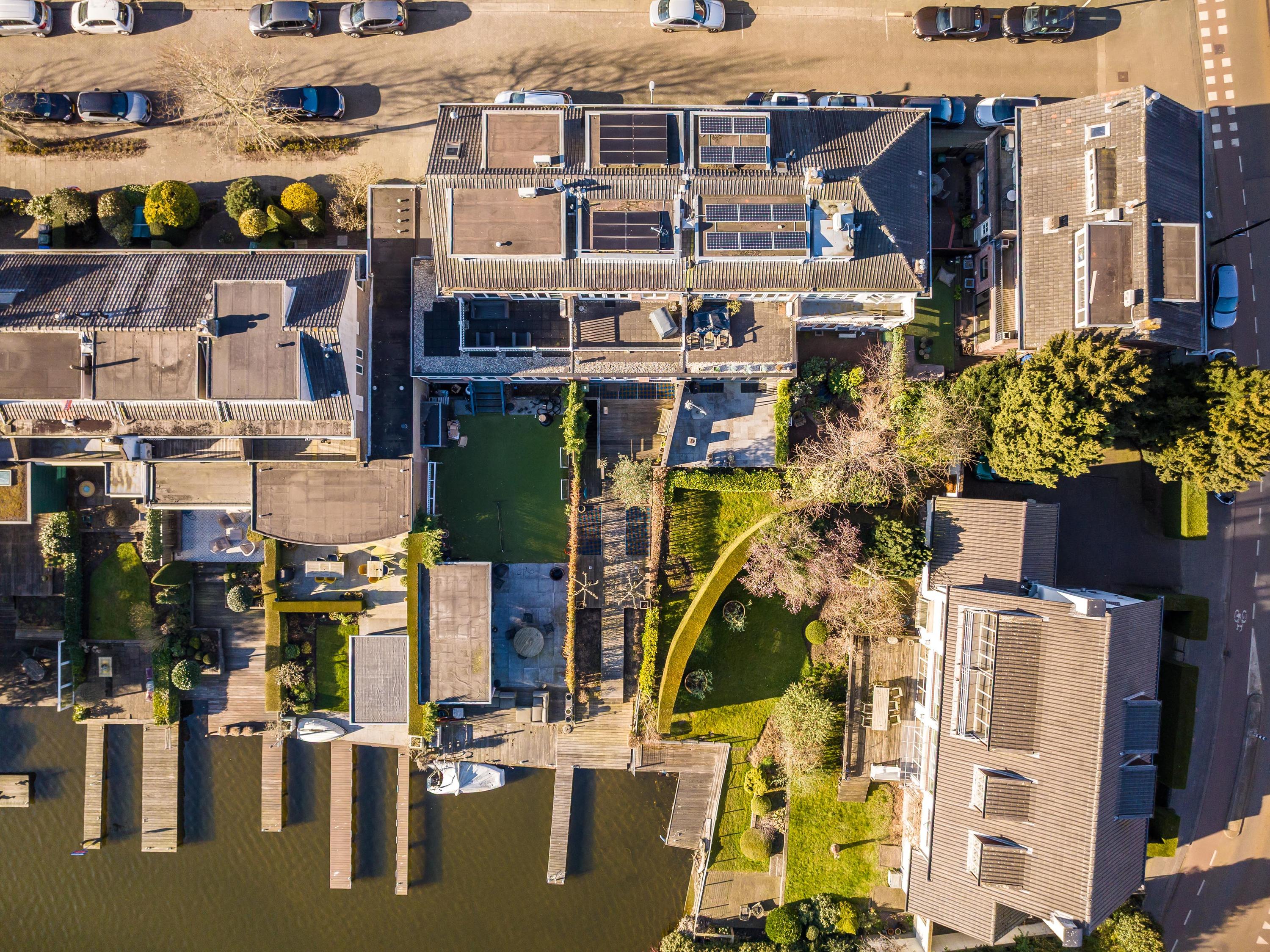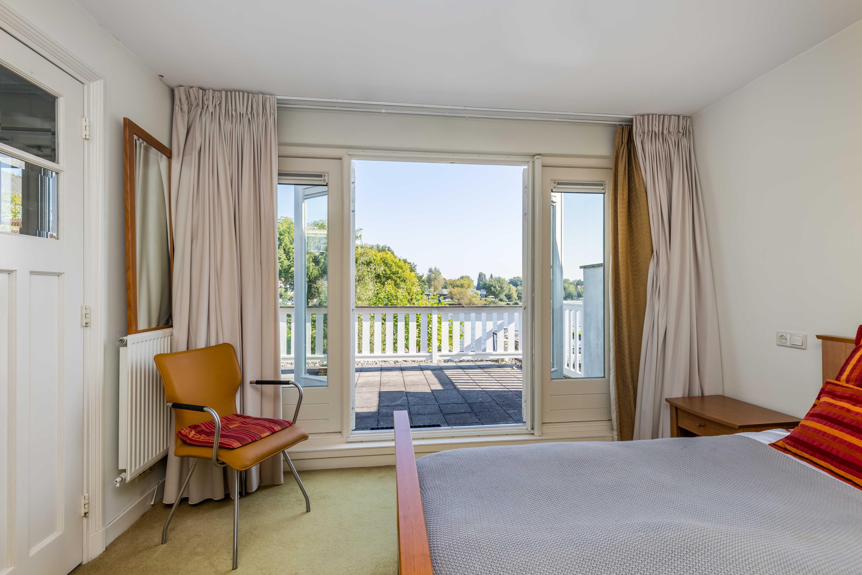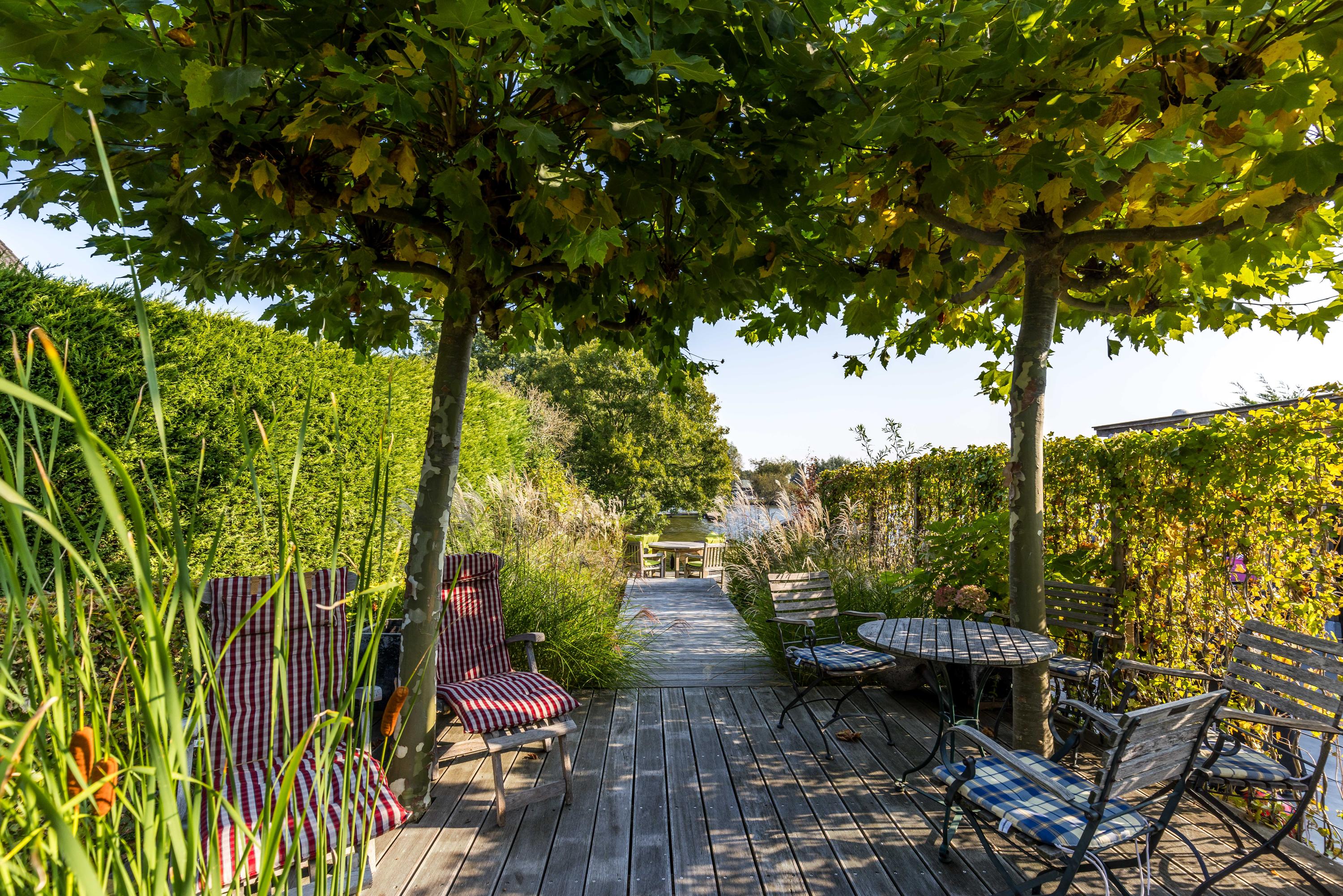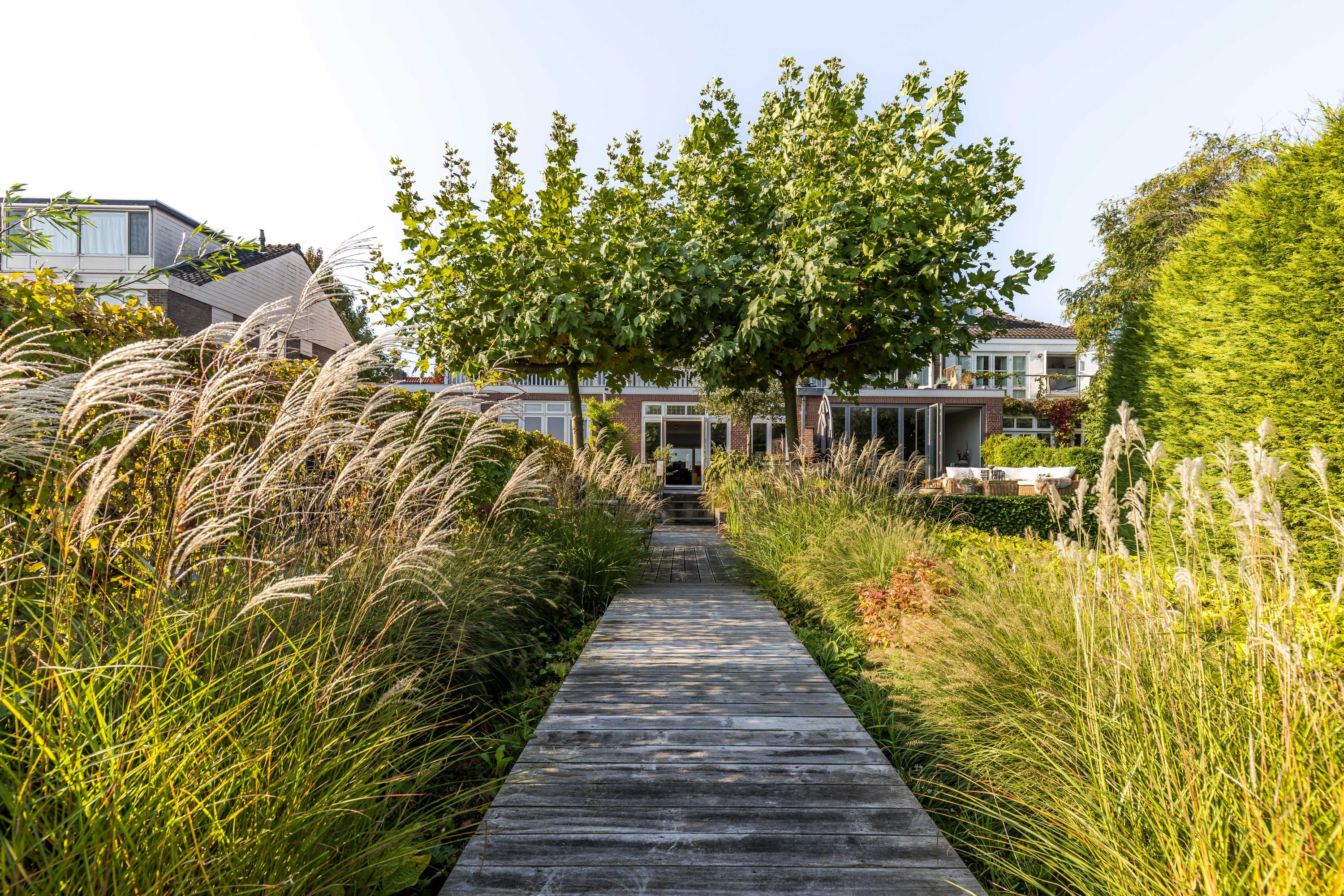 Achtertuin: gelegen op het noordoosten, maar vanwege de diepte van ruim 20 meter vanaf de uitbouw begane grond biedt de tuin het overgrote deel van de dag zon. De achtertuin loopt wat tabs toe, begint bij het huis met een breedte van ca. 6 meter en bij de waterkant ca. 3 meter.