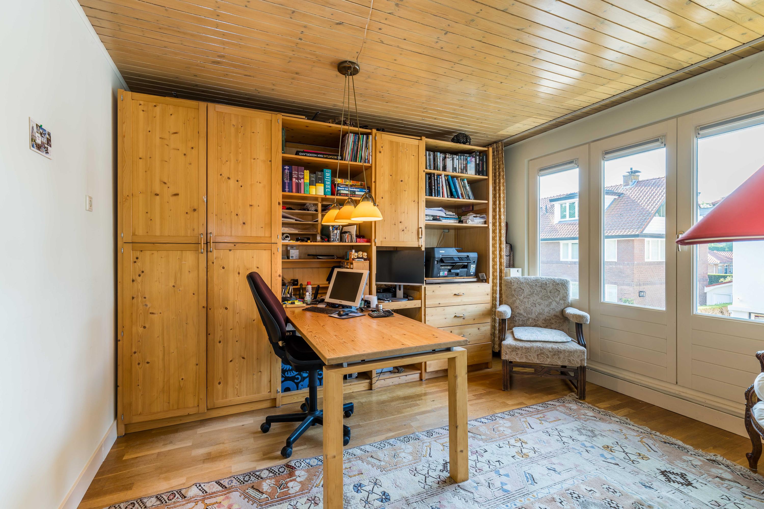 Eerste verdieping: brede overloop met separaat toilet v.v. WC en fonteintje, hoofdslaapkamer achterzijde met vaste kastenwand, en suite badkamer en openslaande deuren naar het royale dakterras. De badkamer is v.v. WC, douche, duo-hoekligbad en wastafelmeubel. Voorts zijn er nog 2 slaapkamers aan de voorzijde.