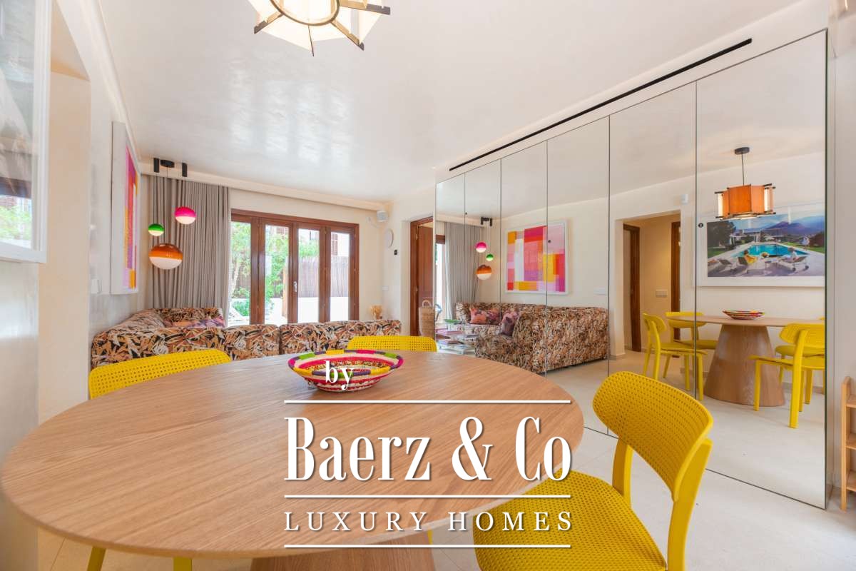is praktisch ingedeeld en sluit subtiel aan op de leefruimte. Beide slaapkamers bieden rust en privacy, terwijl de badkamers zijn uitgevoerd met hoogwaardige materialen en een verfijnde afwerking. Elk element is zorgvuldig gekozen – design en comfort gaan hier hand in hand.De buitenruimtes Het buitengedeelte van 72 m² maakt deze woning echt bijzonder. Er is een ruime terras met een stijlvolle loungehoek en een eettafel – perfect voor lange avonden van buiten dineren. Het grote privézwembad is een absoluut hoogtepunt: ideaal om af te koelen op warme dagen. Dit is een plek die gemaakt is voor het buitenleven: ontspannen ontbijten in de ochtend, een goed glas wijn in de namiddag, en zwoele zomeravonden met vrienden onder de sterren.Dit appartement is ideaal voor wie op zoek is naar kwaliteit, comfort en een zorgeloos thuis op Ibiza. Een zeldzame kans in het hart van Santa Gertrudis. We nodigen u graag uit voor een bezichtiging zodat u zelf kunt ervaren hoe bijzonder deze plek is.