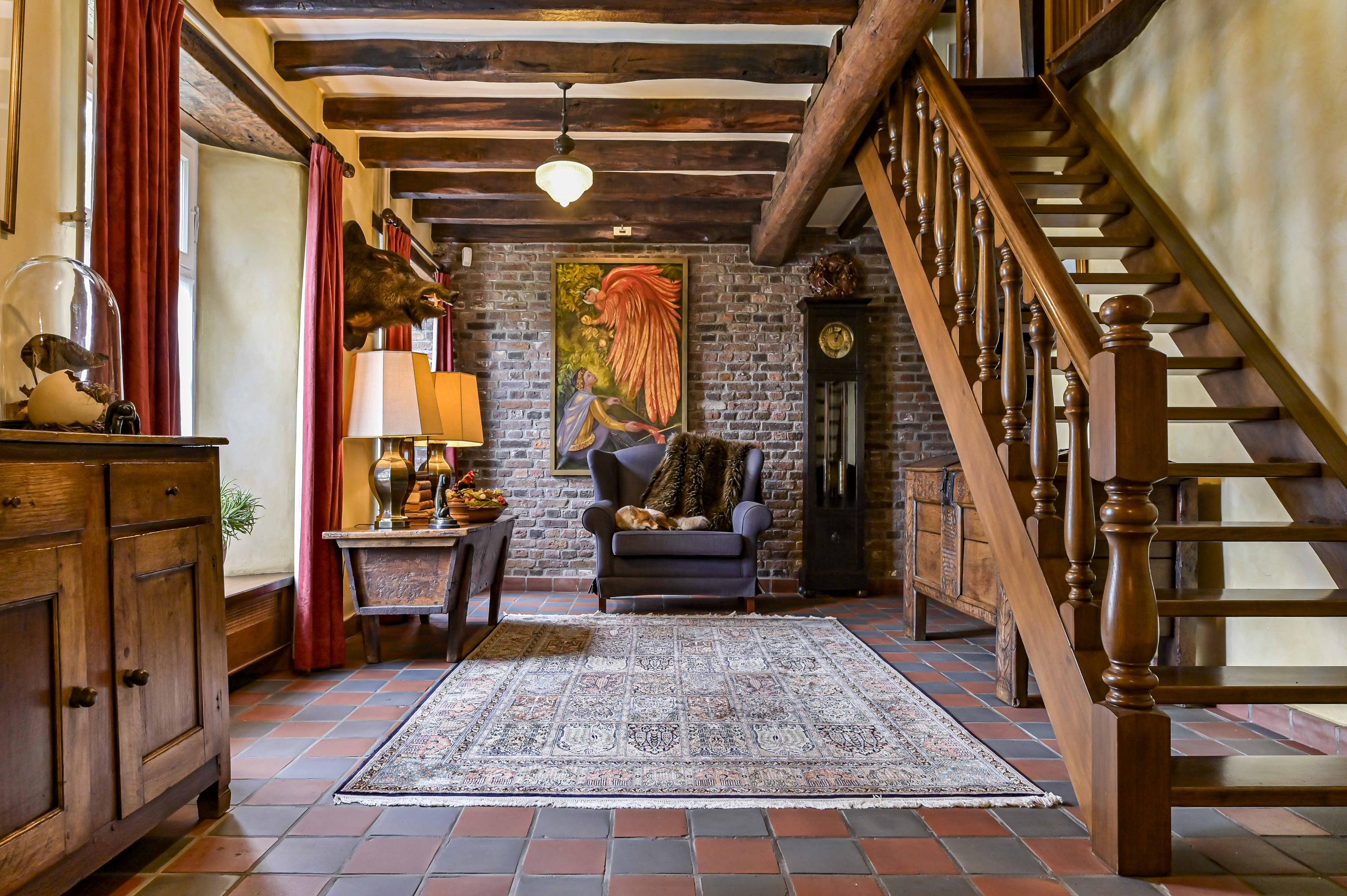 Prachtige, royale woonkamer (ca. 81m²) met ramen rondom die zorgen voor overal een natuurlijke lichtinval. Er zijn een zeer grote open haard/schouw aanwezig en een unieke houten bar. Openslaande deuren bieden toegang tot de binnentuin en een serre.