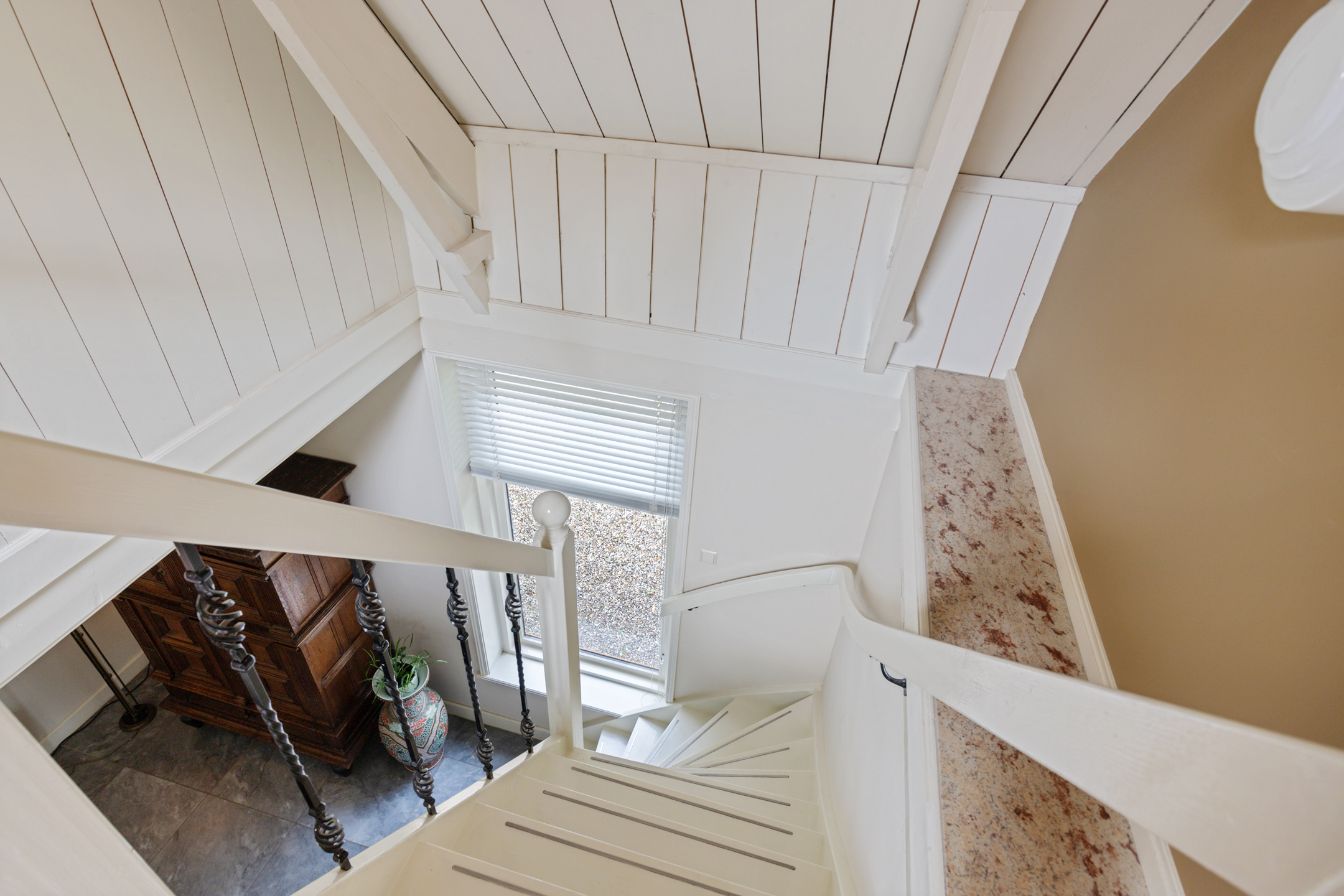 De badkamer en witgoedruimte zijn afgesloten ruimtes onder de rechter loft.