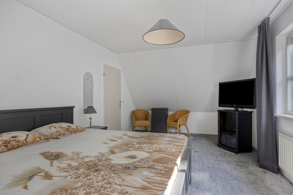 De sfeervolle woonkamer is opvallend licht dankzij de grote erker aan de voorzijde en het brede raam aan de zijkant. De zithoek rondom de open haard vormt een gezellige plek voor lange avonden met familie of vrienden. Richting de achterzijde is ruimte voor een royale eethoek bij de open keuken. De keuken is een U-opstelling met schiereiland, voorzien van crèmekleurige fronten, donker werkblad en complete inbouwapparatuur: een inductiekookplaat, vlakscherm afzuigkap, combimagnetron, oven, koel-/vriescombinatie en een vaatwasser. Aansluitend ligt de praktische bijkeuken met witgoedaansluitingen, opbergruimte en een buitendeur naar het terras. Tot slot bevindt zich op de begane grond een extra kamer – ideaal als thuiskantoor, hobbyruimte, speelkamer of slaapkamer. Via deze kamer bereikt u binnendoor de badkamer – met douche, toilet en wastafel – handig voor wie levensbestendig wil wonen of gasten ontvangt. Daarnaast zijn de deuren op de begane grond breed waardoor ze ook toegankelijk zijn voor een rolstoel.