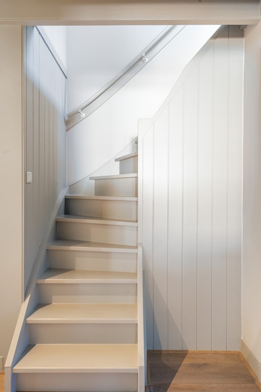 Aan de achterzijde bevindt zich de royale eethoek, voorzien van airconditioning, met directe toegang tot de moderne keuken. Deze is uitgerust met diverse hoogwaardige inbouwapparatuur, waaronder een Miele stoomoven en tweede oven, inductiekookplaat, Quooker en een ruime Liebherr-koelkast. Aansluitend bevindt zich de bijkeuken met extra bergruimte, aansluitingen voor wasmachine en droger, en toegang tot de achtertuin.
