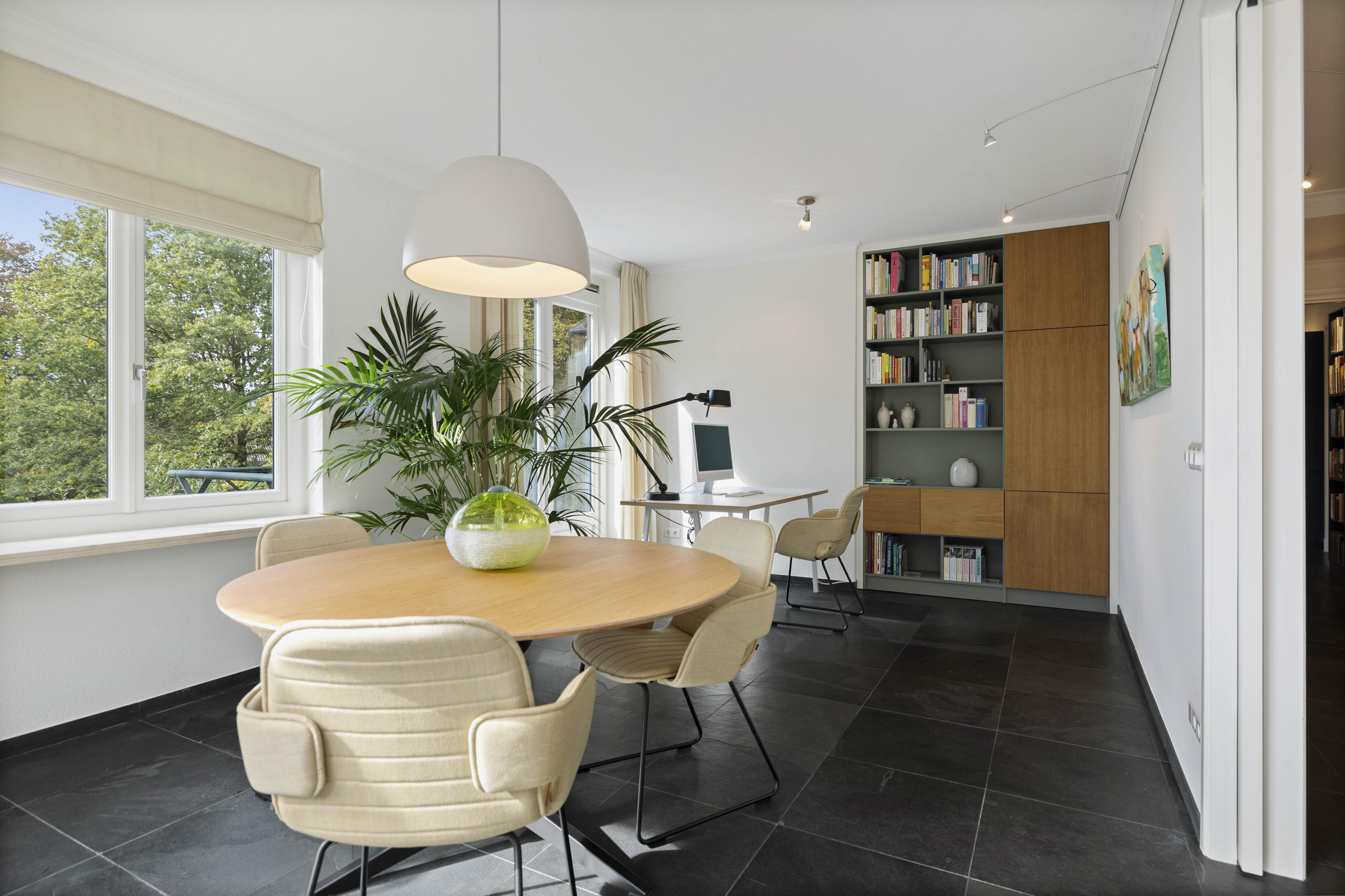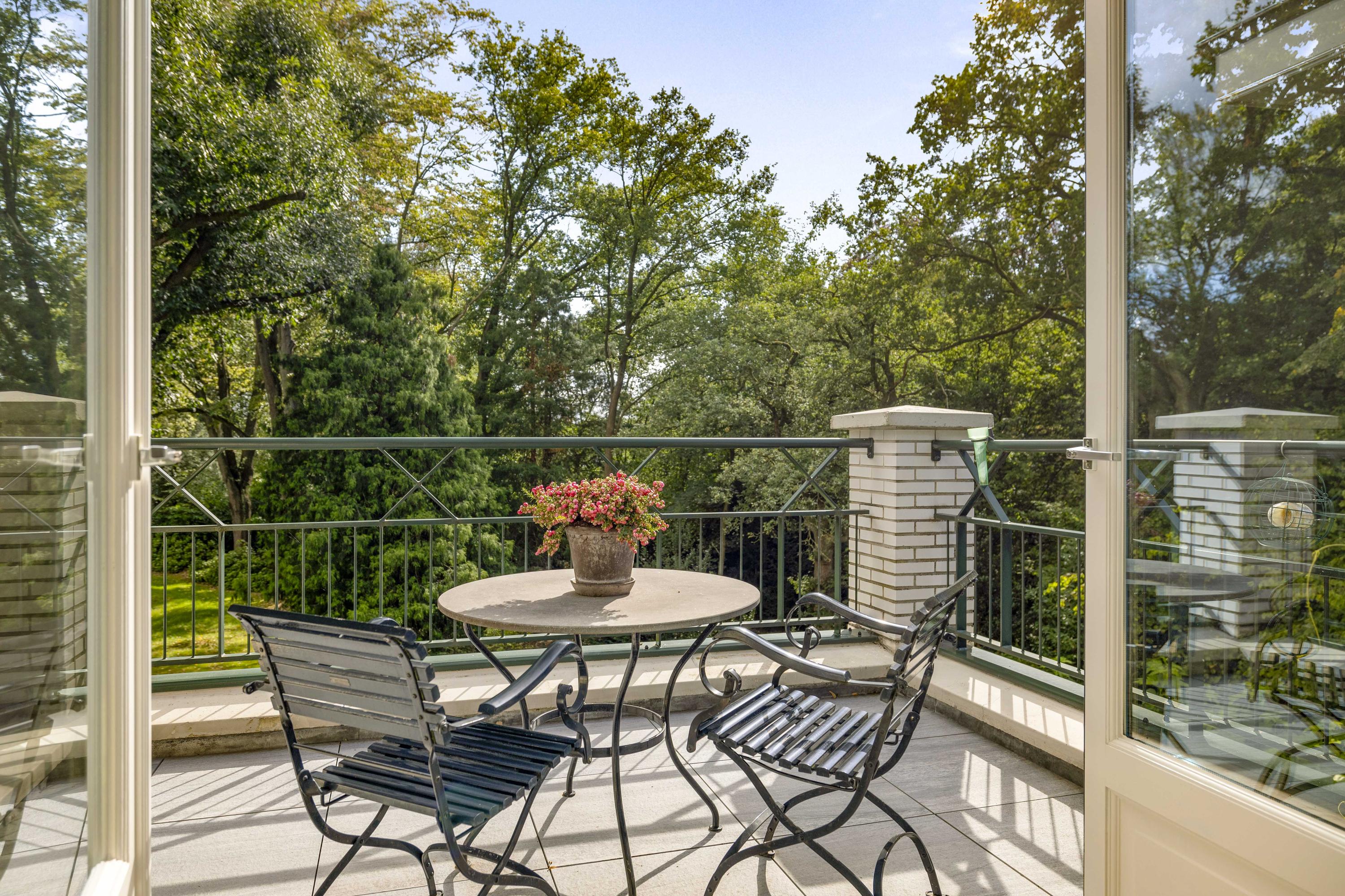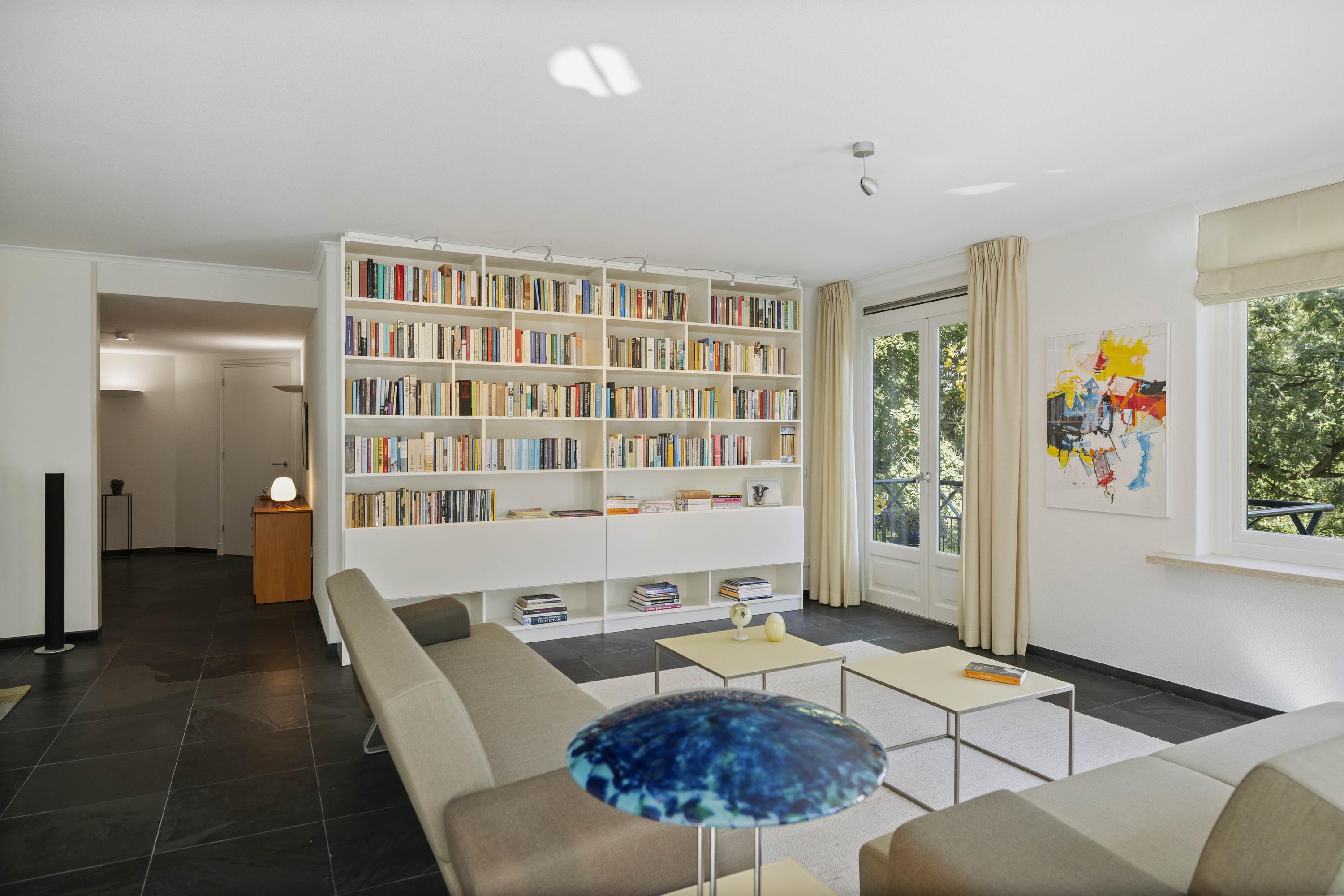 De riante woonkamer, met in het verlengde een ruime studeerkamer en-suite, biedt een prachtig uitzicht op het park en heeft openslaande deuren naar alle balkons.