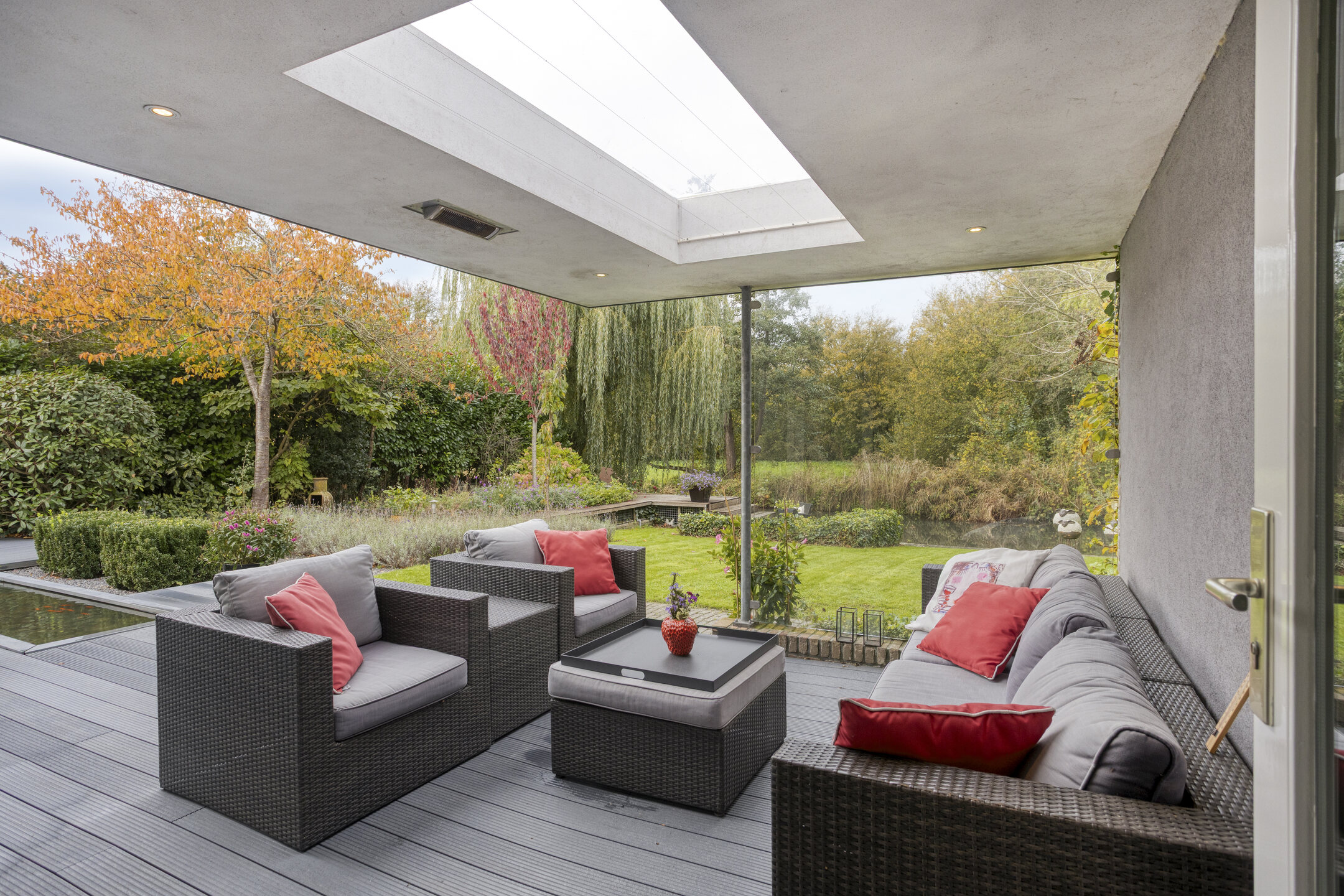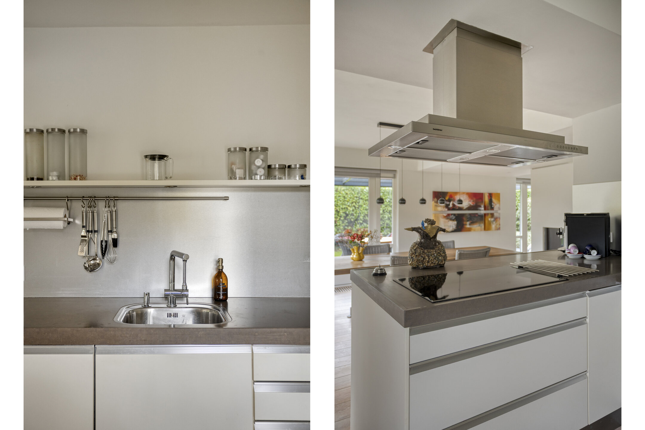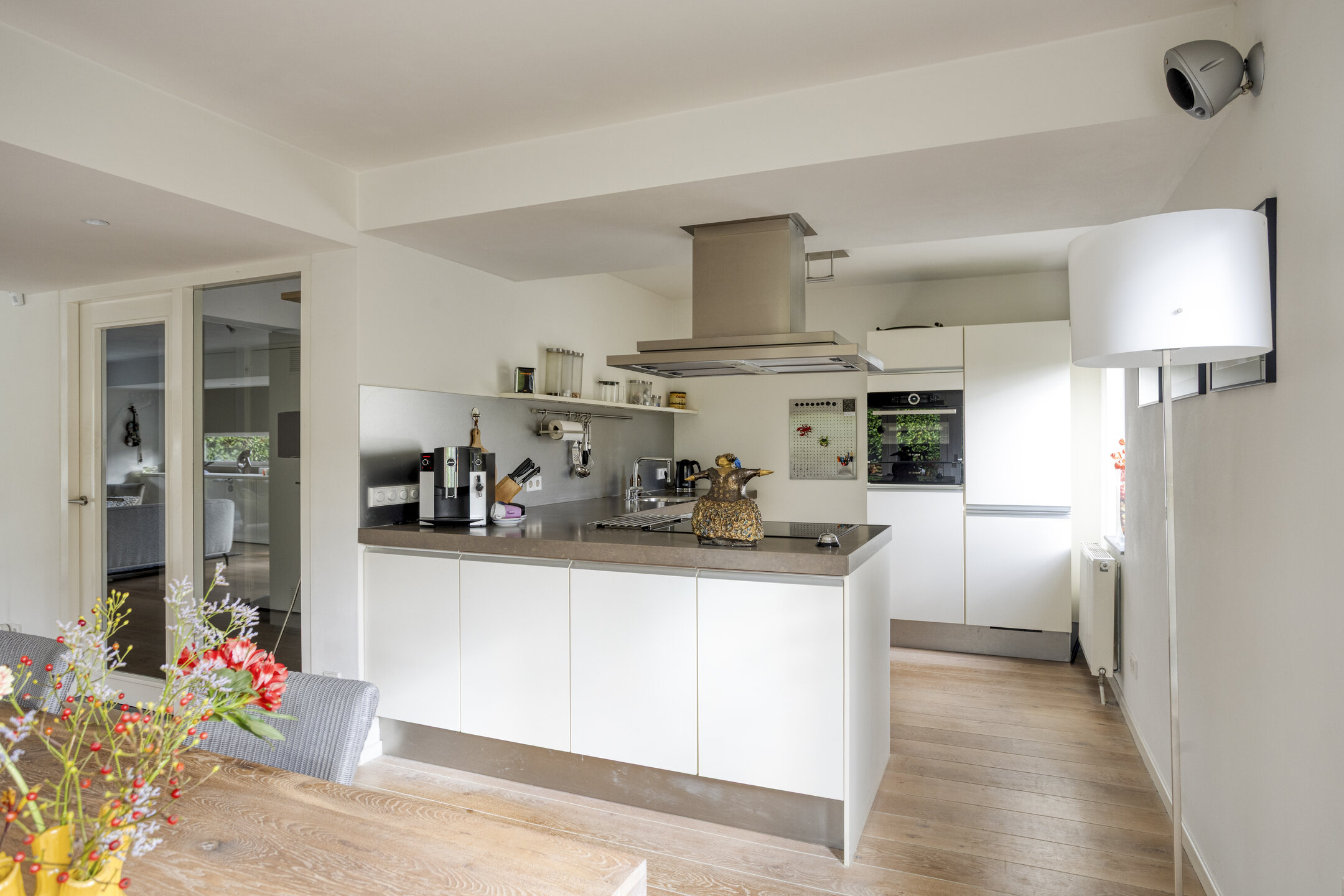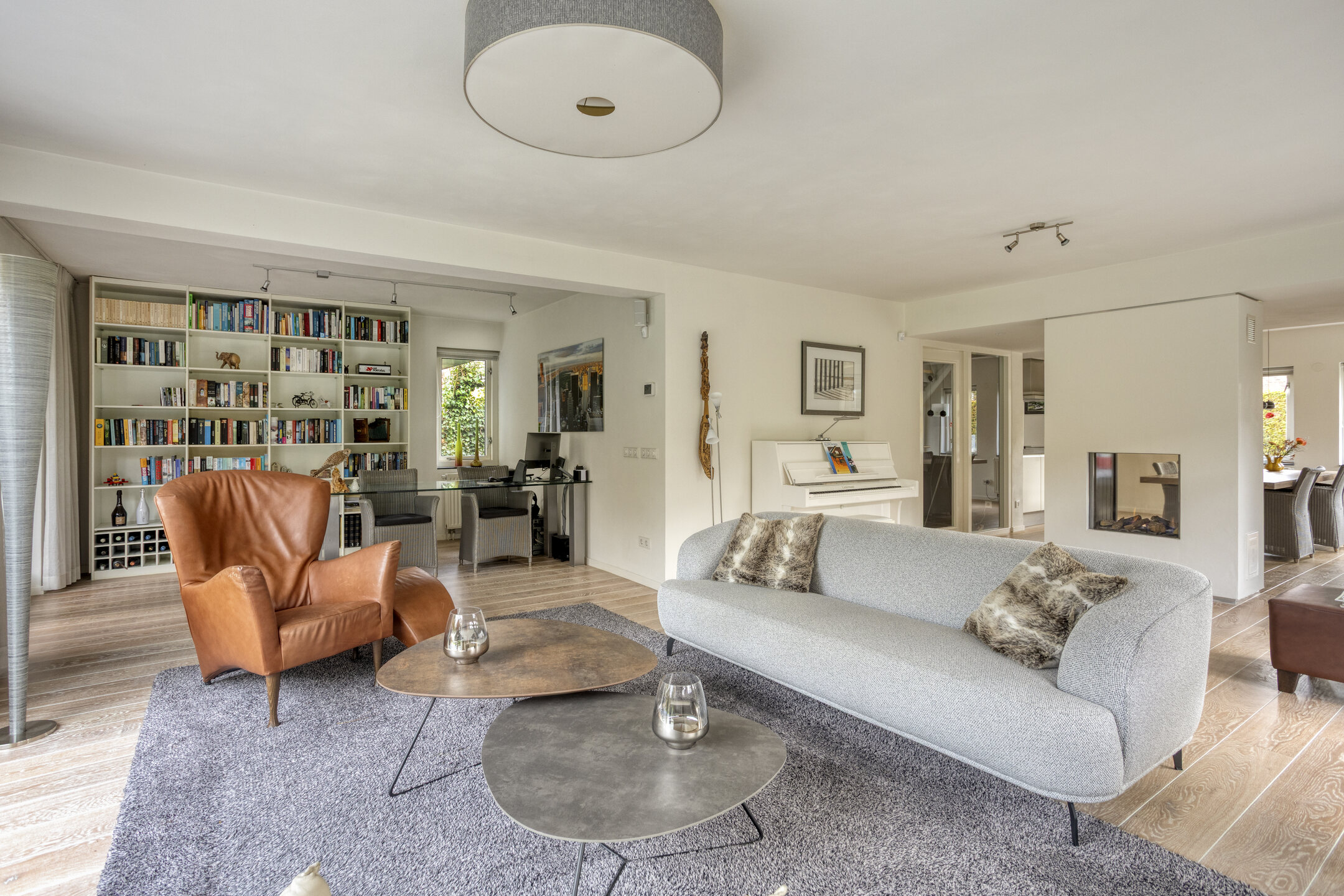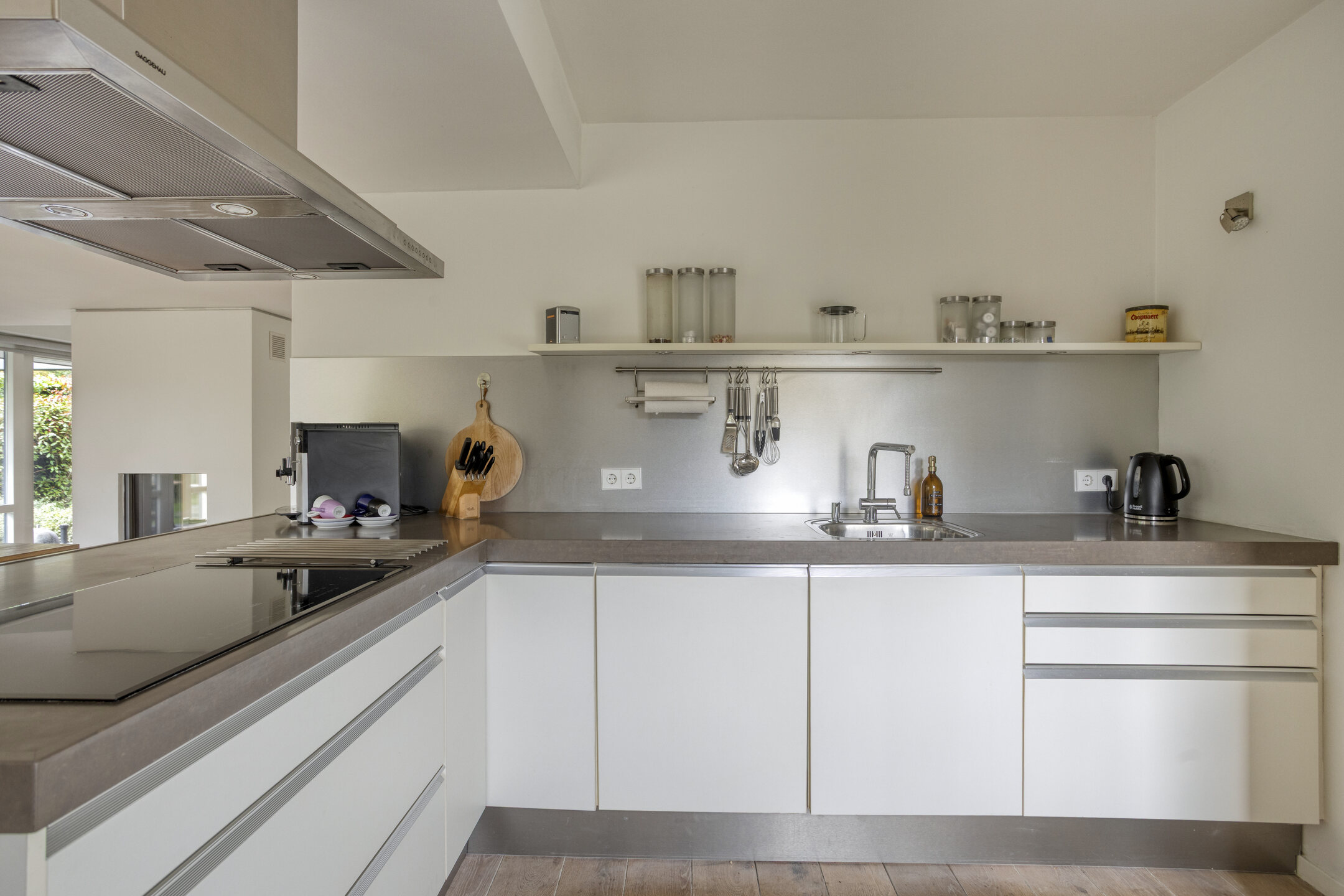 Просторный холл с дубовым полом и лаконичными стеклянными дверями встречает гостей при входе. Гостиная и кухня-столовая разделены двусторонним камином Bellfire, который придает пространству спокойное тепло. Роскошная кухня оснащена техникой премиального класса и рабочей поверхностью из бельгийского голубого камня, предлагая практичность и изысканный стиль для ежедневной жизни. Задний фасад с панорамным остеклением подчеркивает гармонию сада и живописный, охраняемый ландшафт Egmonderhout за его пределами.