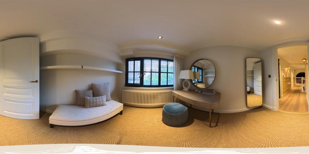 Вход через элегантный отдельный вход ведёт в изысканную кухню открытого плана с интегрированной техникой, зона отдыха оформлена вокруг газового камина, а переменная высота потолков создаёт динамичное ощущение пространства. Между кухней и гостиной предусмотрены кабинет и просторный гостевой туалет, что отражает продуманность дизайна. Гостевые апартаменты с отдельным входом, дополнительной кухней, ванной комнатой и прачечной обеспечивают приватность для гостей или персонала.