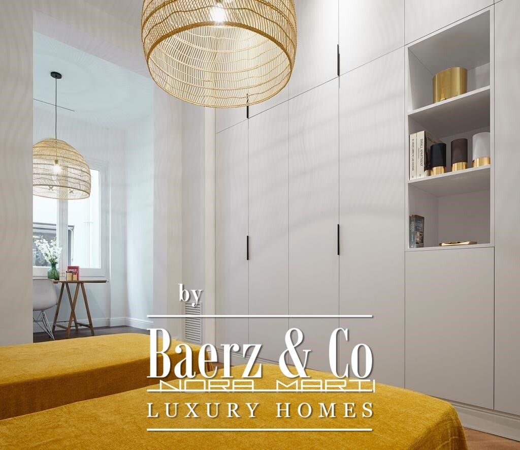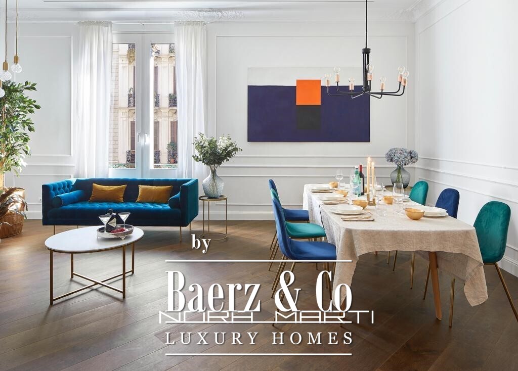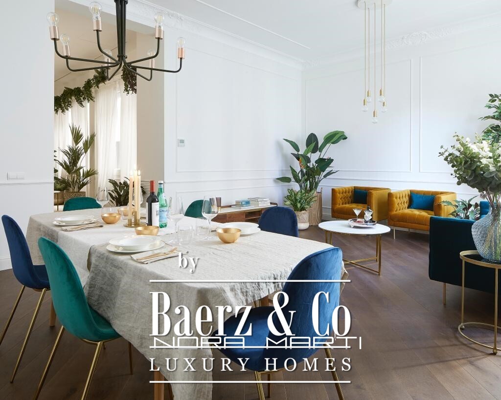 Центром квартиры является обширная гостиная с зоной столовой, выделяющаяся высокими потолками и оригинальной лепниной. Тщательно подобранная мебель и яркие акценты отражают художественное наследие Барселоны, а материалы высокого качества придают пространству тепло и элегантность. Полностью оборудованная кухня и санузлы с качественной отделкой подчеркивают стремление к ежедневному комфорту и спокойной роскоши.