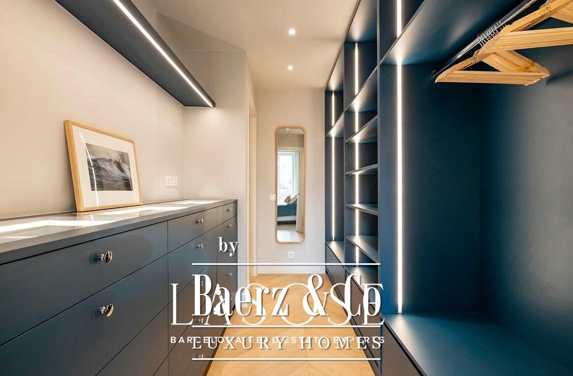 На нижнем уровне три спальни с выходом на балкон площадью 18 м², что позволяет наполнять ночную зону естественным светом. В главной спальне предусмотрена гардеробная и ванная комната en suite, а две дополнительные спальни пользуются стильной общей ванной. На обеих уровнях оборудованы независимые входы, что подчеркивает деликатность и гибкость планировки.