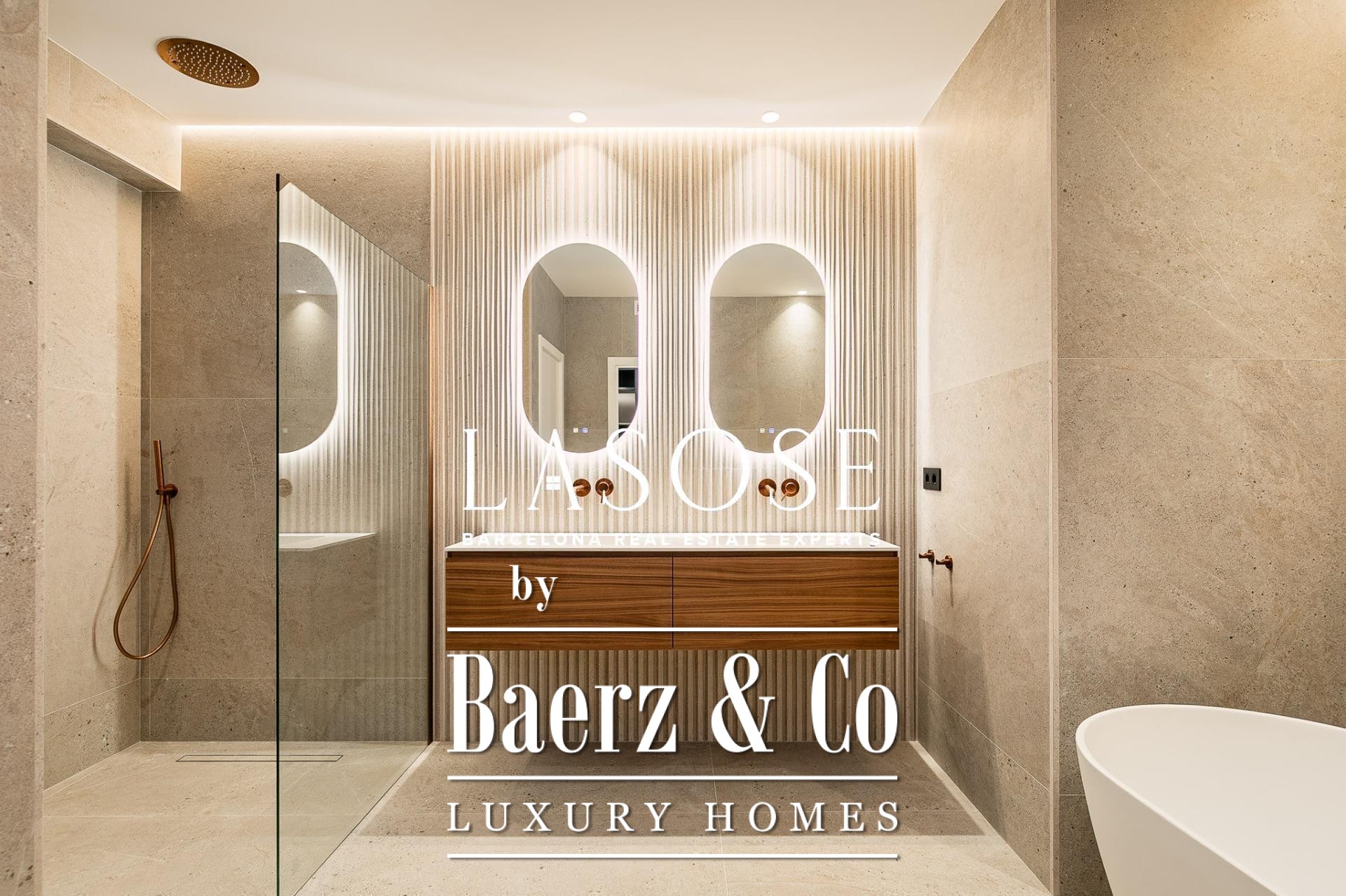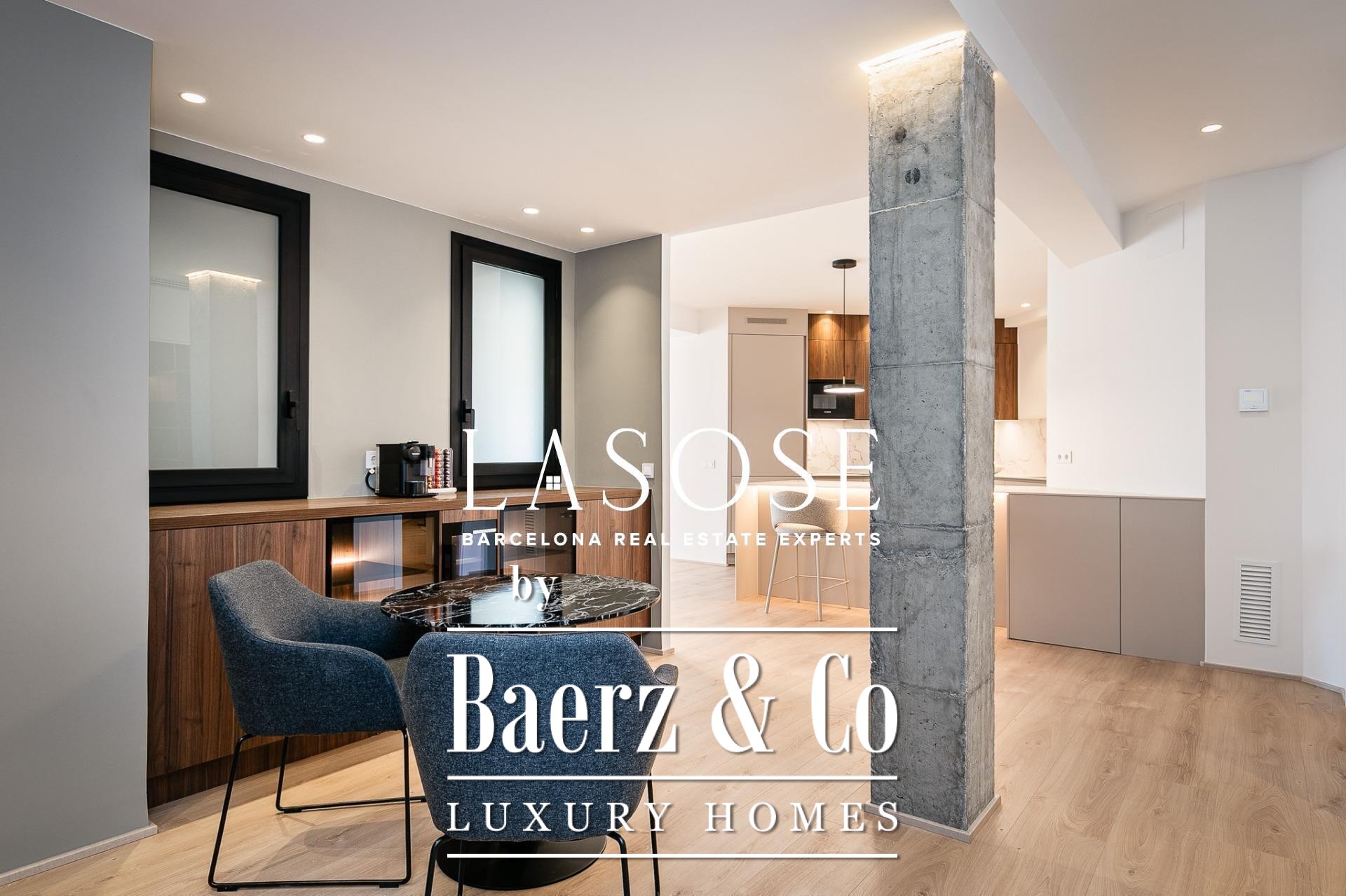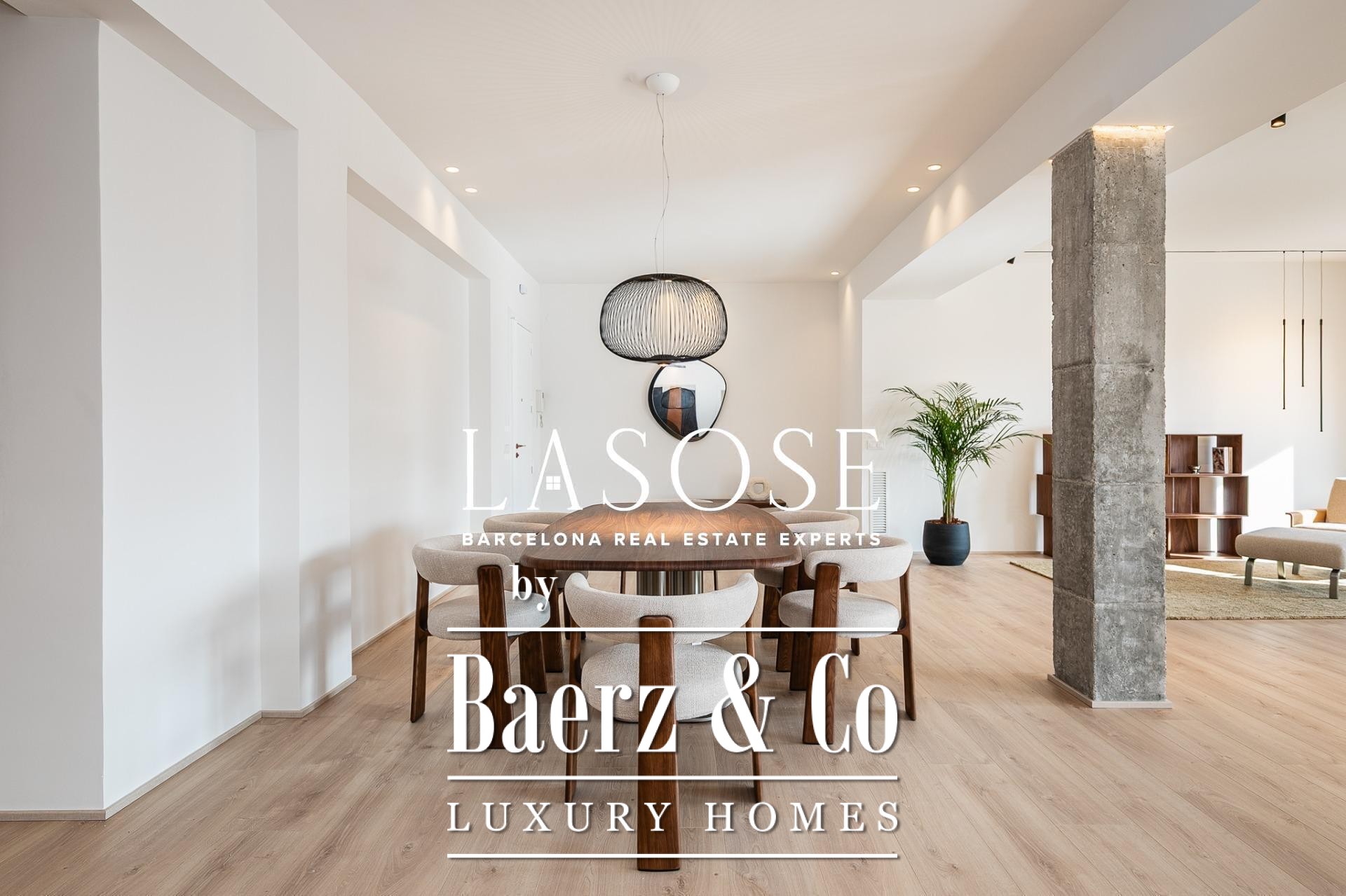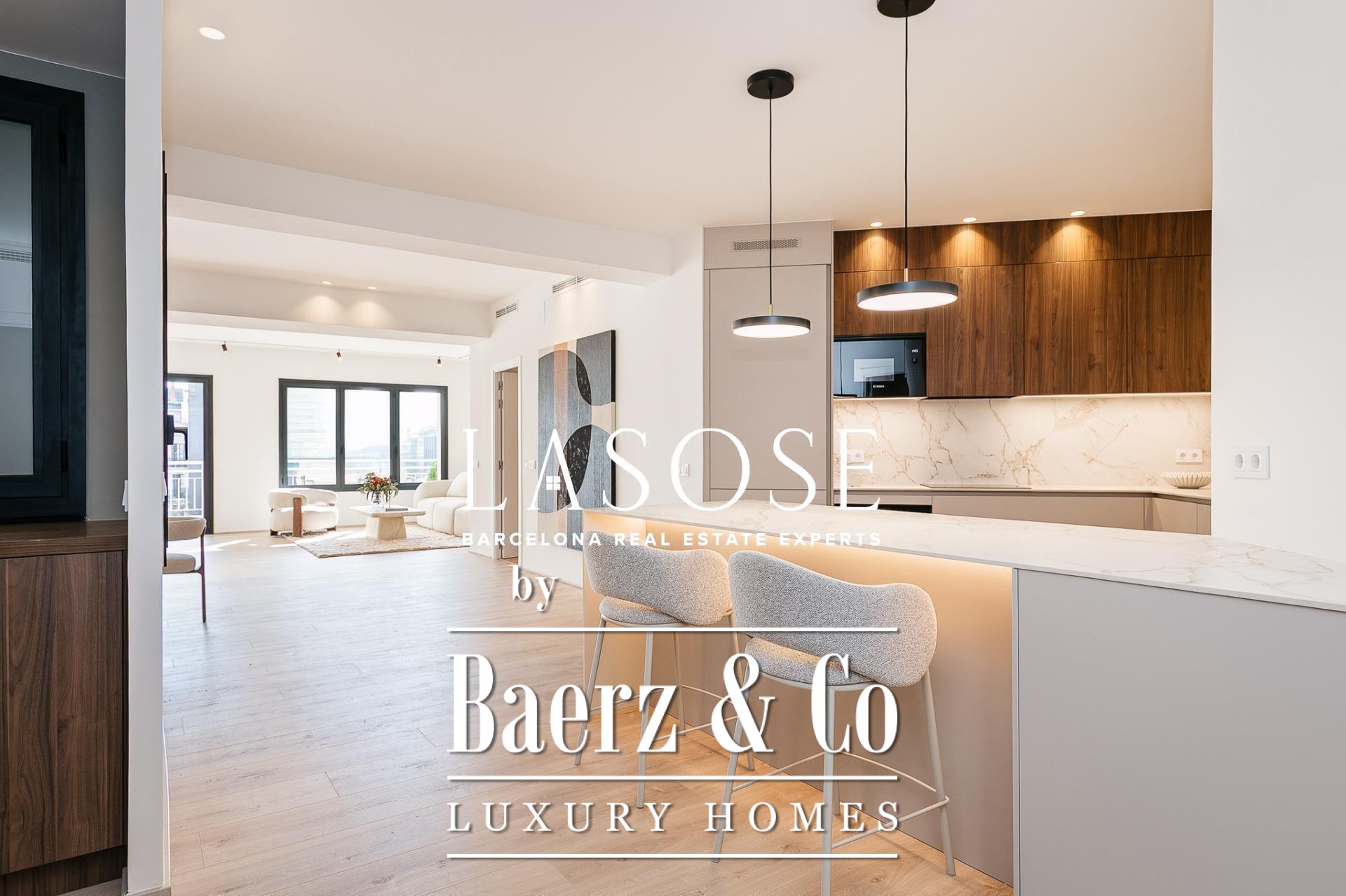 Апартаменты полностью отреставрированы с использованием премиальных материалов. Естественный свет проникает сквозь широкие окна, выходящие на юго-восток, наполняя интерьер светом и выделяя просторную открытую зону гостиной-столовой площадью 90 м². Отсюда двери ведут на угловую панорамную террасу с видом на зелёные бульвары и Plaça Mossèn Jacint Verdaguer. Кухня Santos, оснащённая техникой Bosch, сконцентрирована вокруг острова с интегрированным винным шкафом и кофейной зоной, которую дополняет кладовая для скрытого хранения.