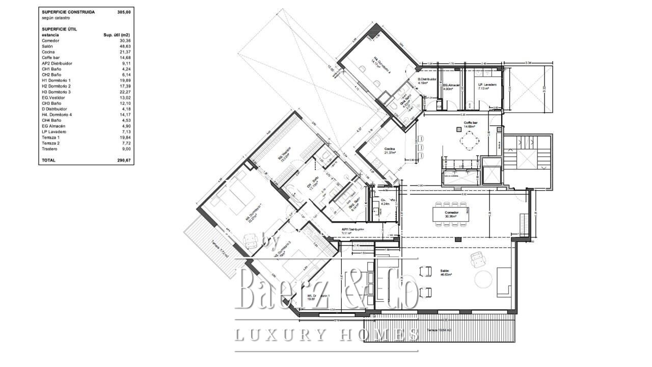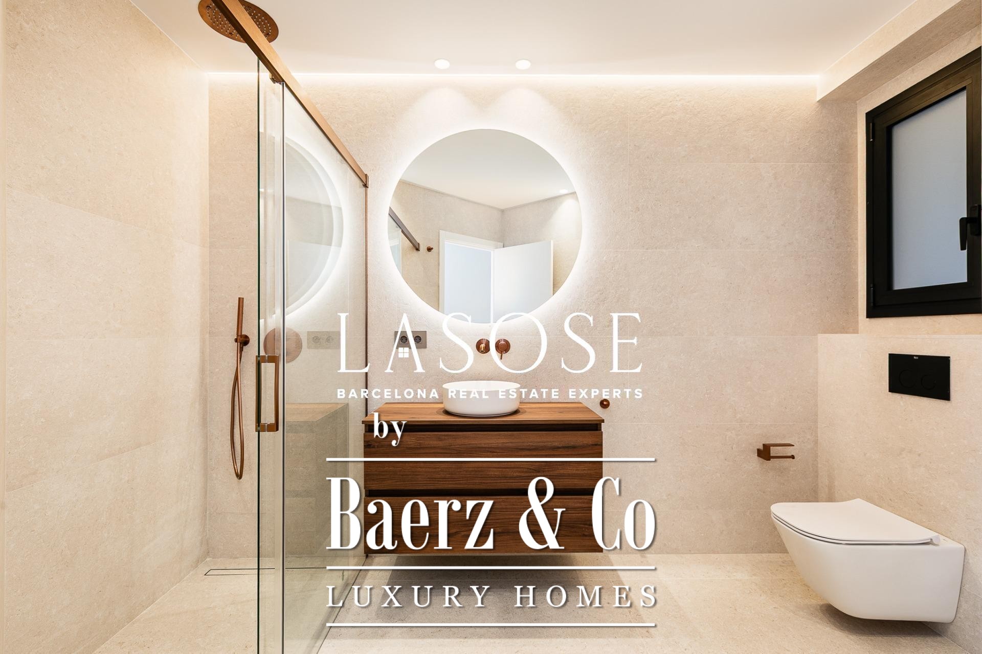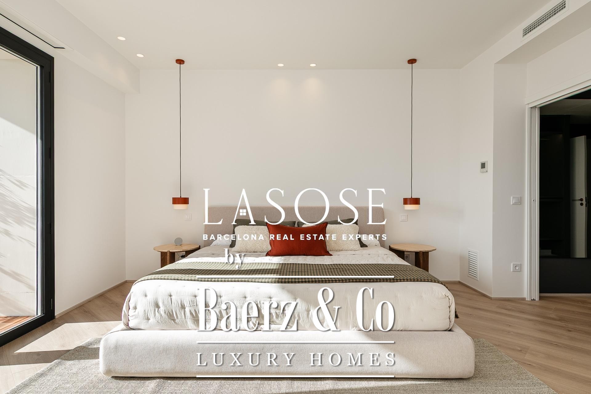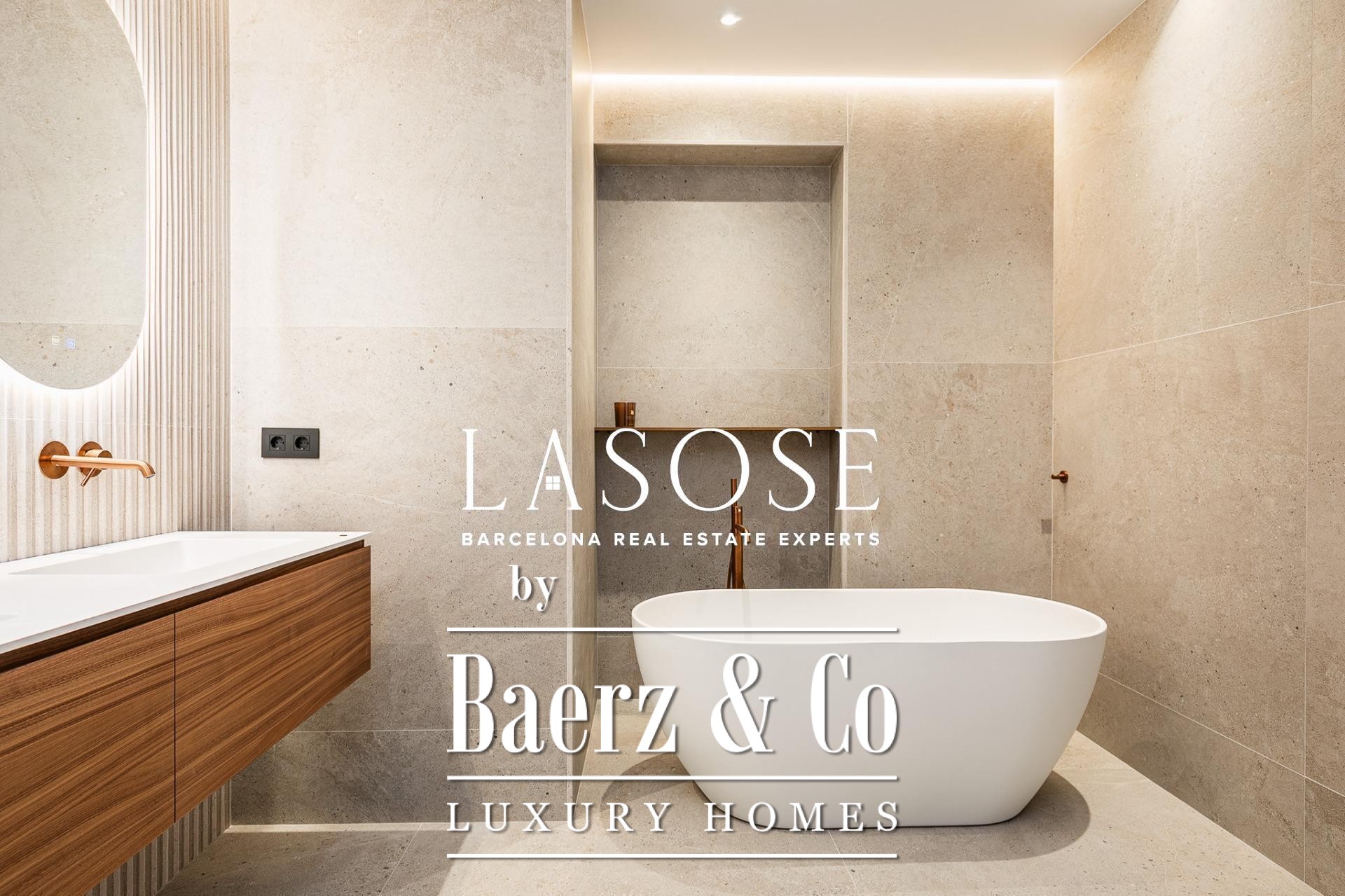 Апартаменты полностью отреставрированы с использованием премиальных материалов. Естественный свет проникает сквозь широкие окна, выходящие на юго-восток, наполняя интерьер светом и выделяя просторную открытую зону гостиной-столовой площадью 90 м². Отсюда двери ведут на угловую панорамную террасу с видом на зелёные бульвары и Plaça Mossèn Jacint Verdaguer. Кухня Santos, оснащённая техникой Bosch, сконцентрирована вокруг острова с интегрированным винным шкафом и кофейной зоной, которую дополняет кладовая для скрытого хранения.
