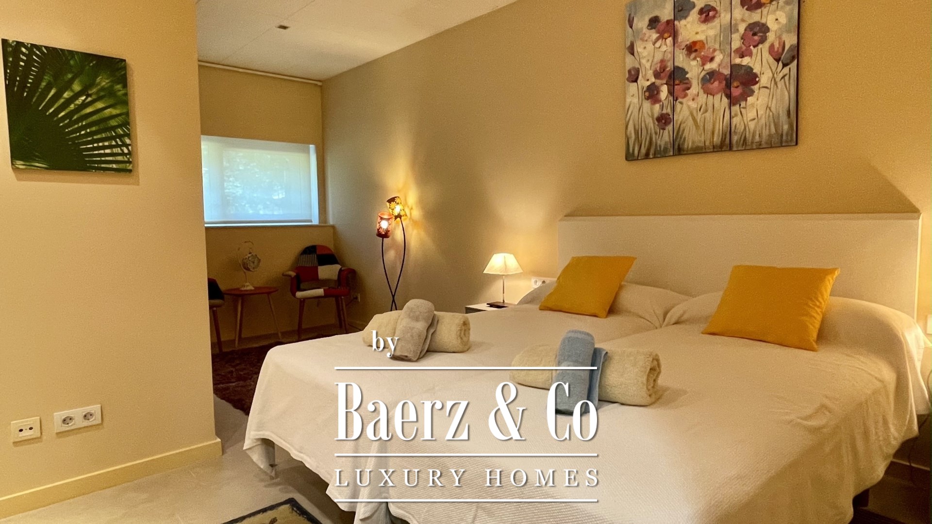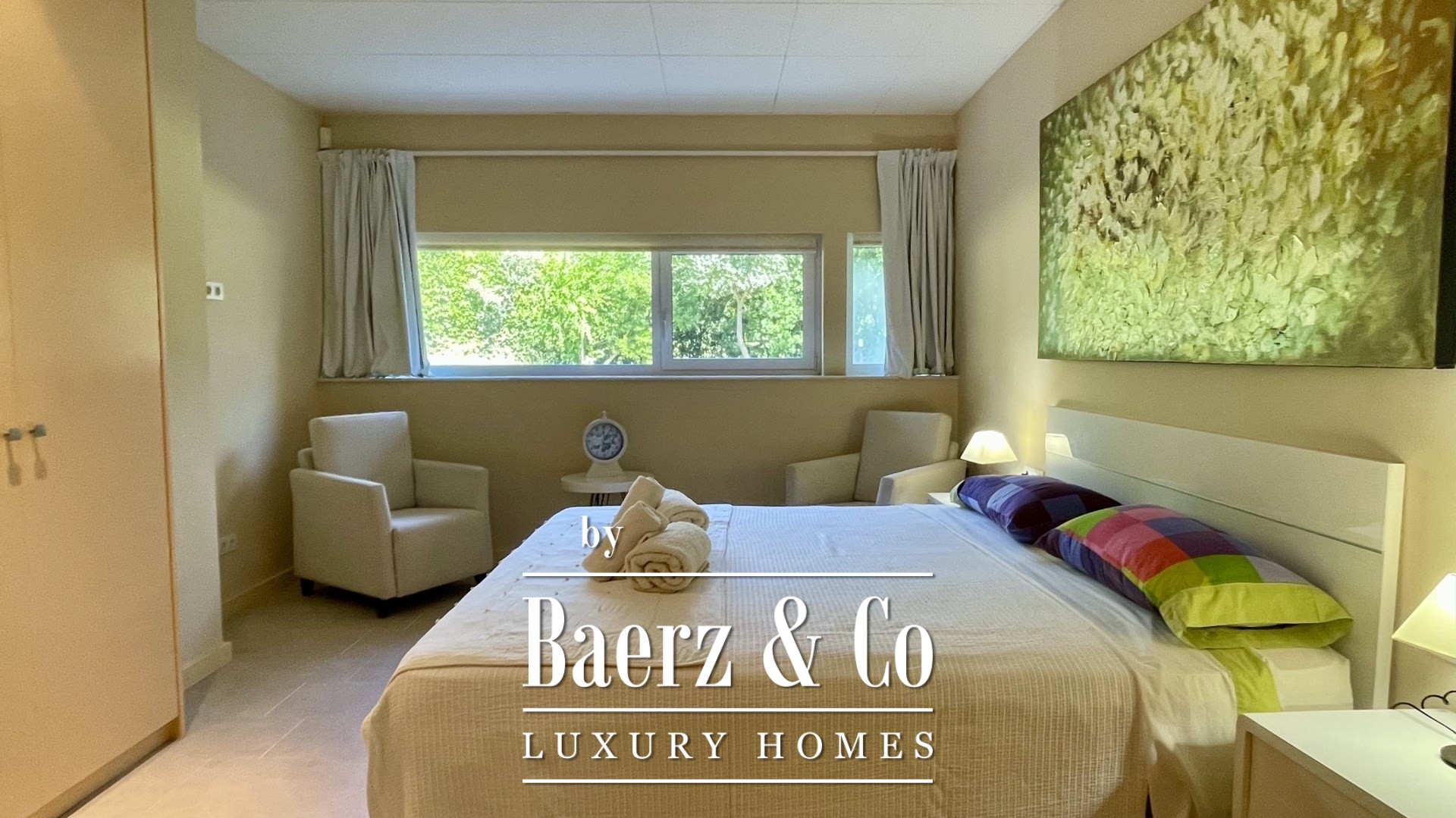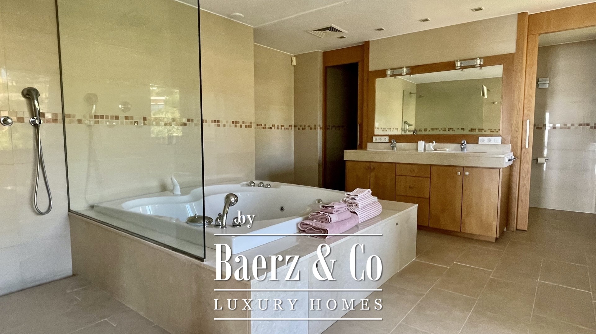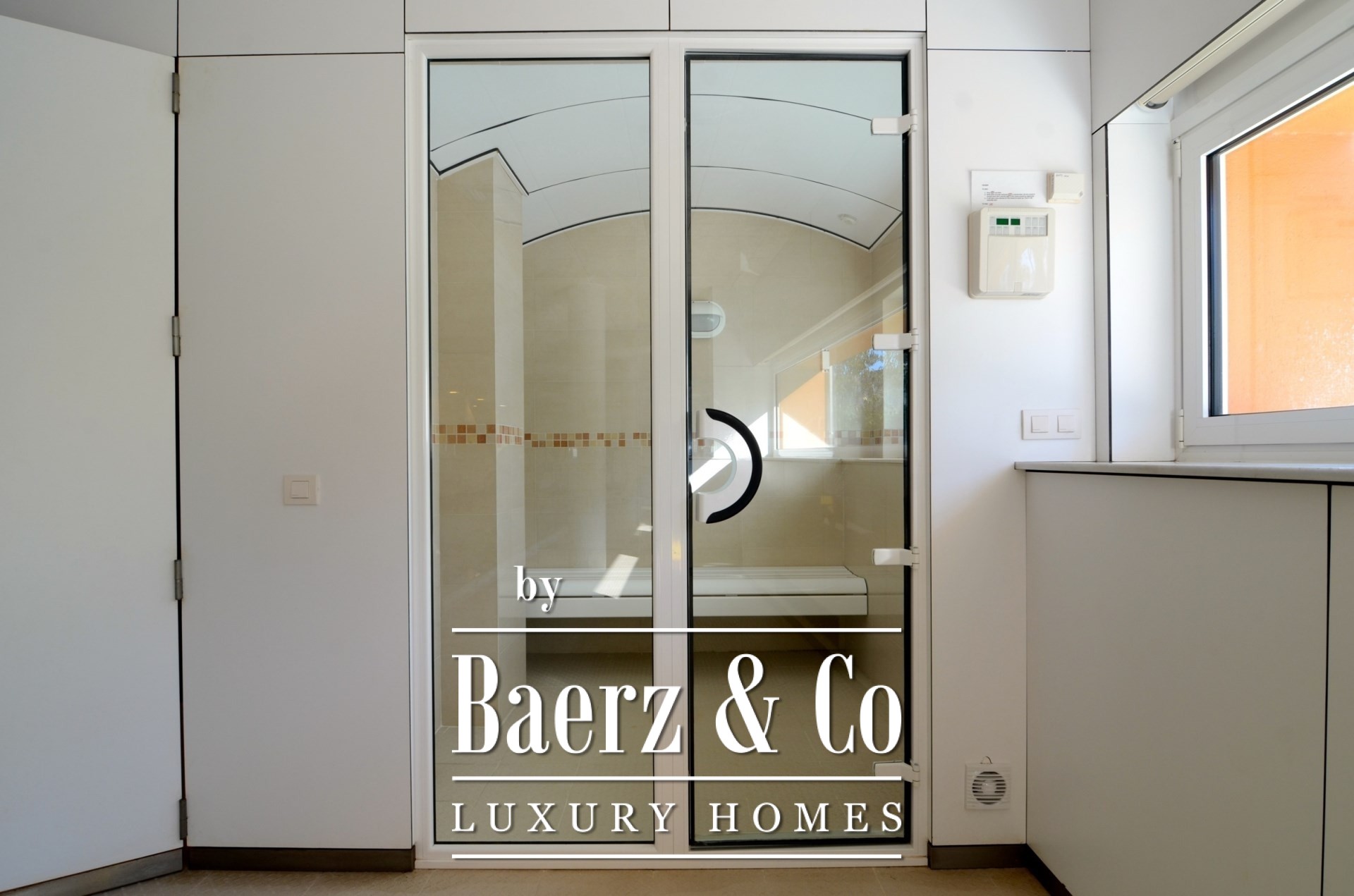 Главный люкс занимает почти 70 м², располагает видом на море, собственным выходом на частную террасу, оборудованной гардеробной и санузлом с джакузи, душем-«walk-in» и двумя туалетами. Две дополнительные спальни с ванными комнатами имеют непосредственный выход в ухоженные сады, а отдельный кабинет с массивными книжными полками и журчанием фонтана создает атмосферу спокойствия. Каждое помещение органично связано с внешним пространством, что подчеркивает уникальную связь виллы с окружающей средиземноморской природой.