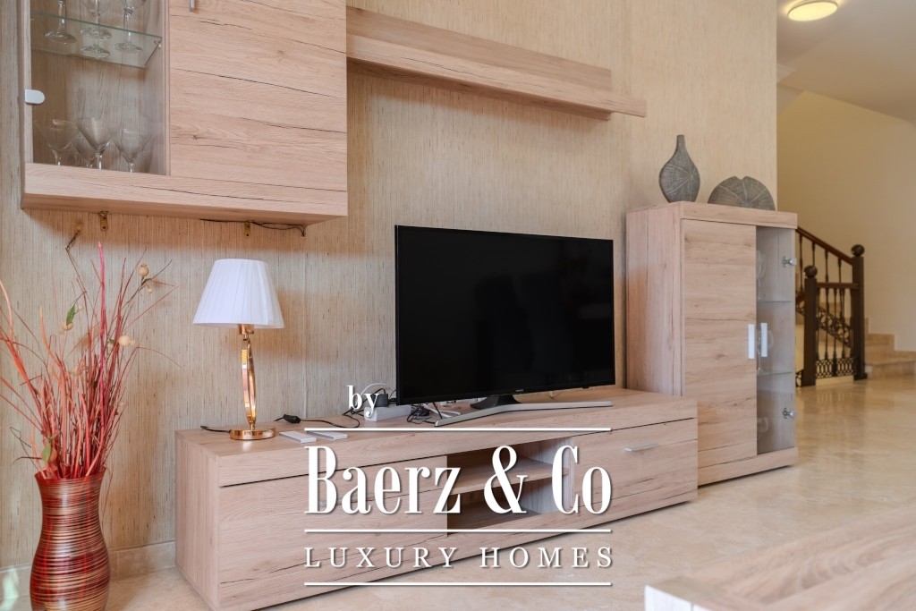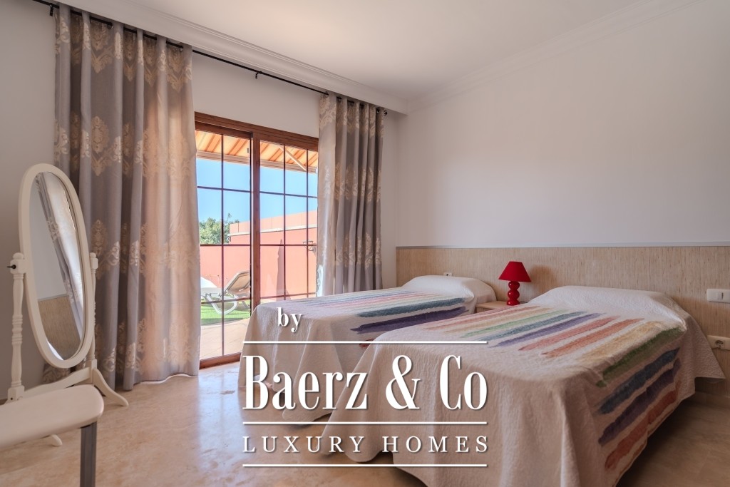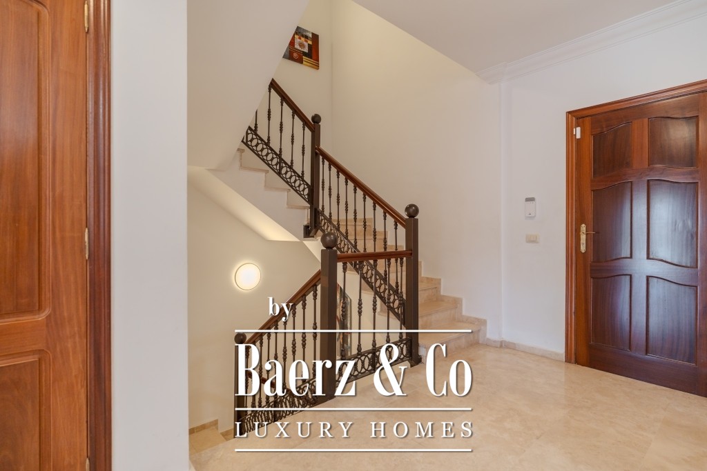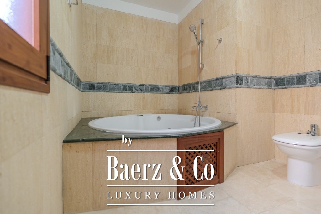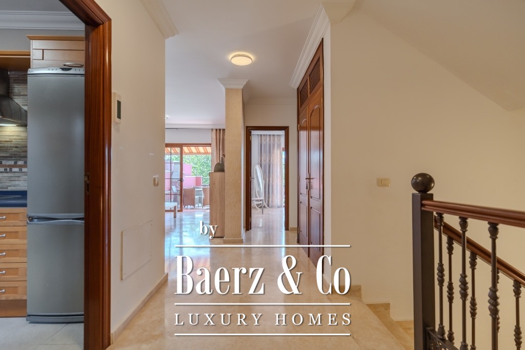 На первом этаже располагается приветливый холл с встроенными шкафами, отдельная кухня с прачечной и зона гостиной-столовой. Спальня и ванная комната завершают планировку этажа, обеспечивая прямой выход на солнечную террасу, оформленную вокруг частного бассейна и зоны для барбекю с видом на зелёные насаждения. На втором этаже находятся ещё две спальни, каждая со встроенными шкафами и своей уникальной панорамой: одна выходит на террасу с видом на парк и отдалённое море, другая—на небольшой балкон с видом на сад. Два санузла, один из них с ванной комнатой en suite, а также вместительные шкафы на коридоре обслуживают верхний уровень.