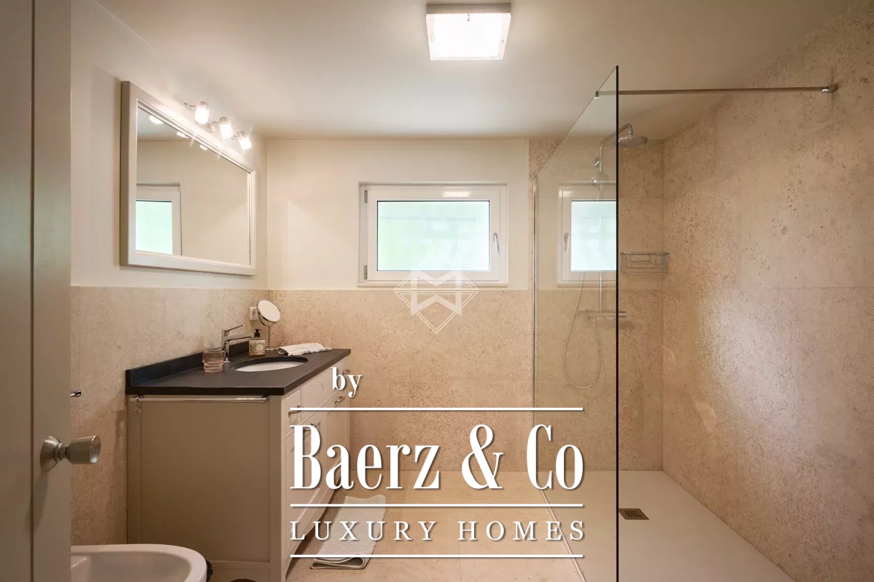 На участке площадью 1 700 м², окружённом средиземноморской растительностью и сохраняющем приватность, в центре расположен бассейн 11 на 4 метра, окружённый деревянными террасами как на солнце, так и в тени, что позволяет наслаждаться уединённым отдыхом на свежем воздухе. Во всех деталях предусмотрены безопасность и комфорт — закрытый гараж, навес для автомобиля, система видеонаблюдения, обратимый кондиционер, двухкамерные стеклопакеты, оптоволоконный интернет, автоматизированная система управления бассейном и поливом.